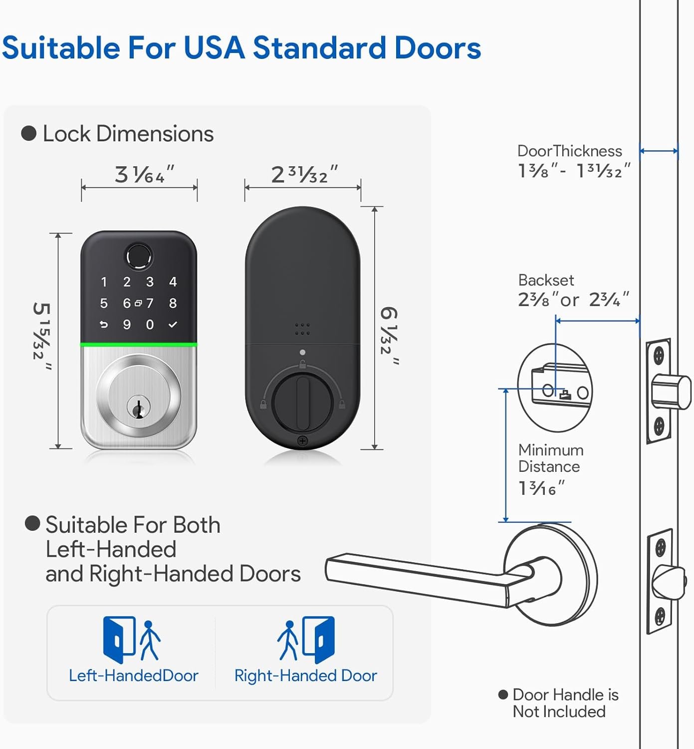 【Easy DIY Installation】Even if you are not a handyman, you can finish the installation in just a few minutes. DIY installation is made easy with just a screwdriver. Plus, there is no need to drill any extra holes on the door. The smart lock is designed to fit into USA standard doors.