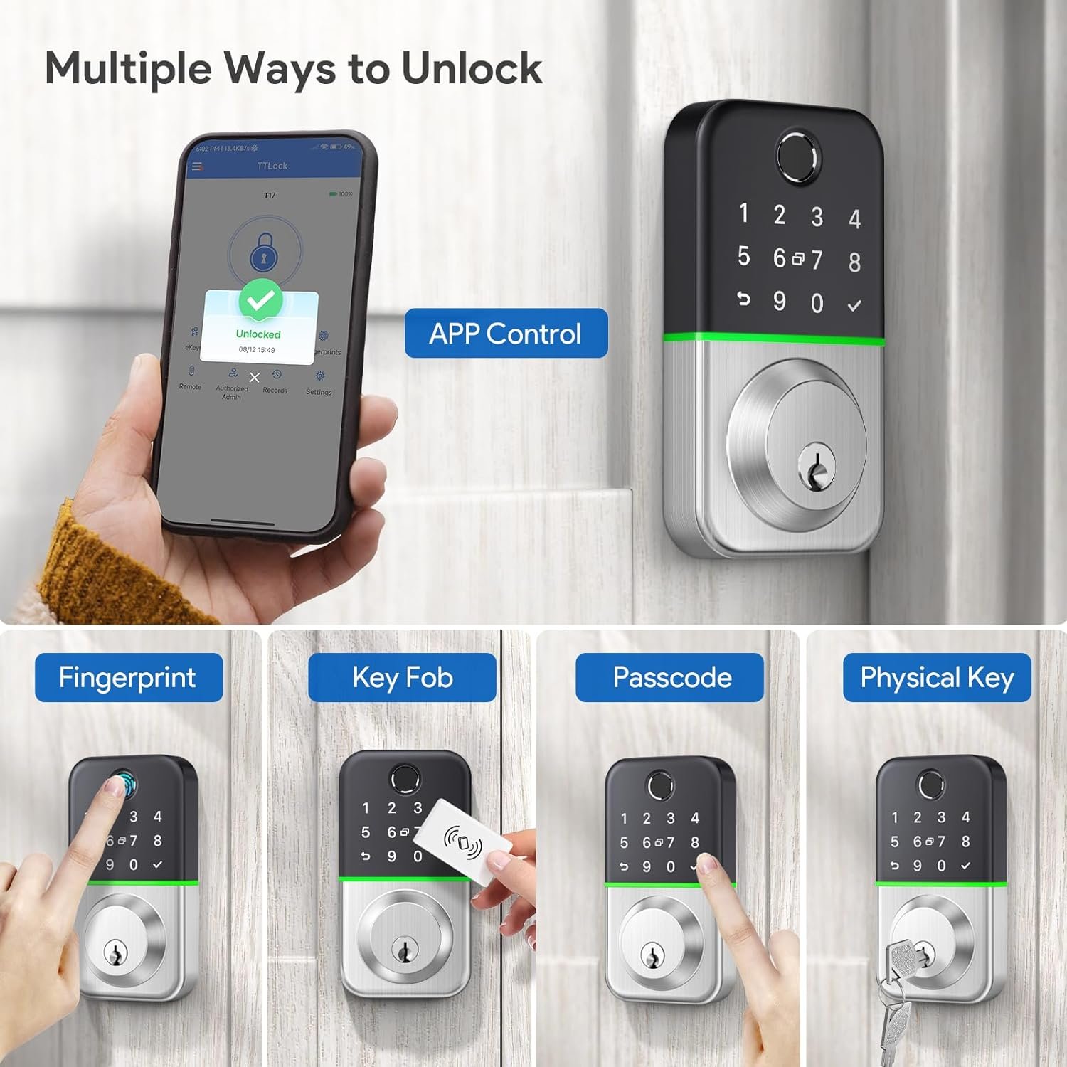 【Multiple Ways of Keyless Entry】WiseGear’s keyless entry door lock deadbolt with handle set offers various options for unlocking: full APP control, Bluetooth, fingerprint, passcode, key fobs, mechanical keys, and WiFi (G2 WiFi Gateway required). Experience and enjoy the convenience with our smart door lock.