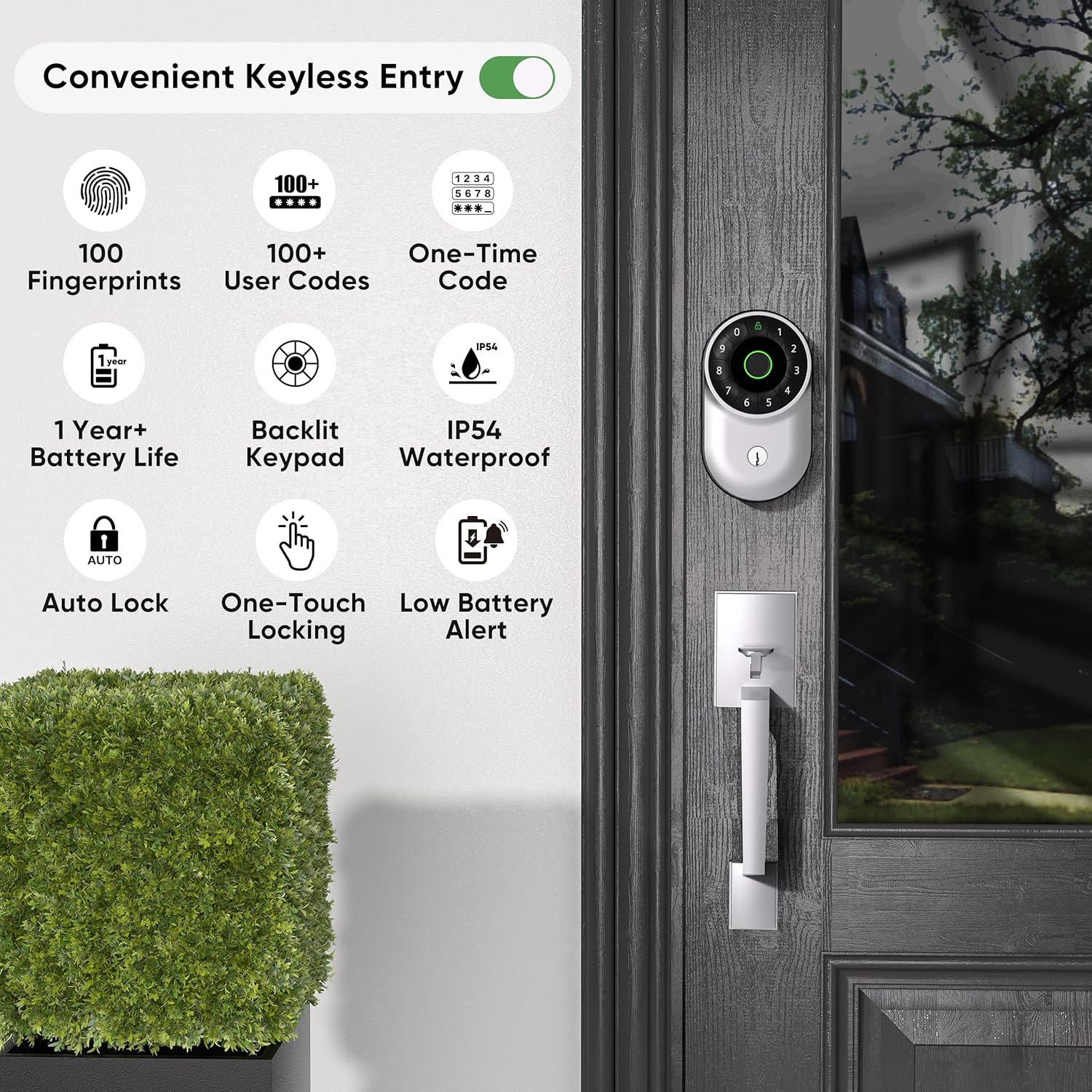 Convenient Keyless Entry: Supports storage of up to 100 fingerprints and 100 user codes; up to 1-year battery life with low battery alert; upgraded backlit keypad with IP54 waterproof rating; customizable automatic door locking as you leave; one-touch keypad locking from outside; includes 2 keys for key unlocking.