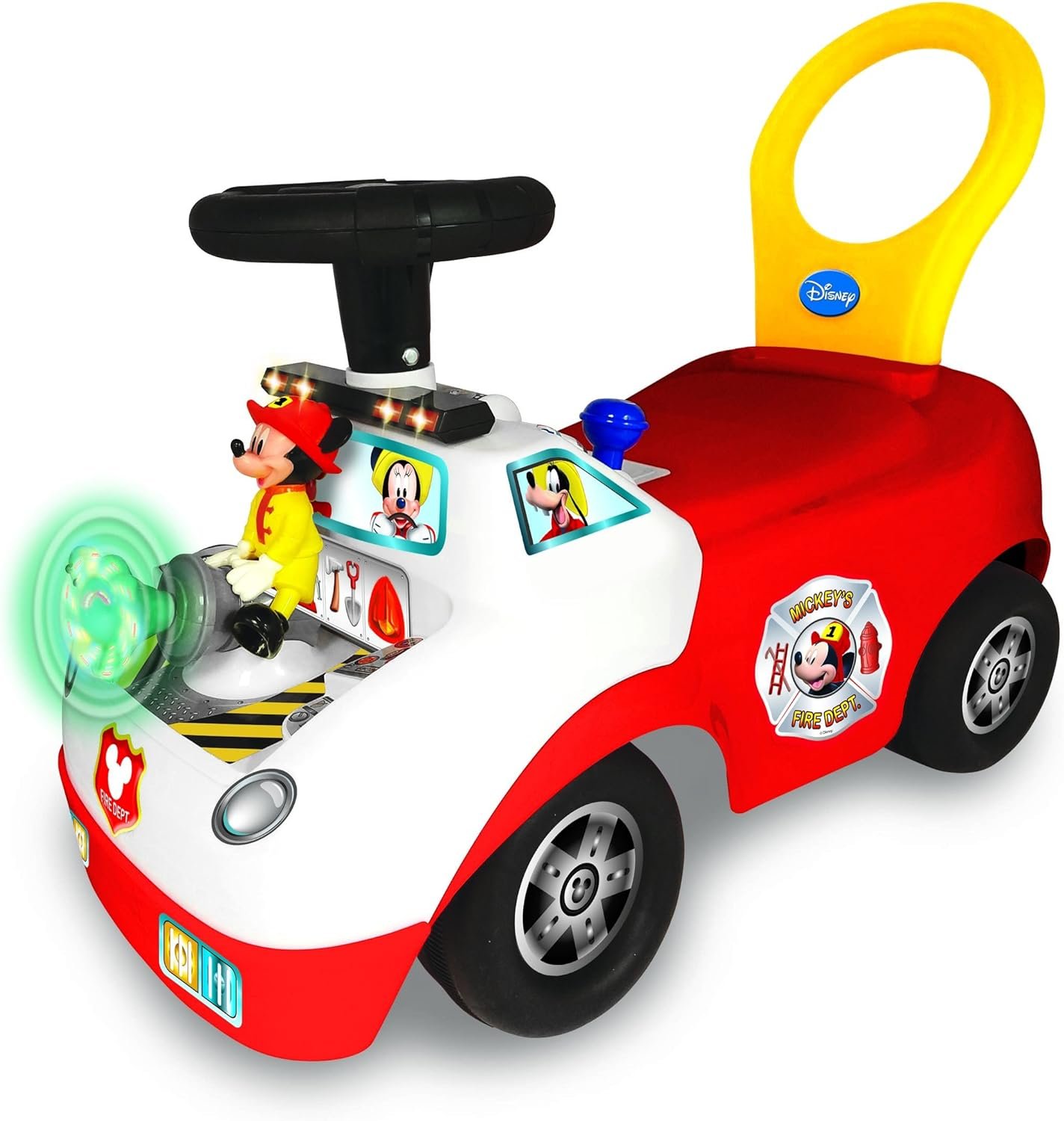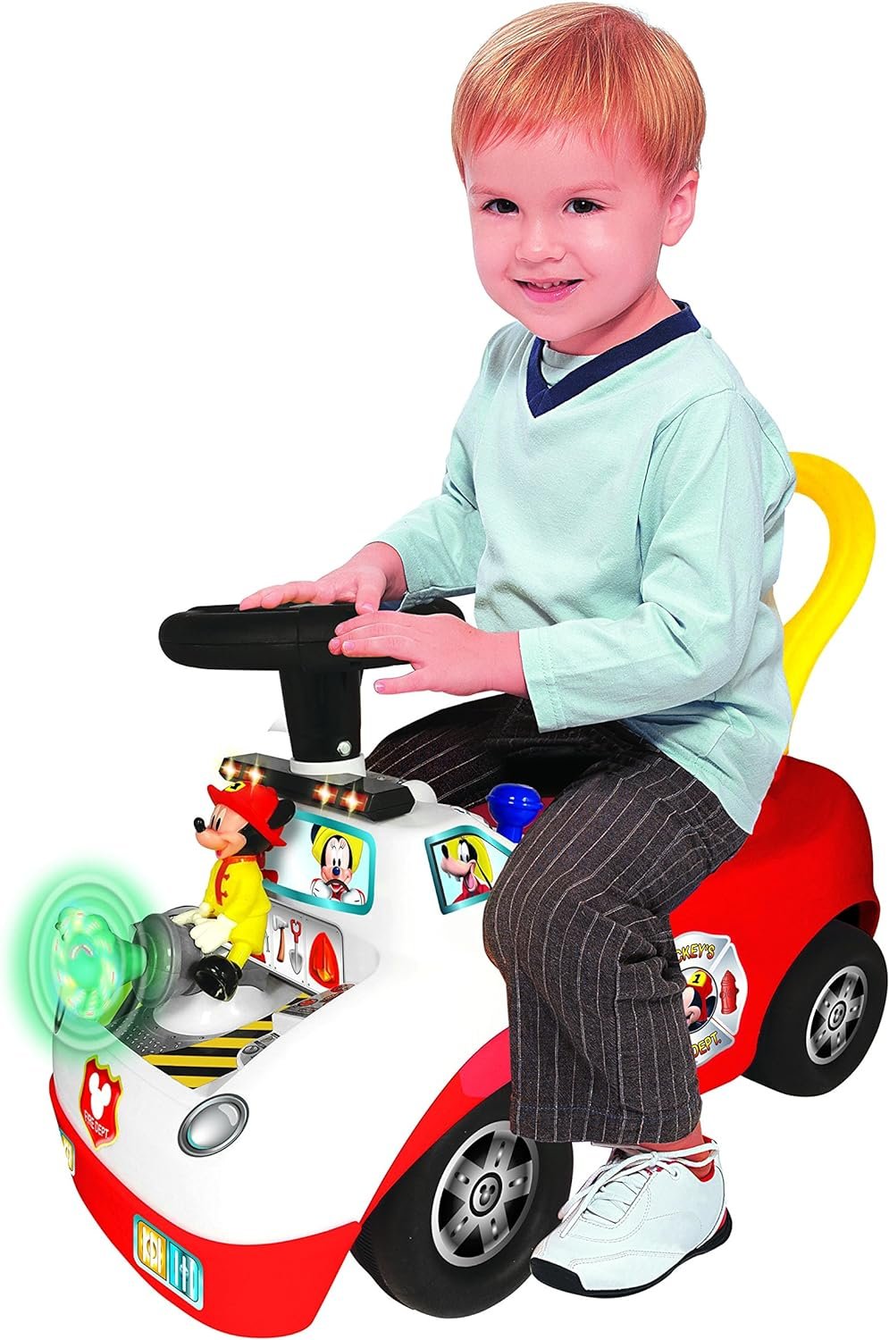 See changing light patterns on Mickey’s fire-hose! press key and slide gears for revving engine and realistic siren. Includes a variety of electronic activities to play fun sounds and music. Safe and durable construction for hours of riding fun.