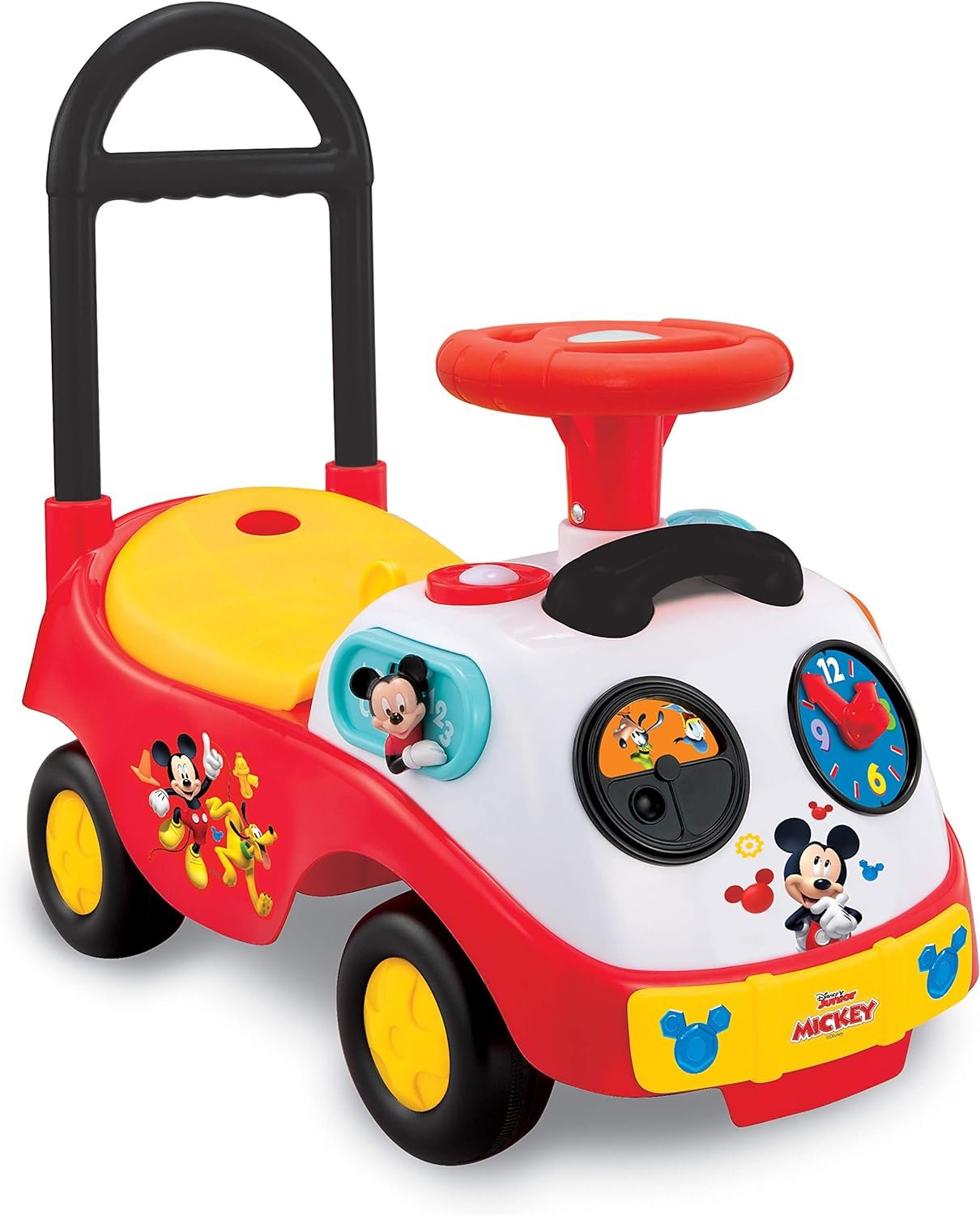 Features: Ride-on plays fun sounds and has flashing lights! Silde Mickey & turn dial for rewarding sounds. Turn peek-a-boo window or turn hands on clock to learn to read time. Tumble roller with cute images & see blinking signal lights. Honk horn & steer wheel for real driving fun.