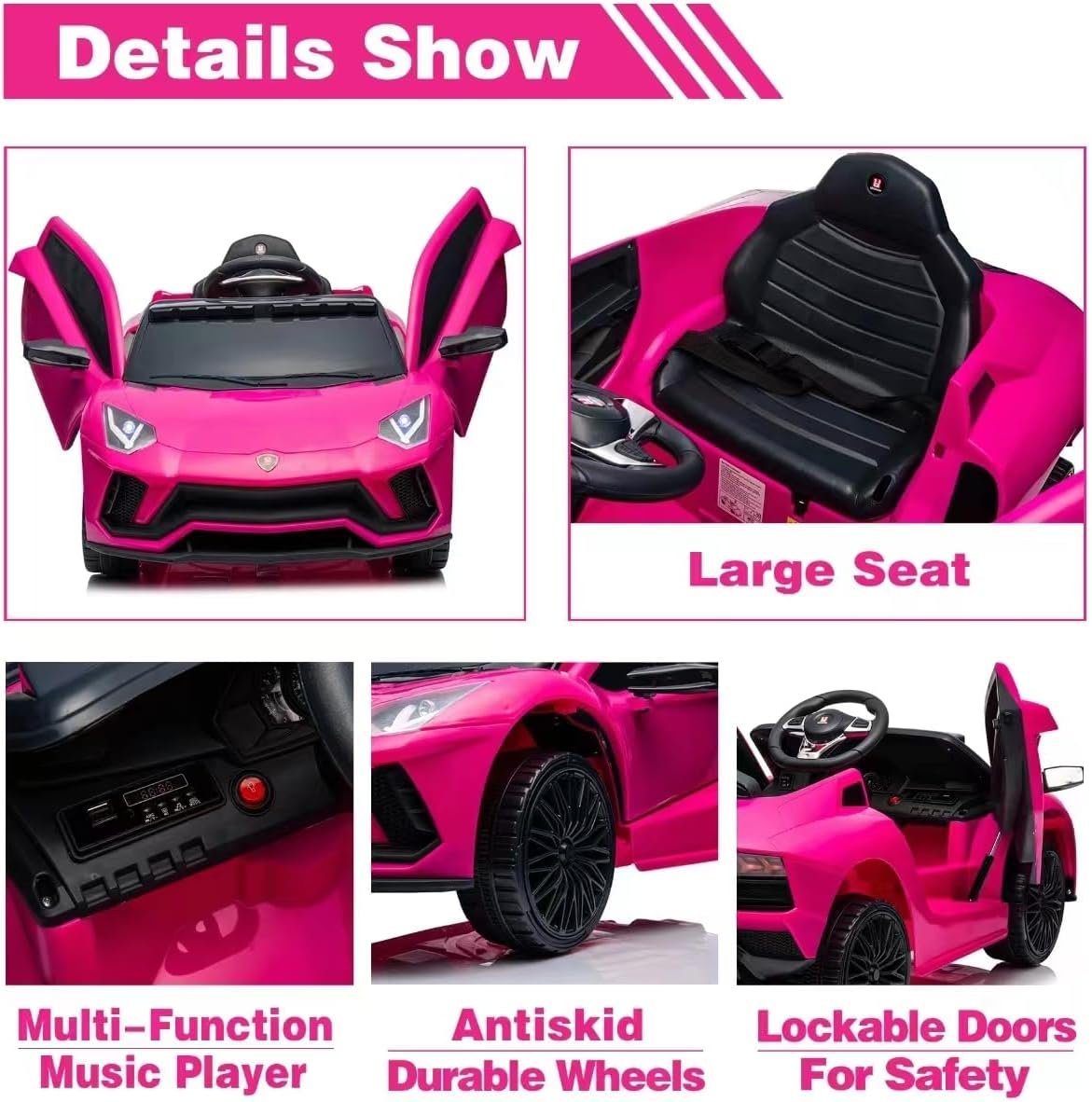 This Ride-on car comes with working vertical Pneumatic doors, with safety lock.