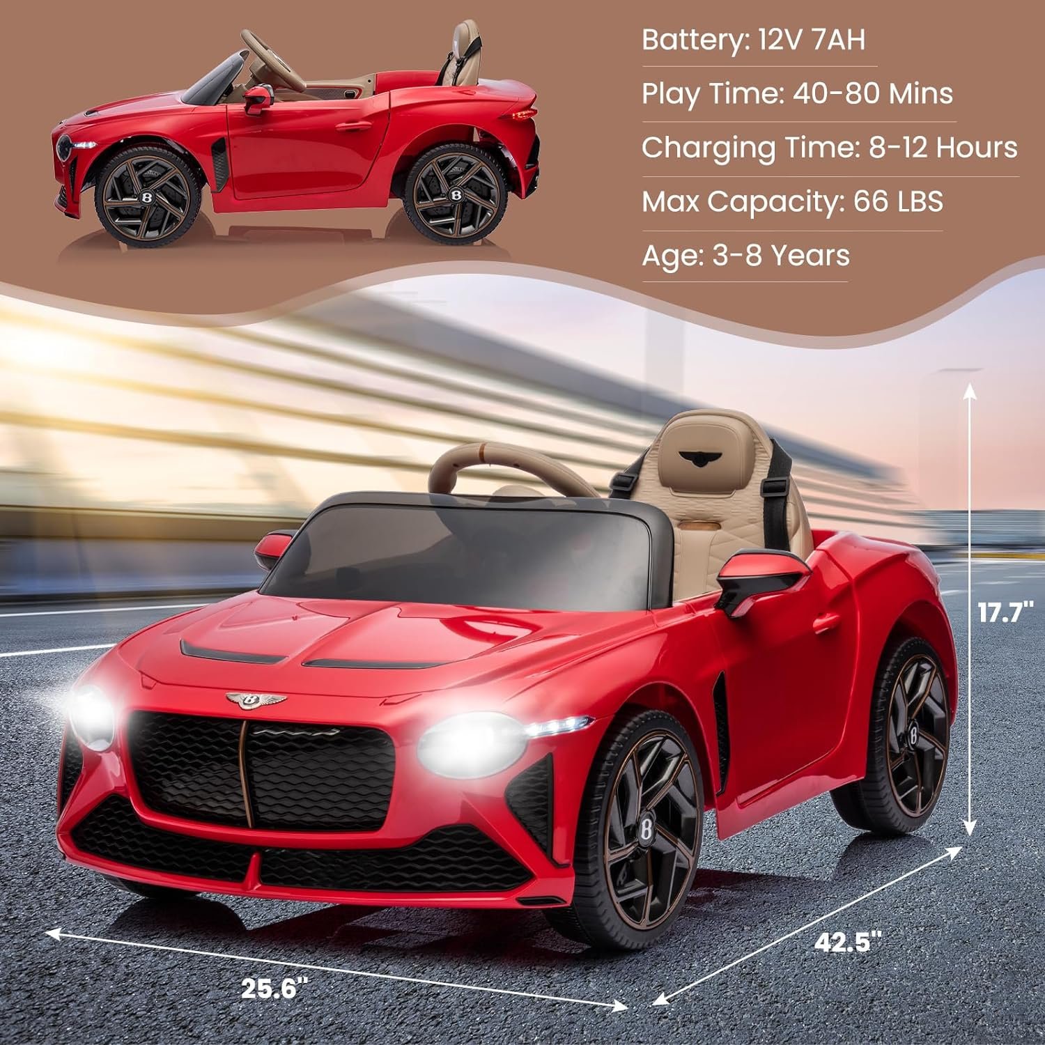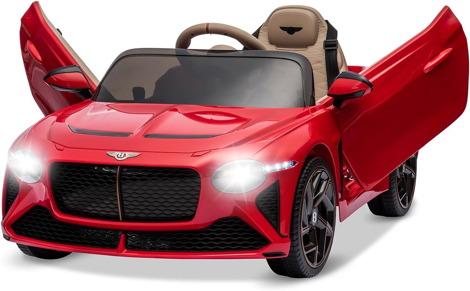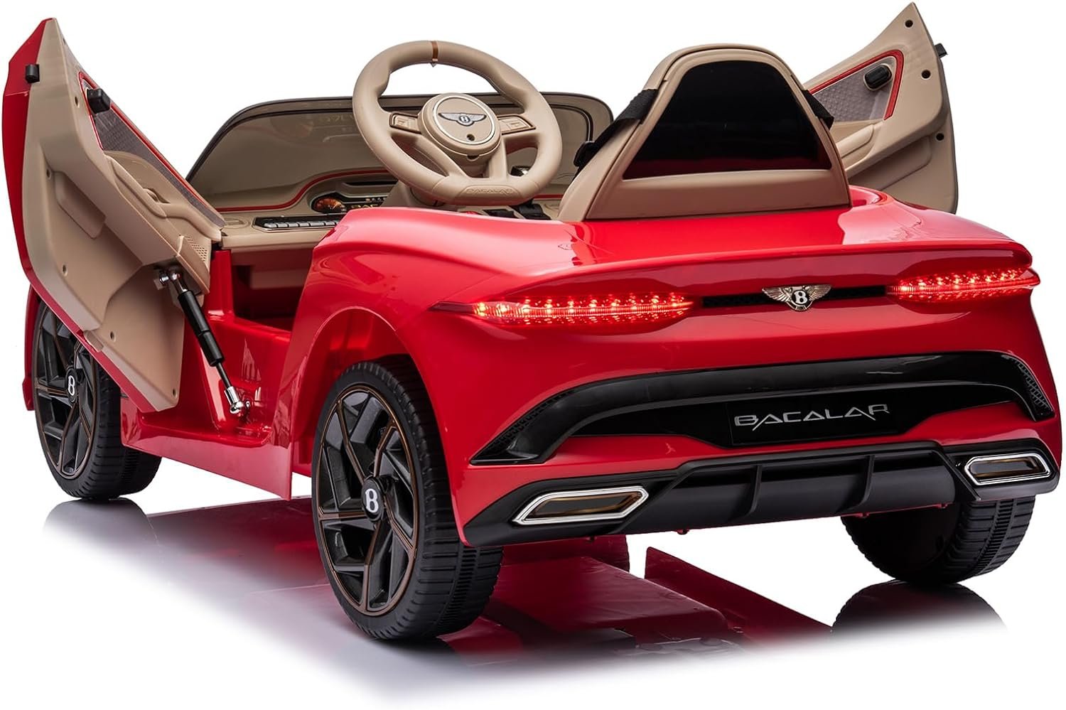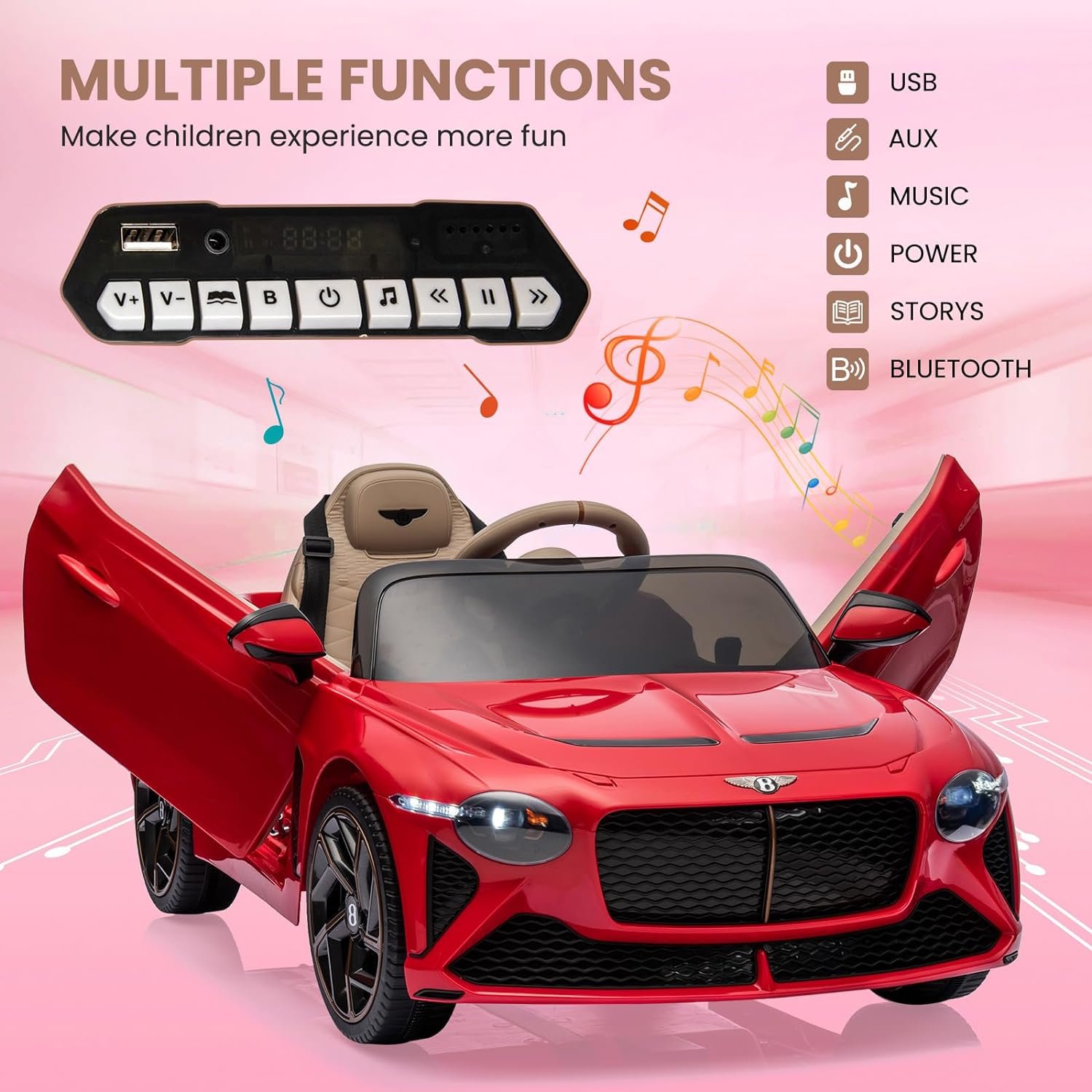 【Officially Licensed Bentley】Our licensed ride on car showcases an authentic design inspired by the iconic Bentley Bacalar. It features realistic elements such as swing-up doors, front and rear lights, a responsive steering wheel, and a foot pedal, providing an immersive driving experience.
