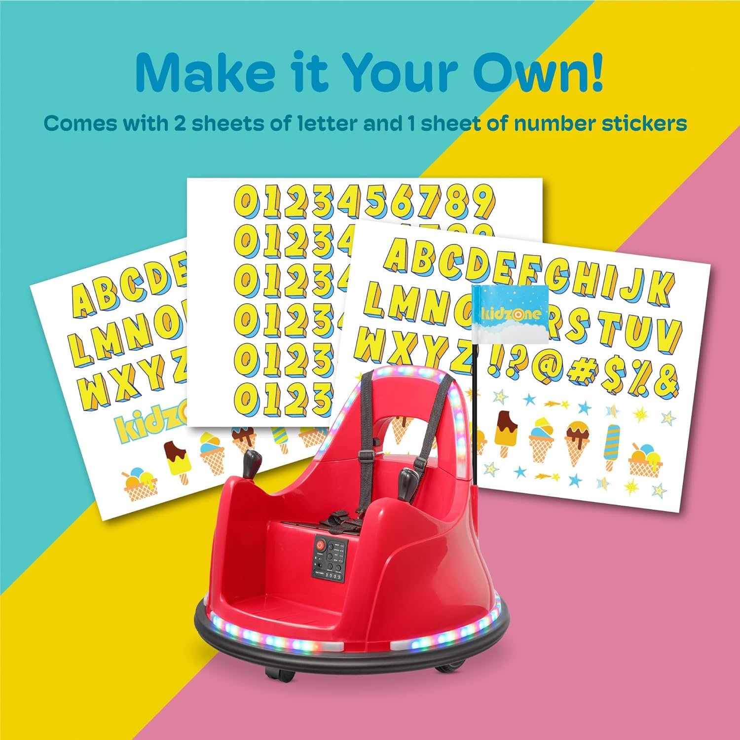 [Superior Performance] The bumper car is equipped with two 15W motors, a weight capacity of 66 lbs, and is suitable for kids aged 18-72 months. Features include a 360-degree spin, power-display, multi-colored lights, DIY stickers, and Bluetooth connectivity to play music or audio files.