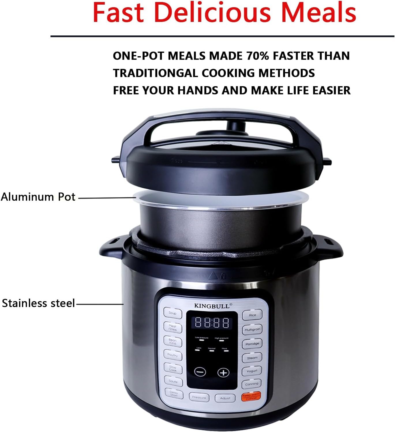 [Advanced safety protection and accessories]:KINGBULL electric pressure cooker has ETL certification, anti-opening safety design, automatic pressure and temperature control, overheating protection, safety lock, etc. Accessories include Rice Paddle,Measuring Cup, Condensation Collector, and User Manual. Reminder: Before using the electric pressure cooker, please read the user manual carefully before proceeding!