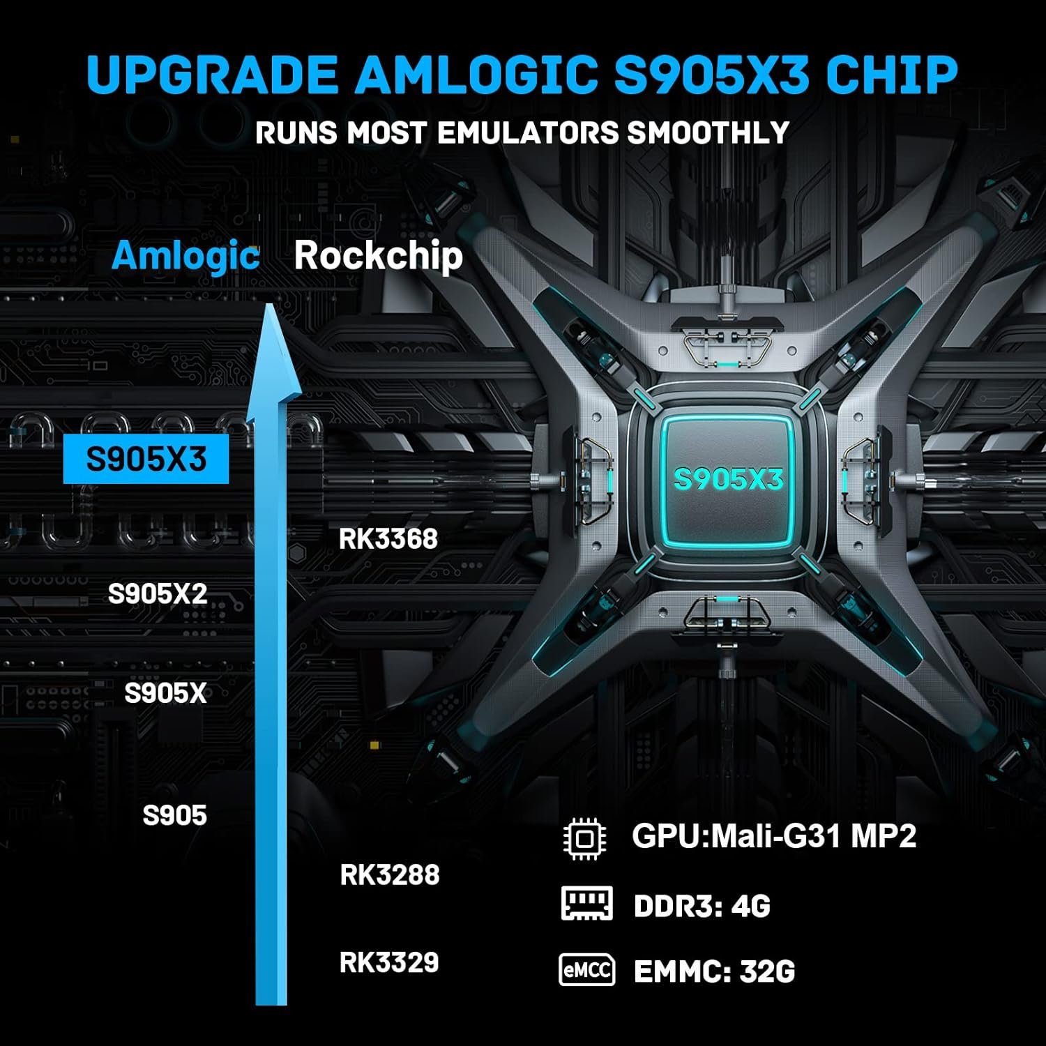 【Super Gaming Performance】: The Video Game Console is equipped with the newly upgraded S905X3 chip, Quad-core ARM Cortex A55 up to 1.91GHz CPU, Mali-G31 MP2 GPU,4GB RAM large-capacity storage, which can provide super-fast running speed and smooth image processing performance, Run large-scale 3D games smoothly.