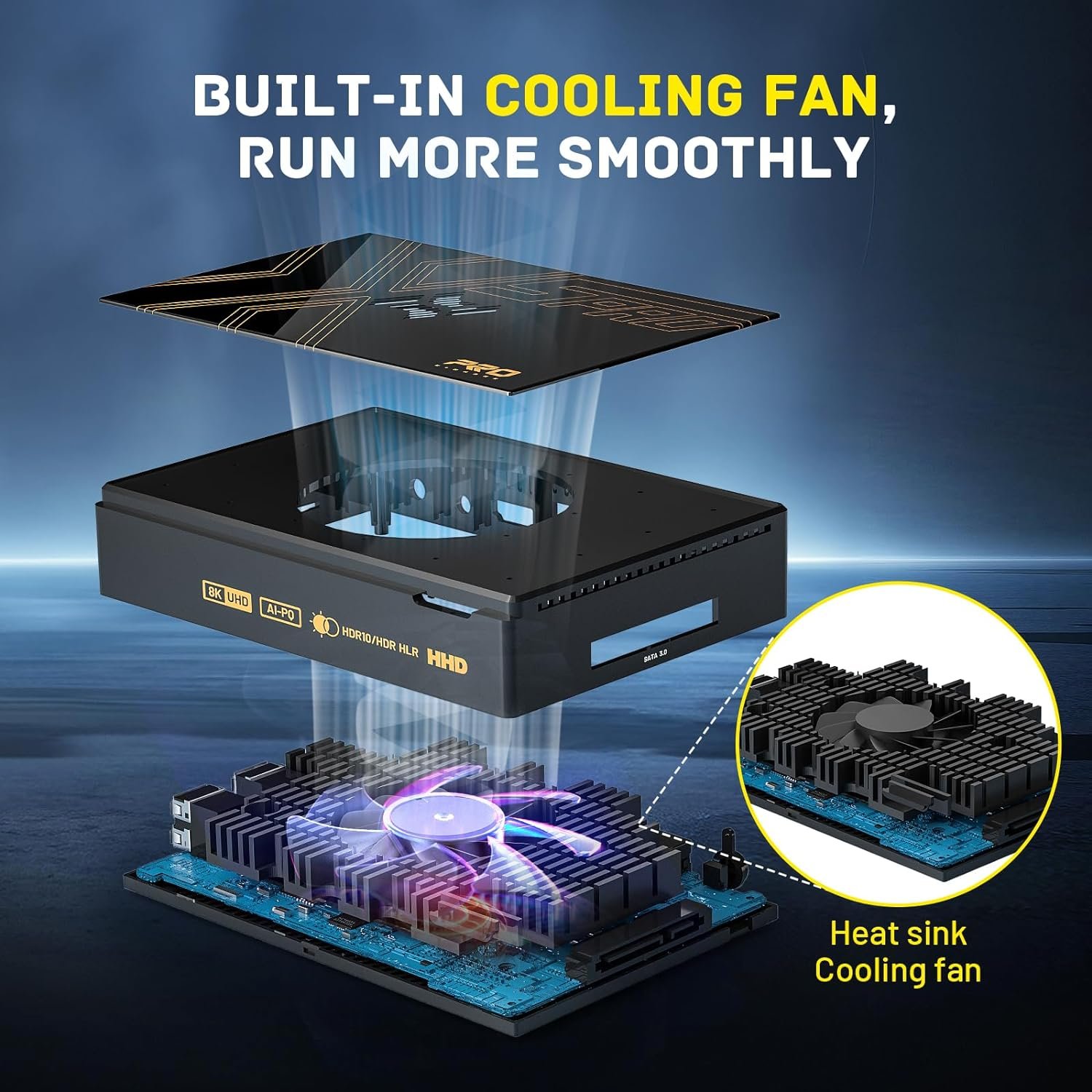 【Powerful Chip】: X5 PRO Retro Console adopts the latest RockChip RK3588S chip, 8-core 64-bit CPU, clocked up to 2.4GHz, ARM Mali-G610 MP4 quad-core GPU, providing more stable performance. 8G DDR4+64G eMMC provides larger storage space and can support up to 18T hard drive expansion.
