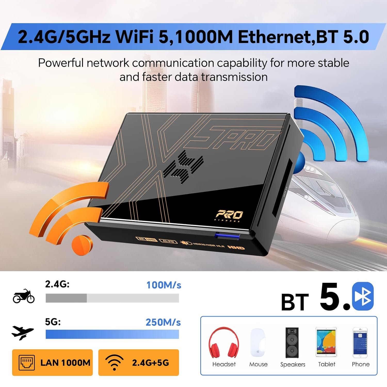 šć2.4G&5G WiFi, BT 5.0ć: Stay connected with dual-band Wi-Fi, ensuring a stable and fast viewing experience. Android box supports Ethernet for a reliable and uninterrupted connection. Connect your wireless headphones, speakers, or game controllers with Bluetooth 5.0 for a truly immersive audio experience.