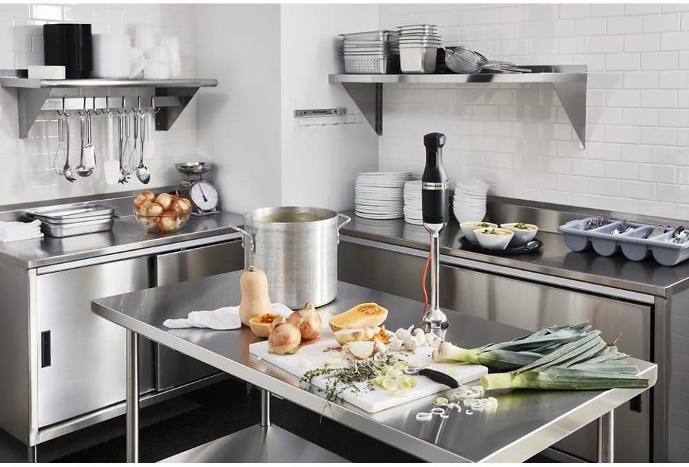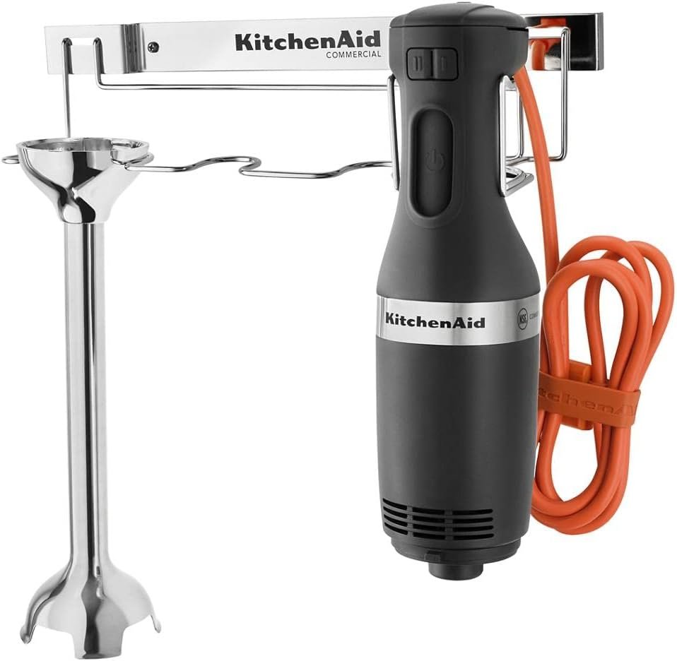 Designed and Engineered to handle your tough blending jobs. This 300 Series NSF® Certified Commercial Immersion Blender features a 10″ removable blending arm with s-shaped blade to blend everything from smoothies, to sauces, soups and so much more. The quiet, yet powerful, DC motor with 2 speeds (11,000 and 18,000 RPM,) is powerful enough to handle difficult blending with ease, including dough. A convenient wall mount accessory is included for easy storage when not in use.