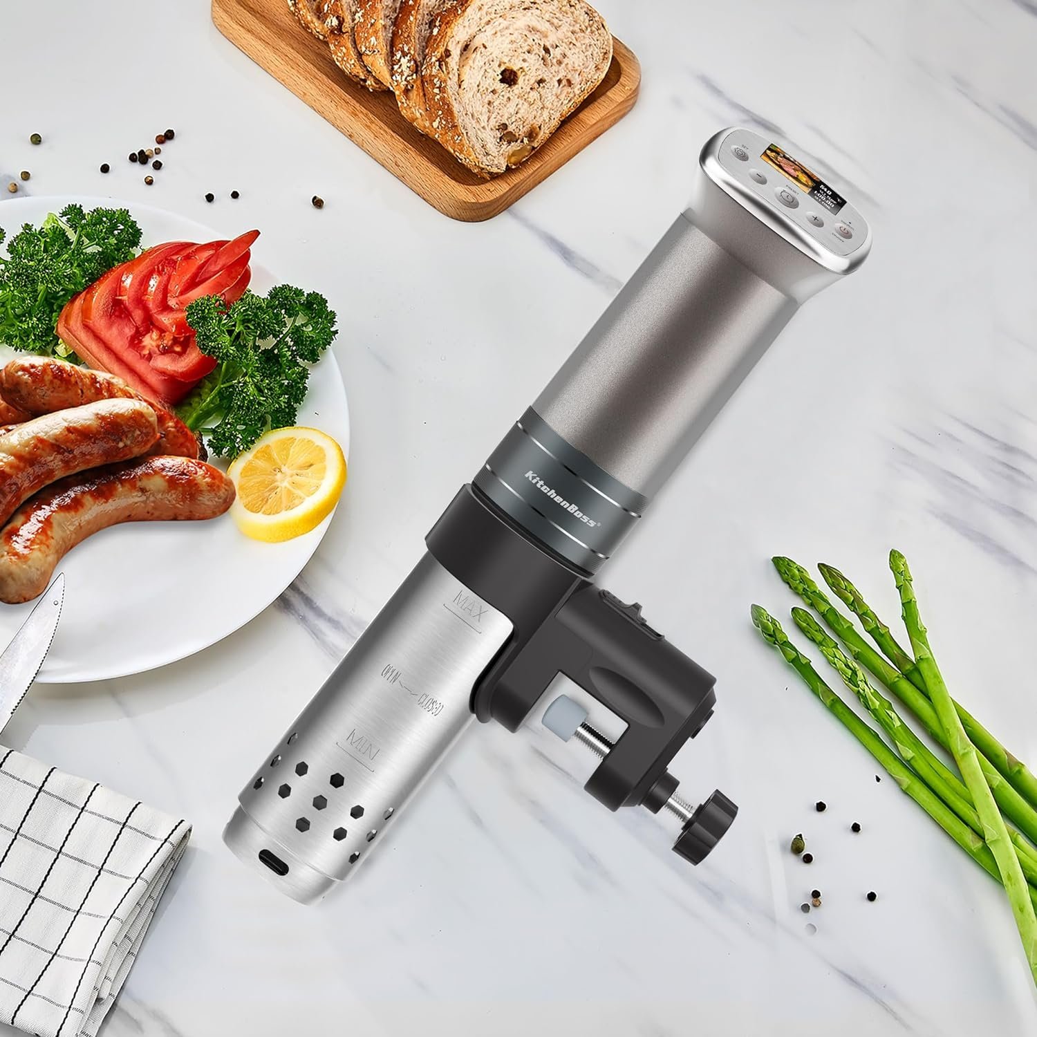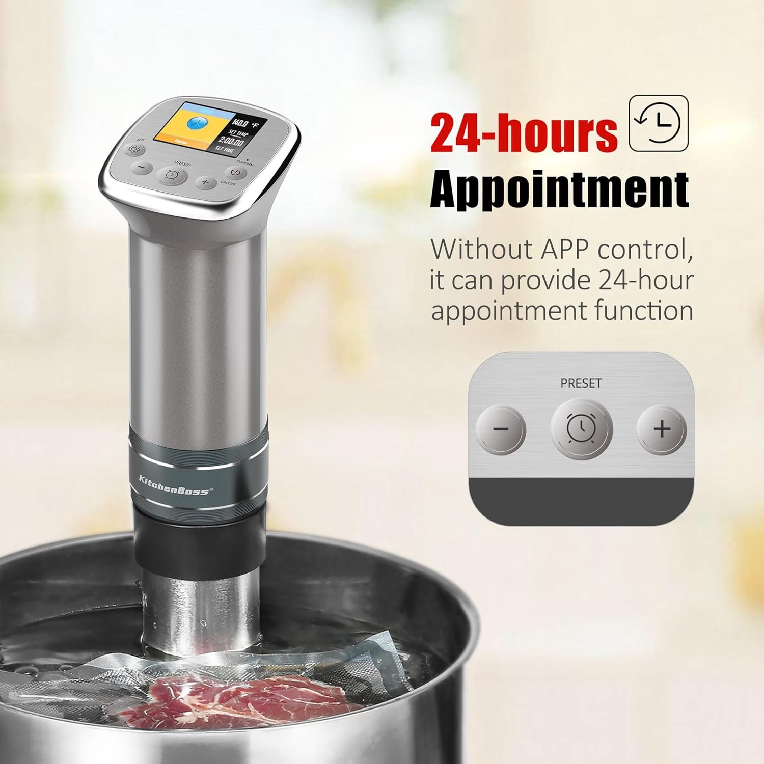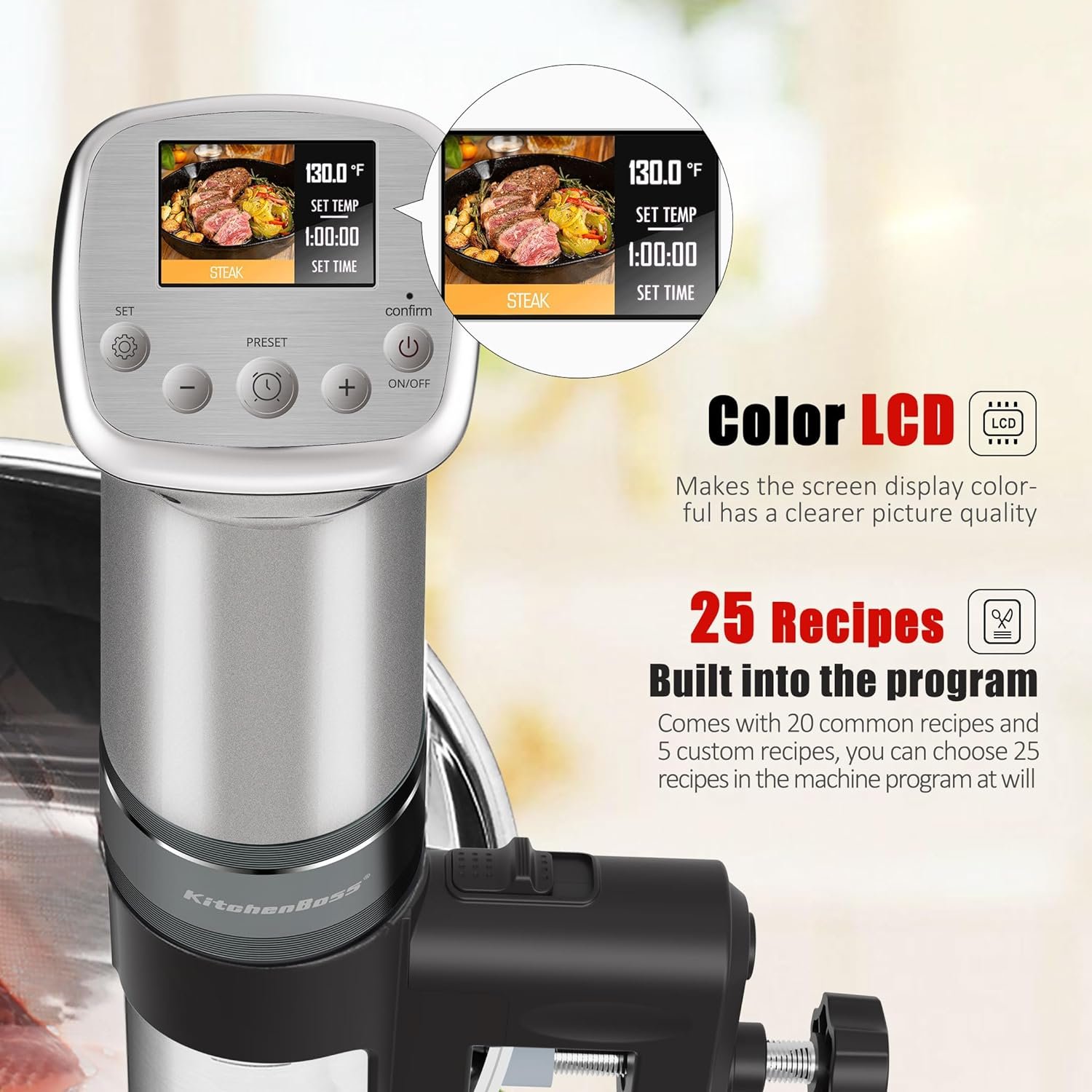 【Original recipes helps cooking professionally】The sous vide cooker’s Ultra-clear LCD displays 20 original healthy recipes created by famous restaurant chefs and 5 custom recipes customized to your preferences.The recipe sets the perfect temperature and time for hot spring eggs, steak, lamb chops and other ingredients, so that you can easily cook the perfect taste of professional chef at home!