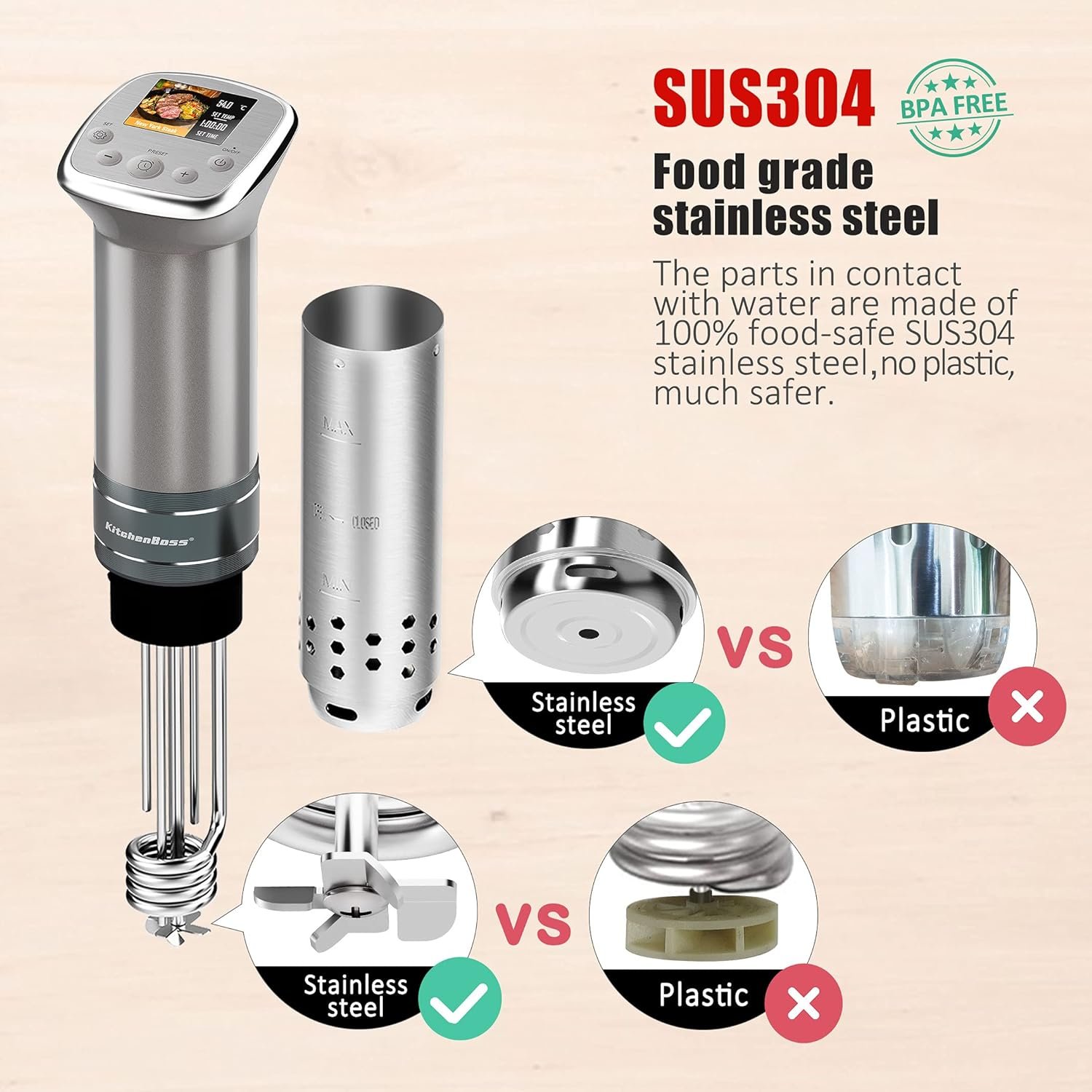 【Safe and no noise】The whole part of the sous vide touching the water is made of SUS304 stainless steel, which will not cause the product’s material to become yellow due to the long use time, and it is safe and durable.The wave wheel adopts a 135 degree inclination Angle design, with the elliptical hole of the sleeve, to reduce the noise.