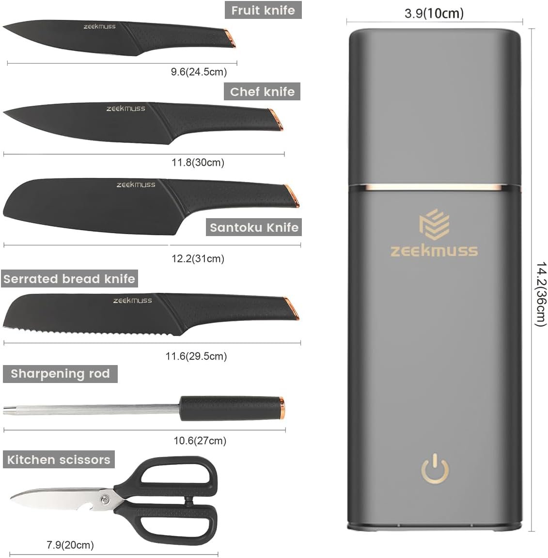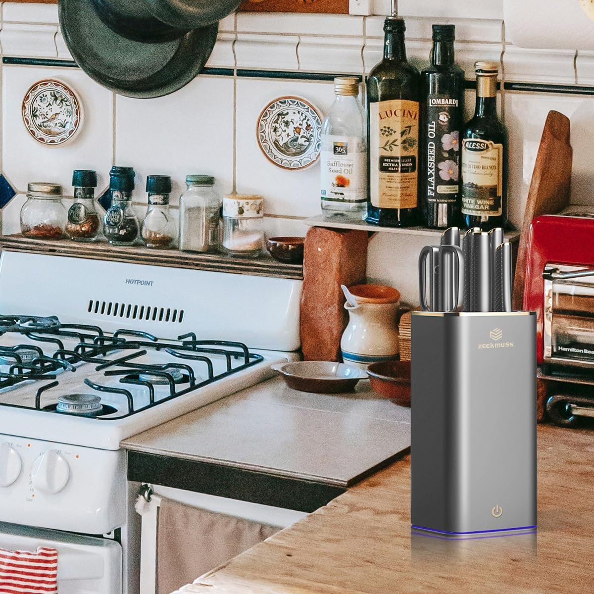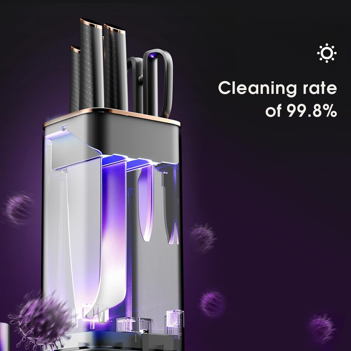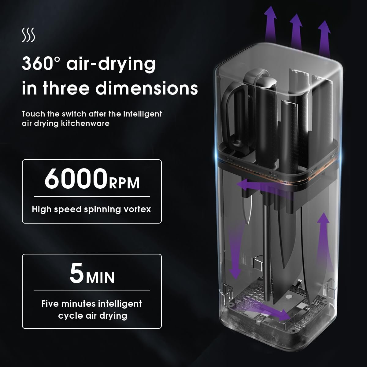 Smart Cleaning: The interior of the knife holder has a cleaning and drying function, waterproof and rust-proof. Wash the knife and put it back on the knife holder and press the button, the base will turn on breathing light and start working. The light goes off after five minutes, after fifteen minutes the cleaning job is over. The knives will become clean and dry.