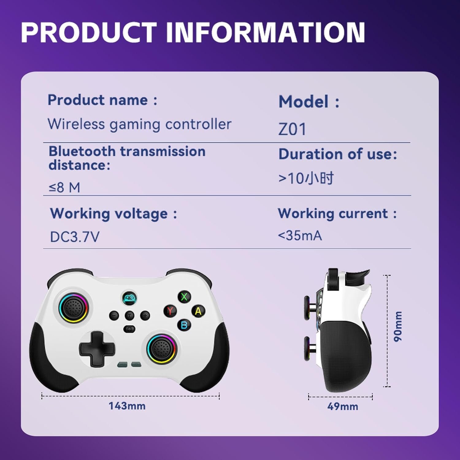 Name Wireless Controller for Tesla/Android/iOS/PC/Switch/PS4/PS3 Size Small Size (14cm*9cm*4cm/5.51*3.54*1.57in, 173g/0.38Ib.) Product List 1x Wireless Gamepad; 1x Type C Charging Cable; 1x User Manual Support iOS 13.0+ Phone game controller for iPhone 15/iPhone 15 Plus/iPhone 15 Pro/iPhone 15 Pro Max/iPhone 14/14 Plus/14 Pro /14 Pro Max/ iPhone 13/13 mini/13 Pro/13 Pro Max/iPhone 12/12 mini/12 Pro/12 Pro Max/iPhone 11/11 Pro/11 Pro Max/iPhone X/XR/XS/XS Max/iPhone 8 Plus/7 Plus/6 Plus; for iPad controller: iPad/iPad Mini/iPad Pro/iPad Air(Not for Apple TV&iPod, Fire TV/TV Box) Support Android 6.0+ Phone controller compatible with Samsung Galaxy S23, Galaxy S23 Ultra, Galaxy S23+, Galaxy S22, Galaxy S22 Ultra, Galaxy S22+, Galaxy S21, Galaxy S21 Ultra, Galaxy S21+, Galaxy S20, Galaxy S9, S9 + , S10, S10+, oppo, vivo, LG, X-iaomi, O-nePlus, M-otorola, TCL and more Android phones. Tablet controller compatible with Samsung Galaxy Tab S, Galaxy Tab A, Lenovo Legion Y700 etc. Support PC PC wireless controller for MacBook, PC, Notebook, Laptop (If your PC does not have its own Bluetooth function, then you need to buy another Bluetooth receiver(Bluetooth Receiver Hardware Required: Bluetooth 4.2 +) Support Switch Pro controller for Nintendo Switch, Switch OLED, Switch Lite Support PlayStation Wireless controller for PS3, PS4, PS4 Pro, PS4 slim (only supports playing PS4 games on PS5 consoles; No support for playing PS5 games) Support Tesla Wireless Bluetooth controller for Tesla Model 3, Tesla Model Y, Tesla Model S, Tesla Model X and most. (NO 2.4G adapter needed. ) Not supported Vibration, 6-axis gyro, and 2-player game mode Support Cloud Gaming Support cloud gaming on iOS/Android mobile or tablet: Nvidia GeForce Now, xbox game pass, Amazon Luna, Google Stadia, Rainway, Moonlight, Arcade Tips for the Controller Please fully charge the controller before first use. (2)Ensure that the controller is turned off before Bluetooth pairing connection.
