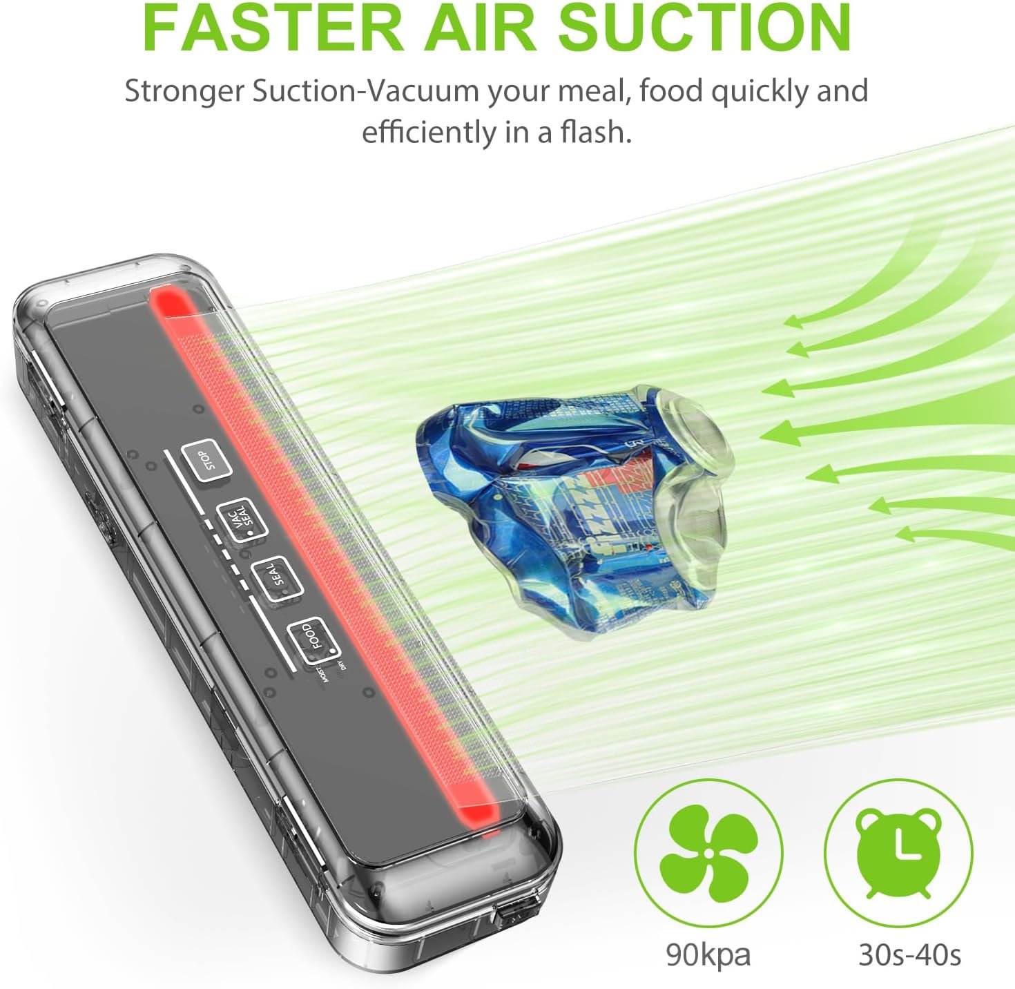 Strong Suction: The food vacuum sealer machine suction has increased to 90kPa. Vacuum your meal, food quickly and efficiently in a flash. You can prep meals faster and easier, save your time and money.
