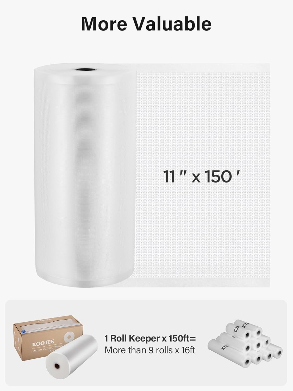 Easy to Use with Cutter: The designed cutter box stores the 11″ x 150′ vacuum seal roll, keeping it free from dust and contaminants while also providing more hygienic and convenient storage than regular packing. With the cutter on the box, you can create vacuum sealer bags of various sizes with greater ease and precision than using scissors, reducing waste.