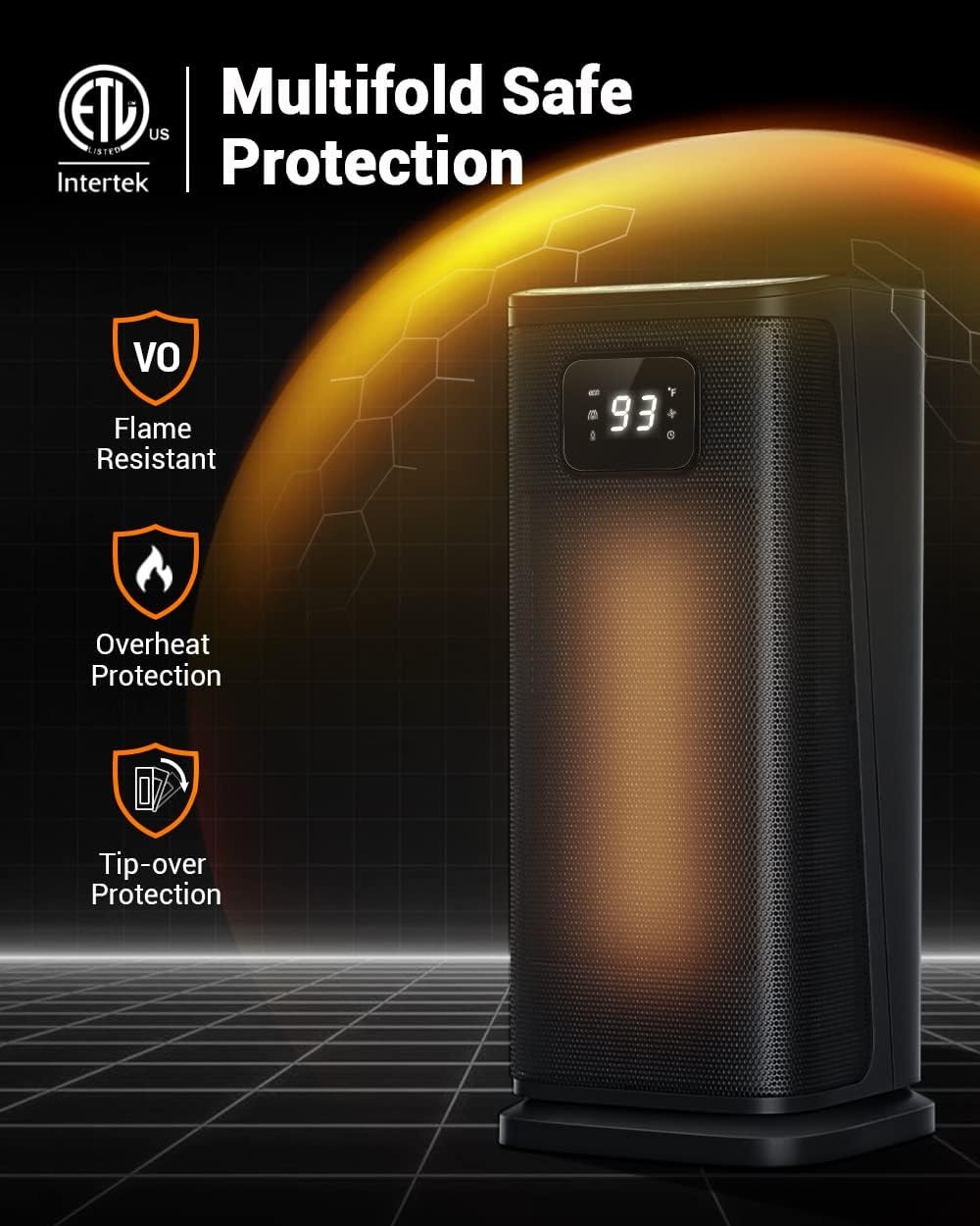 Warmth You Can Trust: Your Safety Remains Our Primary Focus. Our ETL-certified electric portable heater is equipped with overheating and tip-over protection, child lock function, 24-hour timer, and V0-rated flame-retardant materials minimize risks and ensure the safety of you and your loved ones. What’s more reassuring is that you can even choose the continuous work setting and maintain its functionality 24/7. Say goodbye to the cold time and enjoy a warm, quiet, and comfortable home!