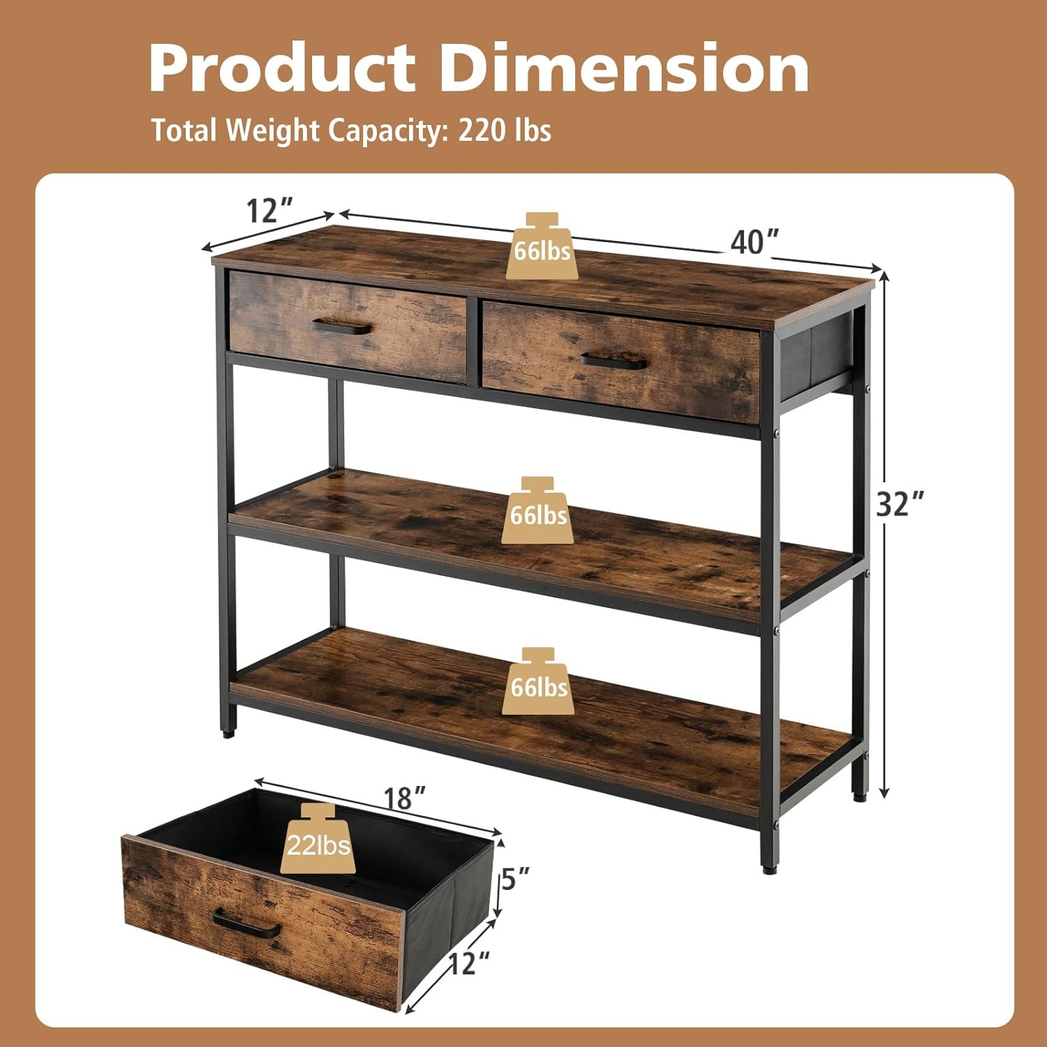【2 Folding Fabric Drawers】The fabric drawers of this foyer table are removable and foldable. The dimension of the drawer is 18” x 12” x 5” (W x D x H). 2 large drawers provide enclosed space for personal items or important documents. And the drawers are designed with metal handles, convenient to pull and push.
