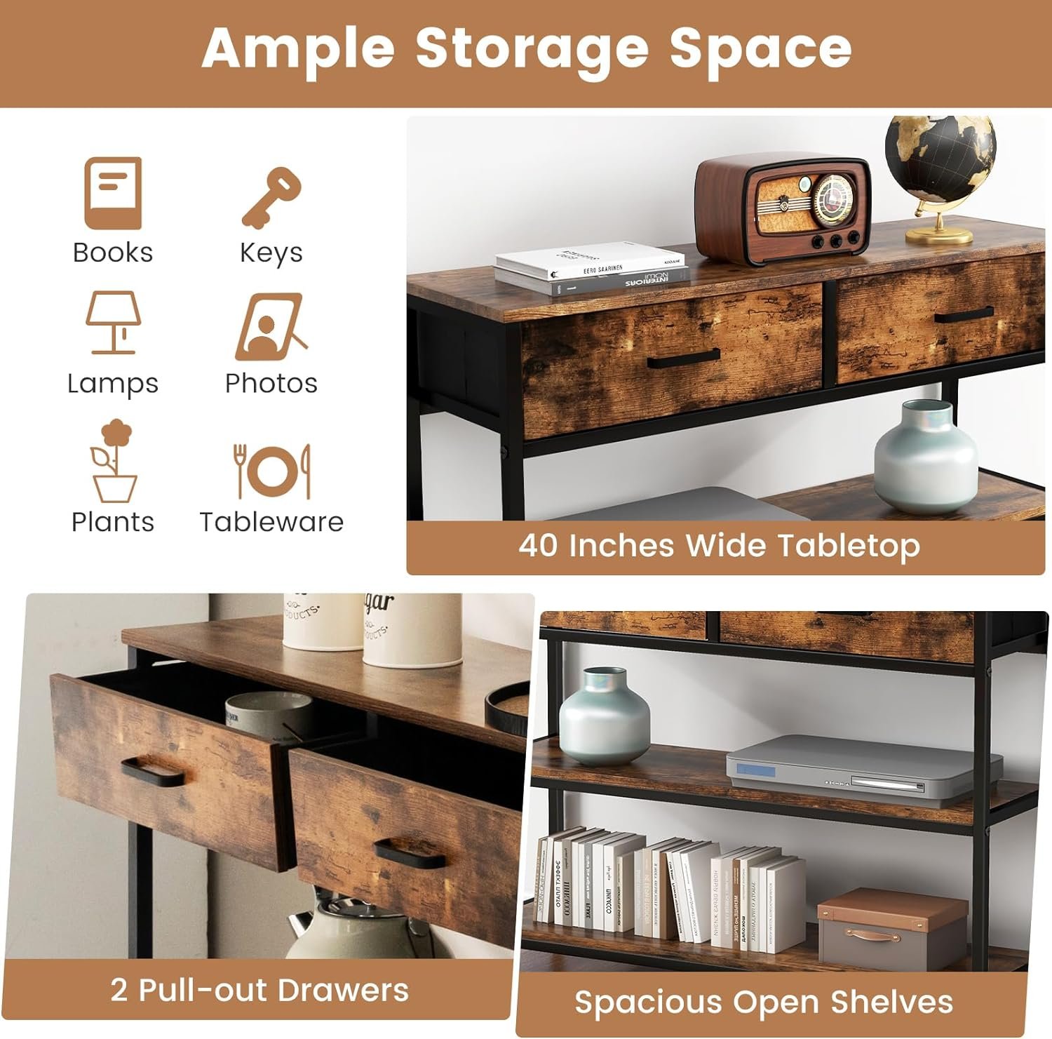 【Ample Storage Space】Overall dimension of this narrow console table is 40″W x 12″D x 32″H. Besides, it has 2 bottom shelves, 2 large drawers and a spacious tabletop, which provide ample storage for books, photos, lamp, ornaments and potted plants.