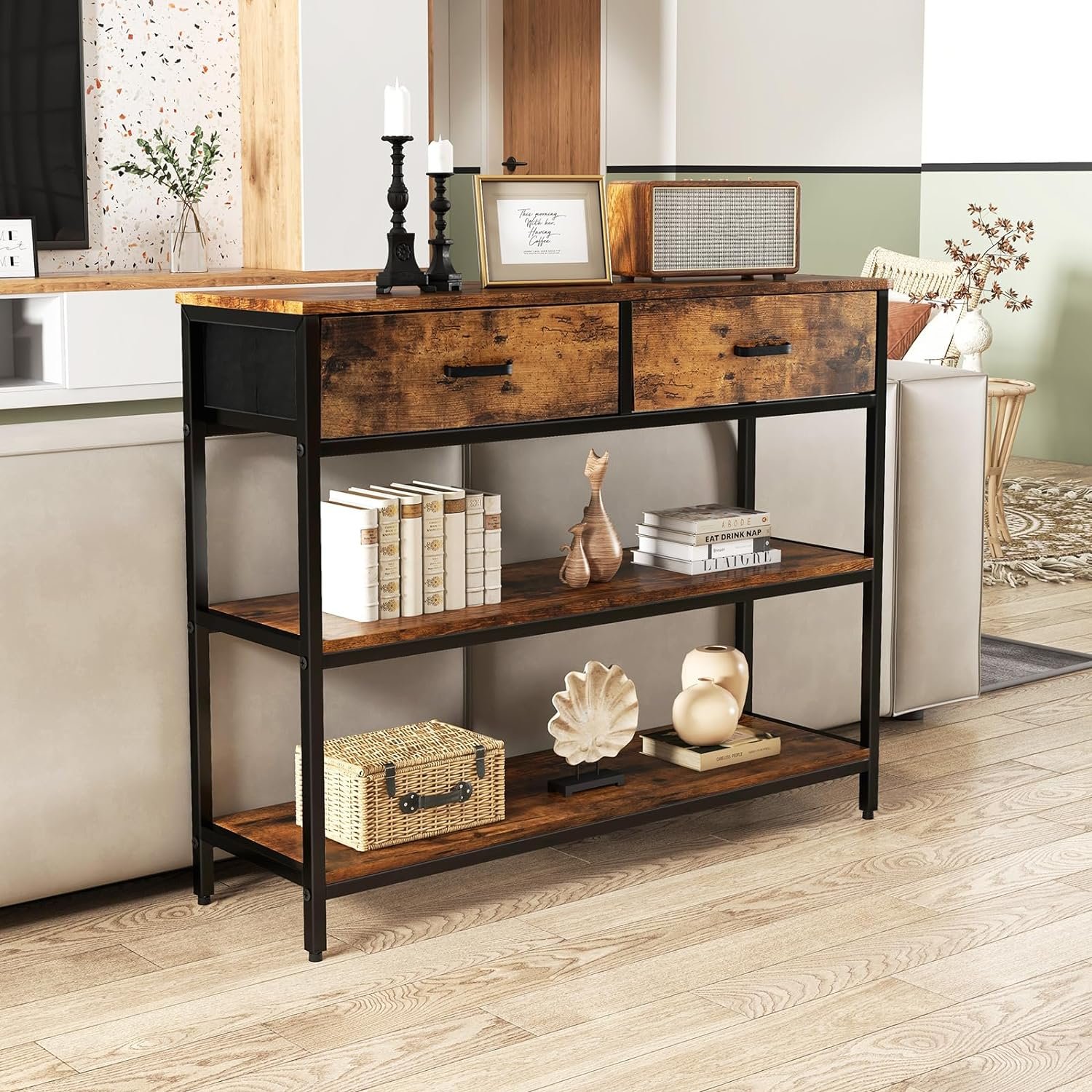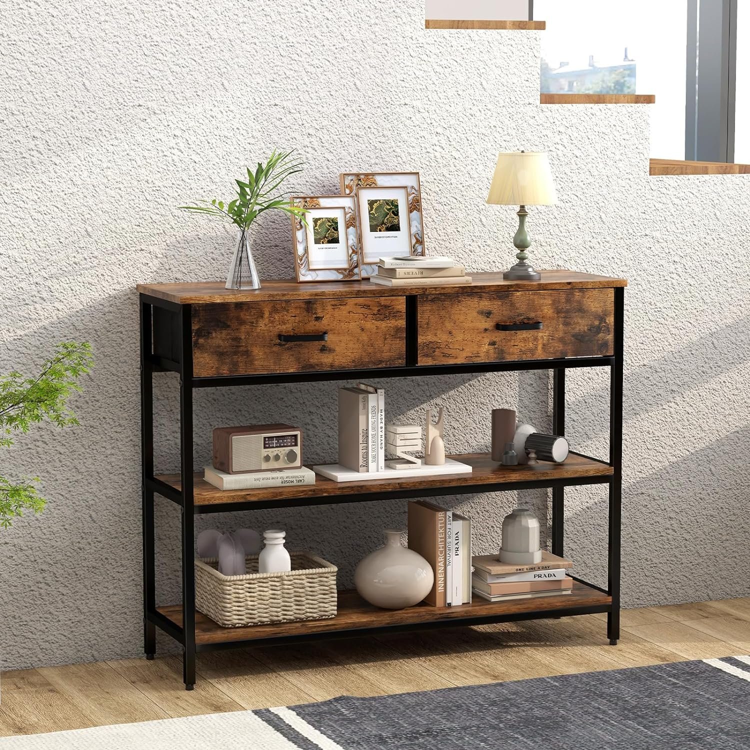 【Stylish & Versatile Table】Combined with vintage wood texture and black frosted steel, this entryway table can be perfectly matched with rustic, industrial or modern home decor. It can be used as a sofa table behind the couch; hallway table, side table, display table or TV stand in the living room; Storage cabinet in the bedroom.