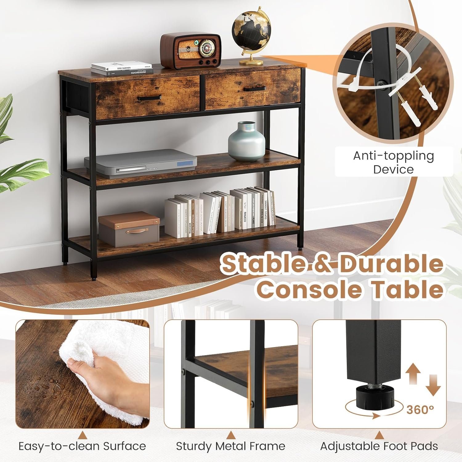 【Easy to Assemble & Clean】This industrial console table comes with all needed parts and clear instructions, it’s easy to assemble. In addition, the surface is easy to clean with a damp cloth, and the drawer can be removed for cleaninig. If you have any questions, please feel free to contact us.