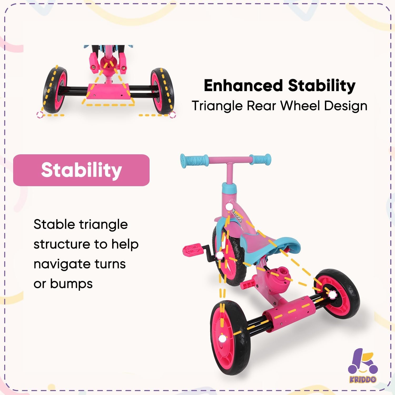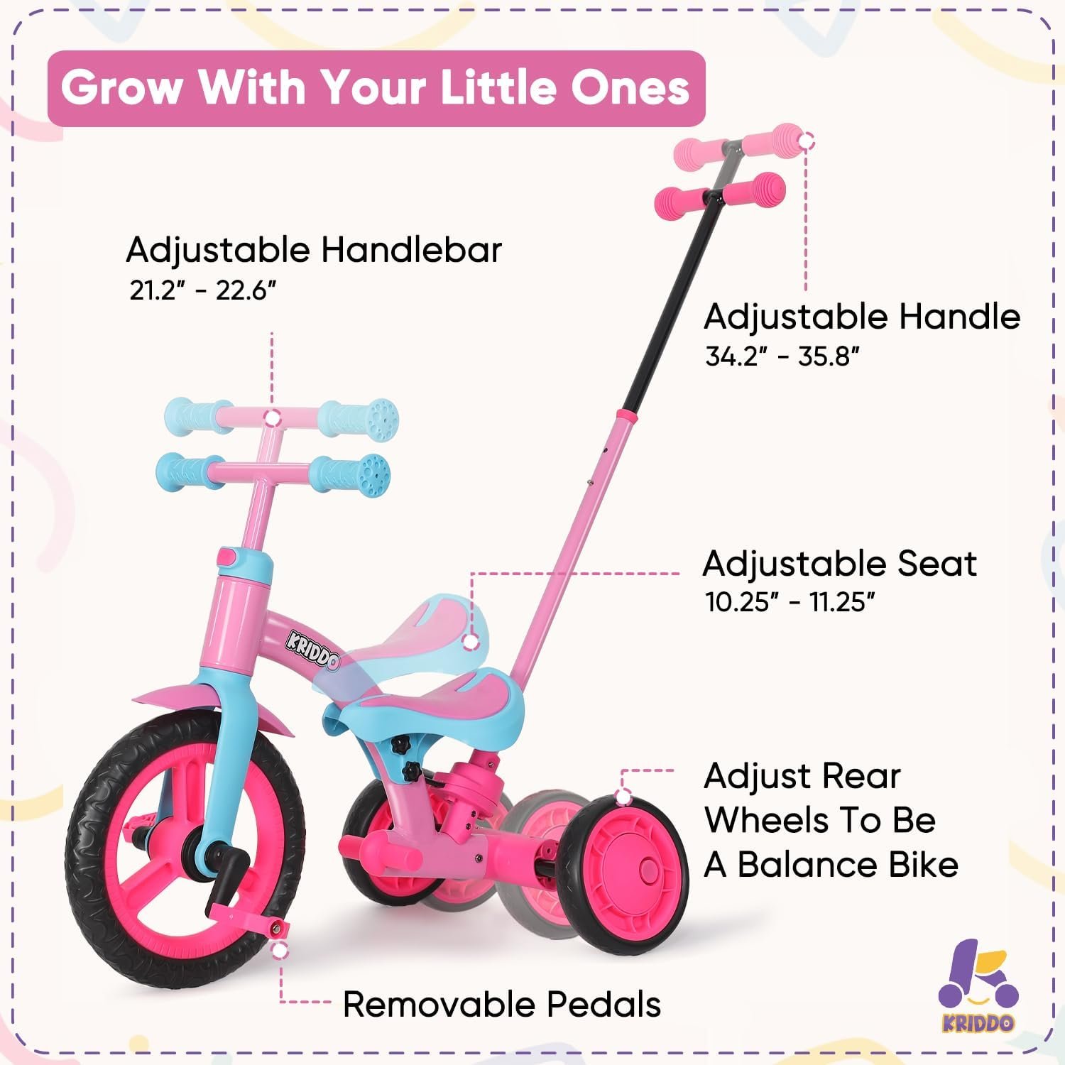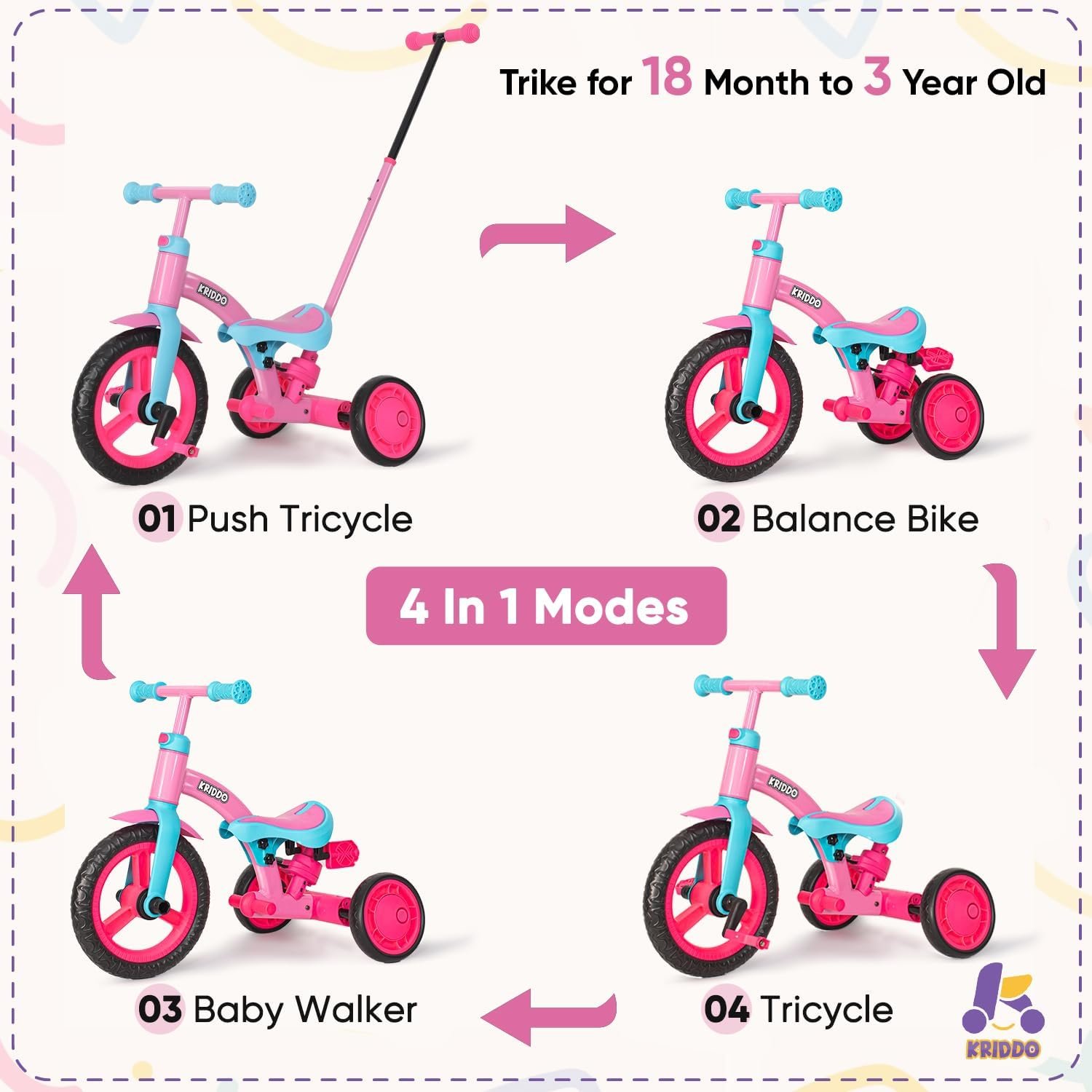 ALL-IN-ONE TODDLER BIKE: An exciting and interactive kids trike that features baby walker, cycling, and balance bike modes. KRIDDO kids tricycle gives boys and girls plenty of options to explore the driveway, sidewalks, and grassy off-roads at the park.