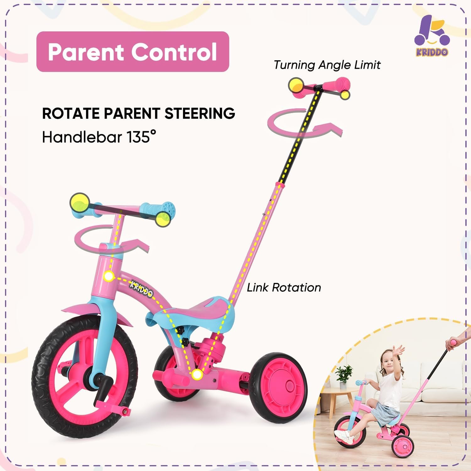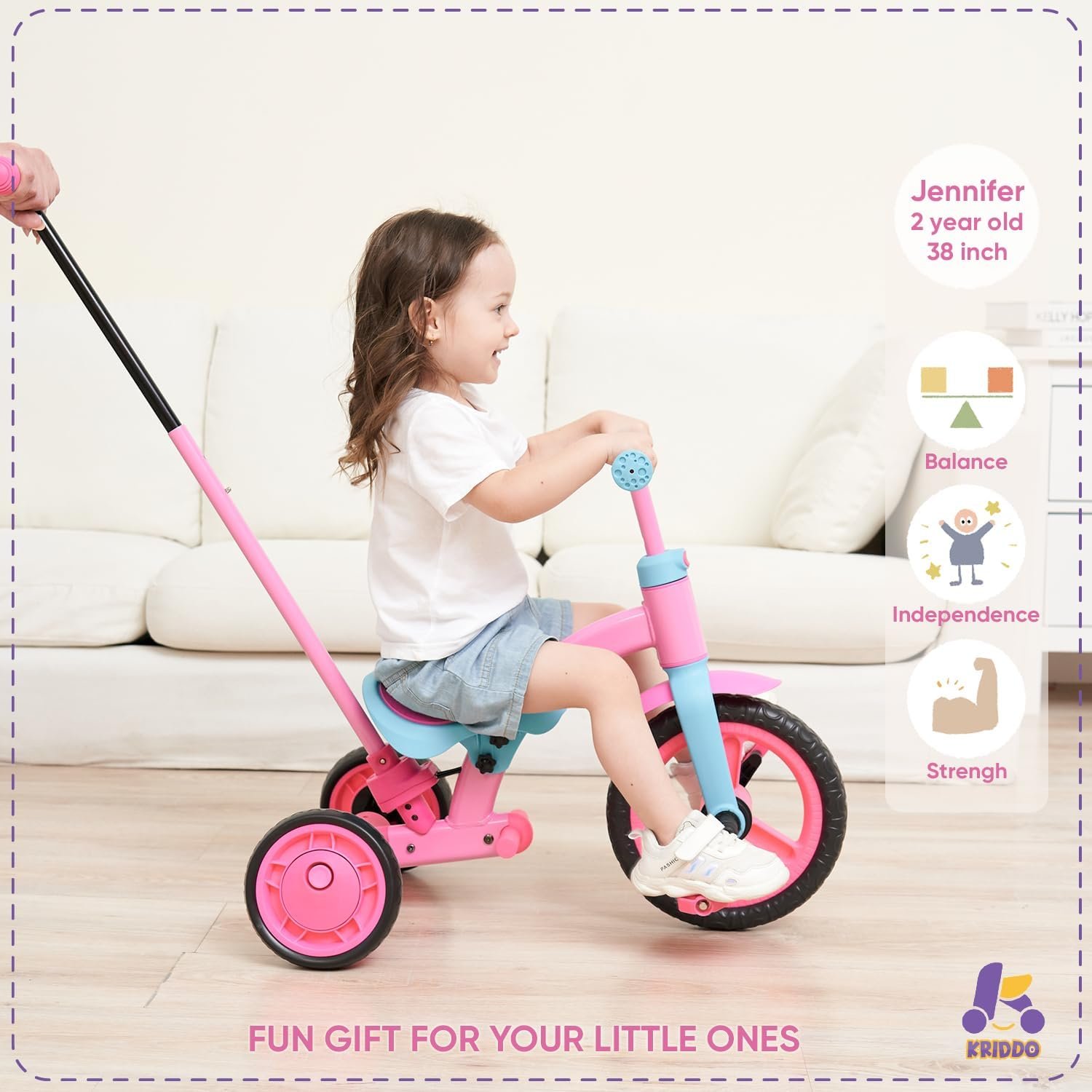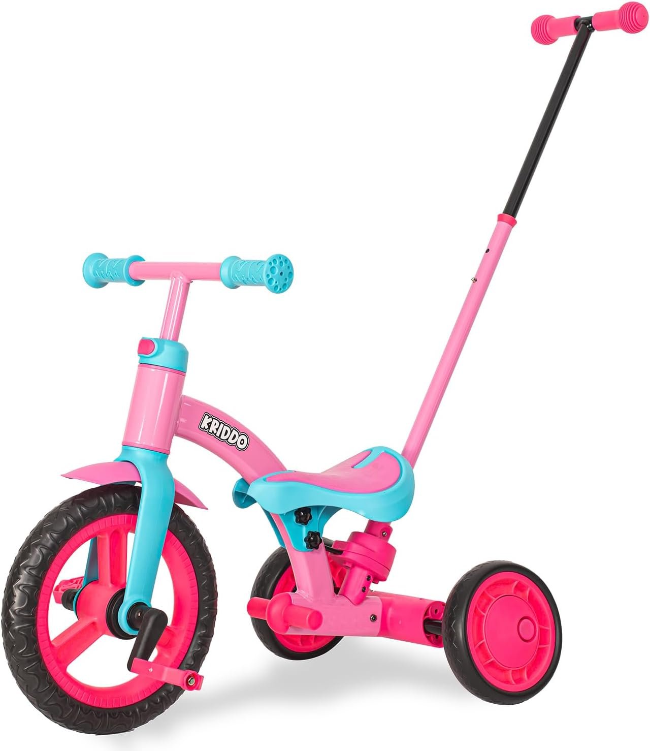 KRIDDO 4-in-1 Kids Tricycle for 1.5 to 3 Yea Old with Parent Steering Push Handle, 12 Inch Front Wheel Trike, Toddler Balance Bike for Boys Girls 18 Month to 3 Years, Adjustable Height, Pink