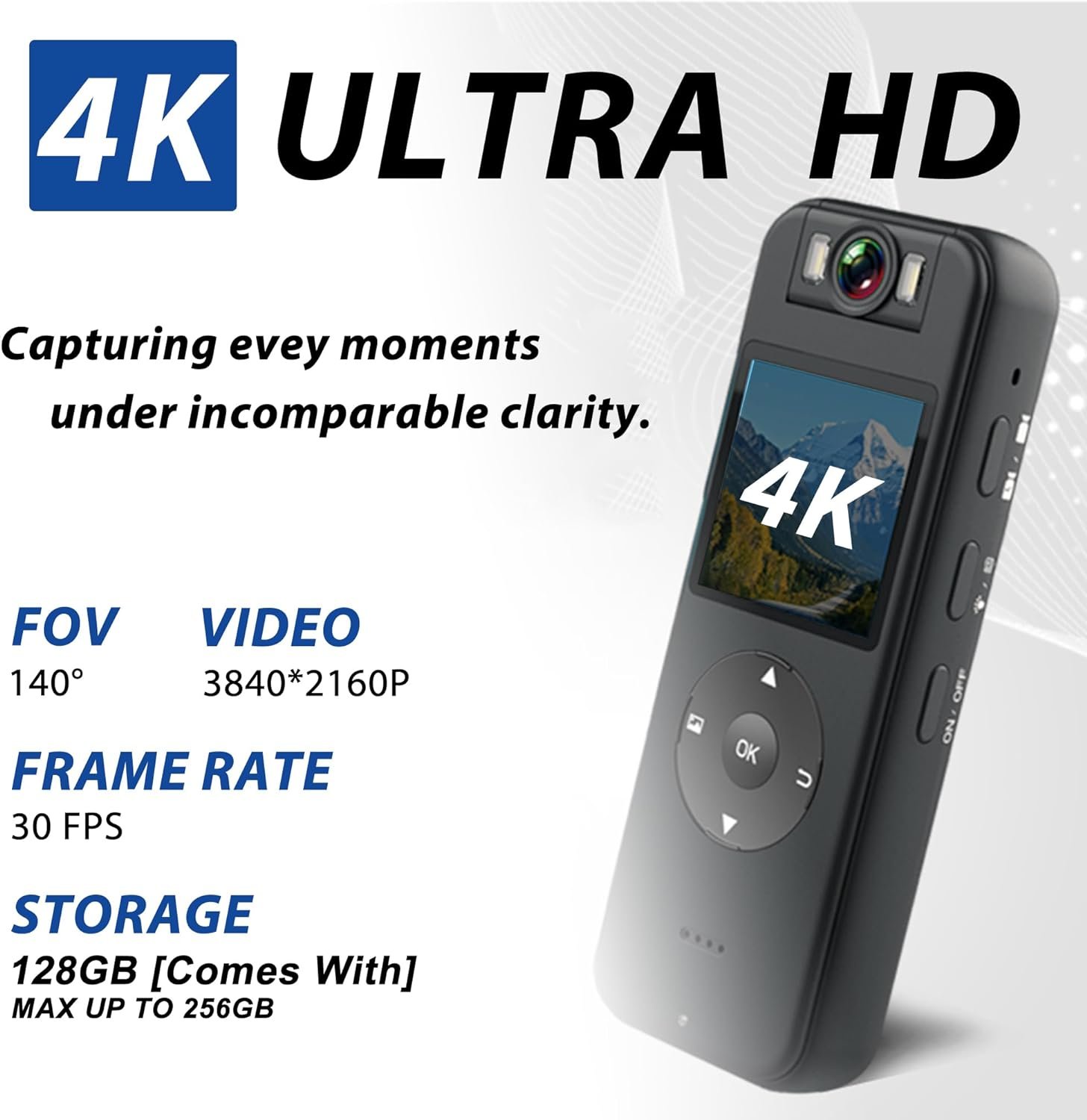 【1.4″ Powerful Cam’s LCD Screen / Hotspot Mode】4K Body Camera Recorder with the 1.4IN High-quality LED Screen to replay the videos. Convenient for your footage to replay & delete instantly. Provided a Detailed menu for you to use. Offering inverted screen switching mode & power display, Max 10 mins loop recording, and time stamp setting. No matter where & when the Hotspot mode can help you download your recordings to your phone from the cam. Also, support no card / remote record [Limte 32ft]