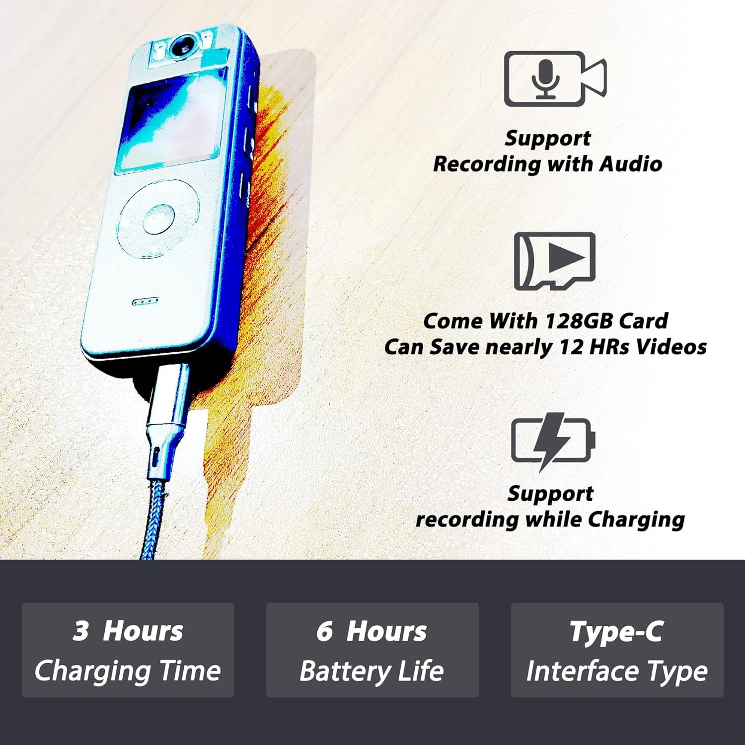 【6 HR Battery life/128GB & 3 ways to Replay】The Body Camera with Equipped with a 1400 mAh rechargeable battery, that can last almost 6-7 HR working time, also supports 24/7 recording video when connecting the power bank/power, helps you keep an eye on everywhere. ①Our body cameras have a built-in 64GB card, to support your long-time recording saving and are recognized by cellphones/laptops/PC to replay. ②Camera’s hot spot mode far to 32 Ft, with an App to replay. ③Replay on screen.