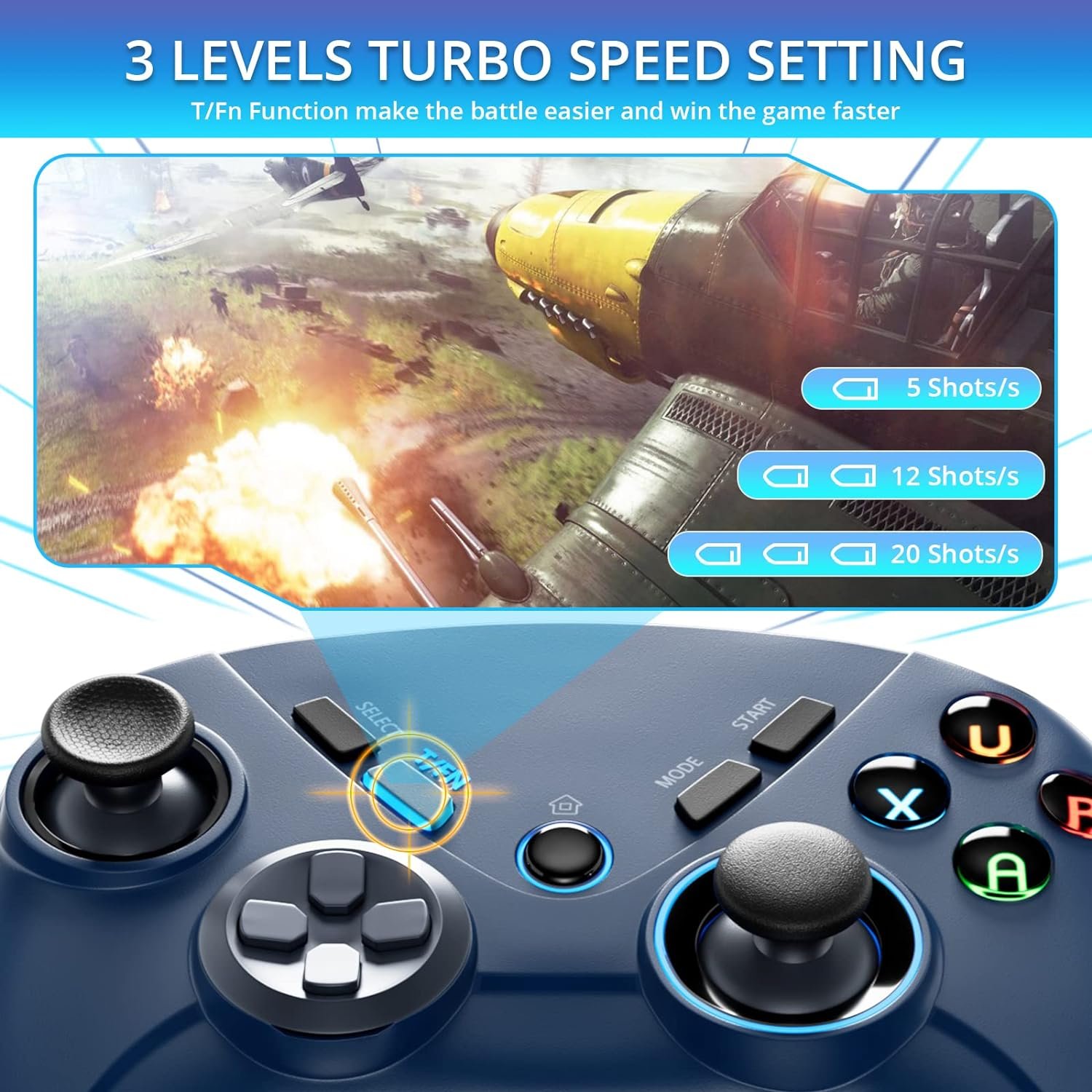 TURBO & PROGRAMMABLE BUTTONS: The wireless pc controller with the 3 levels Turbo speed function and the 4 additional programmable buttons enables you to quickly fire weapons or perform other actions with ease. PC gaming controller with Macro keys helps to minimize button abuse, prolonging the service life of the controller.