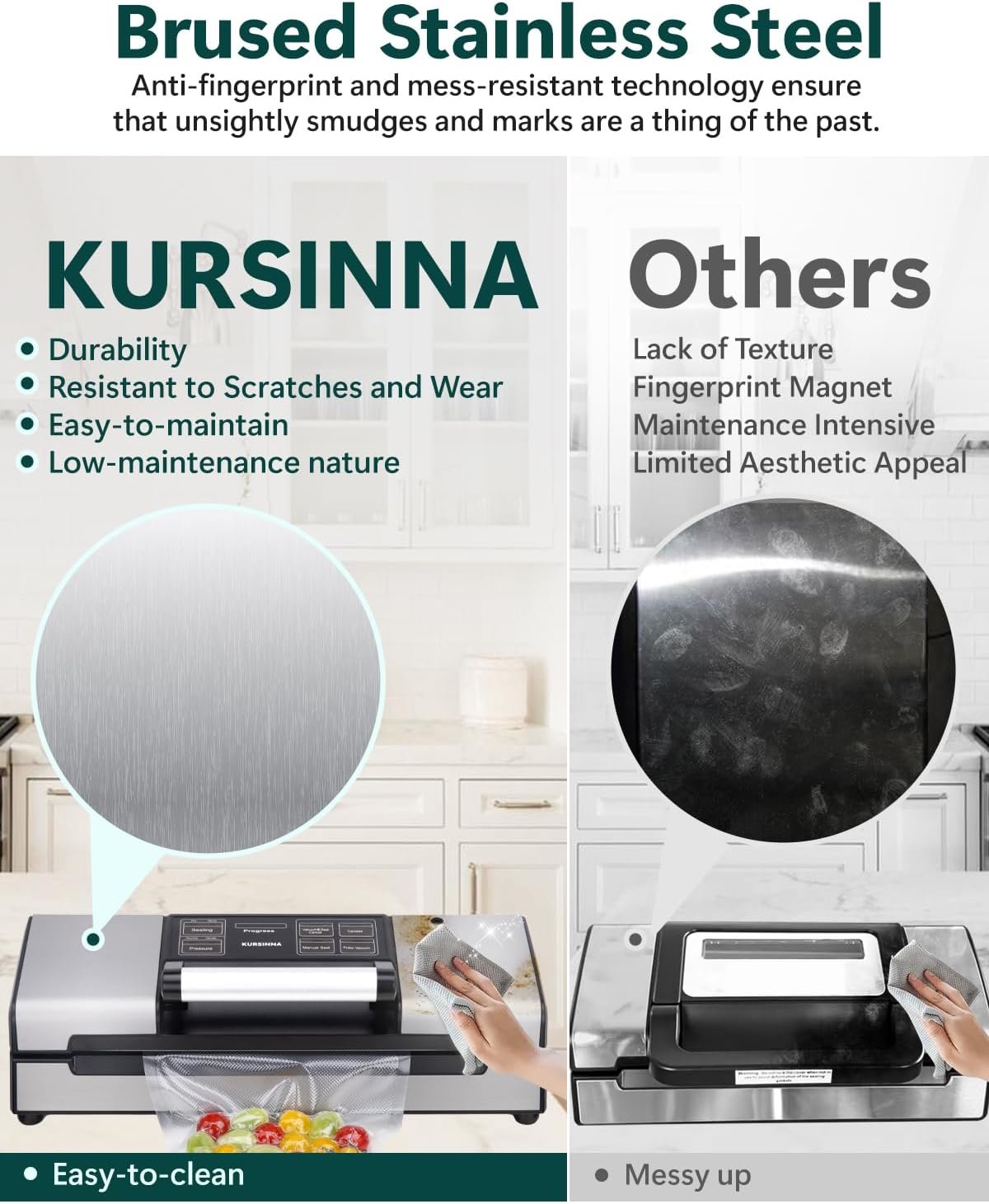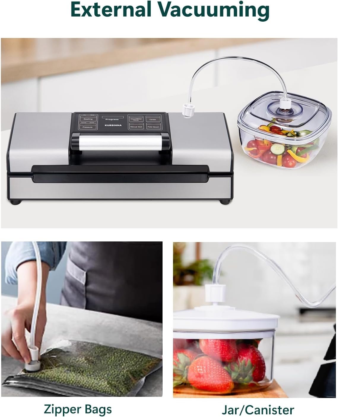 [8-in-1 Multifunctionality] – KURSINNA VS5738 versatile vacuum sealer offers 8 functions in one device, including vacuum sealing, canister sealing, food mode, pressure mode and more, catering to all your food preservation needs.