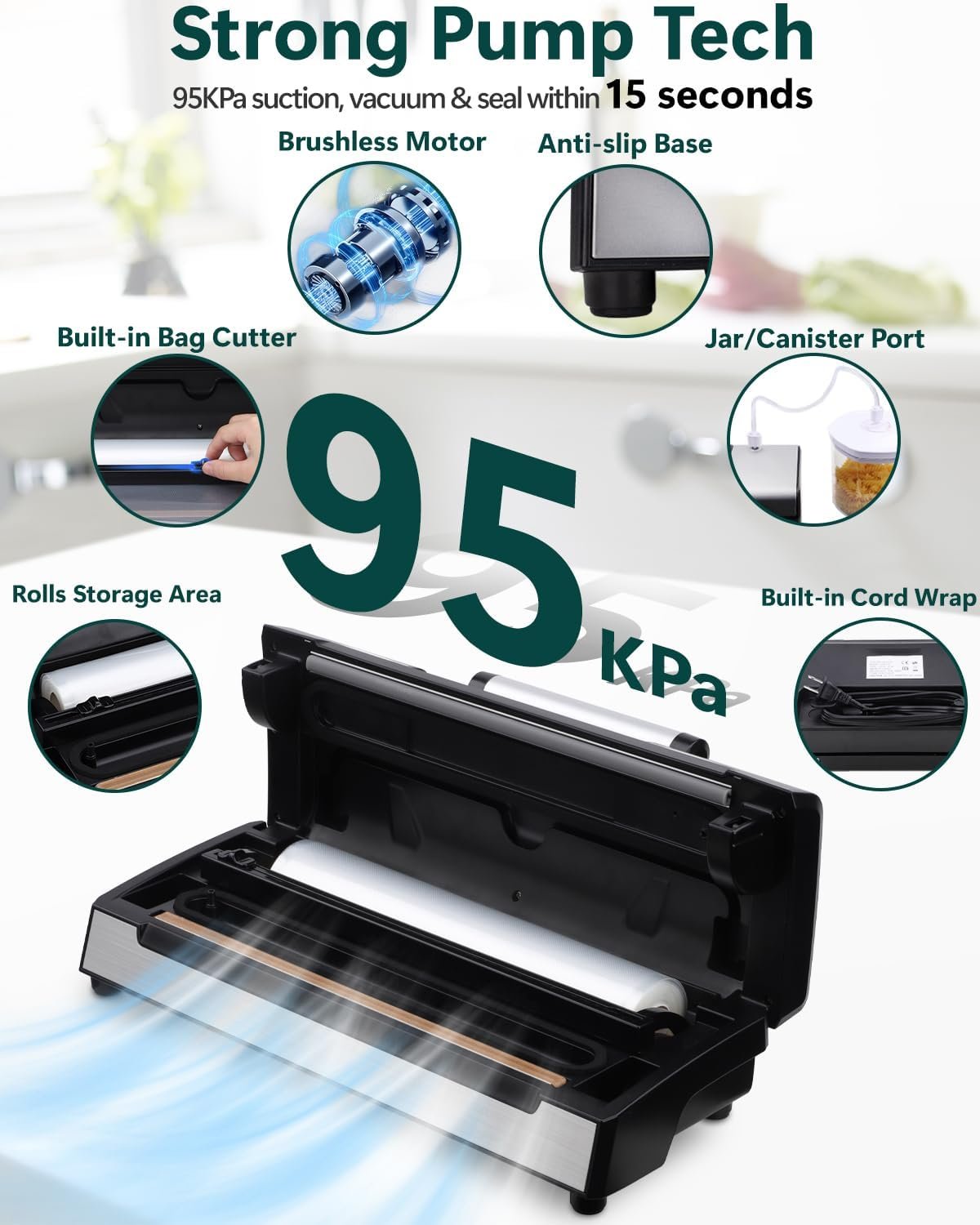 [Rapid 95kPA Super Suction] – Featuring a powerful 95kPA suction strength, this food sealer machine quickly removes air from bags and containers, preserving the flavor, texture, and nutritional value of your food.