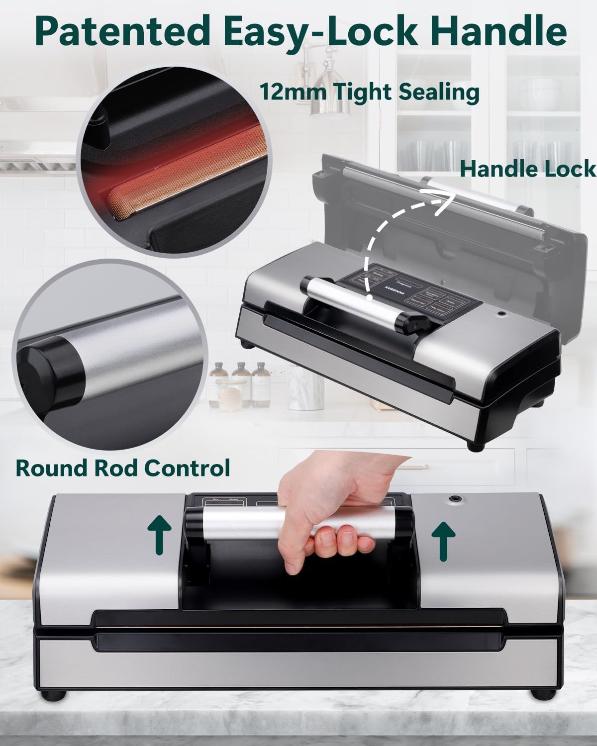 [Secure Handle Lock] – The integrated handle lock ensures an airtight seal, preventing air leakage during the sealing process and guaranteeing food freshness. You can easily lock the lid and secure the seal by pressing down on the lid. Only one step to select the mode, 10-20 seconds to complete the vacuum and sealing automatically.