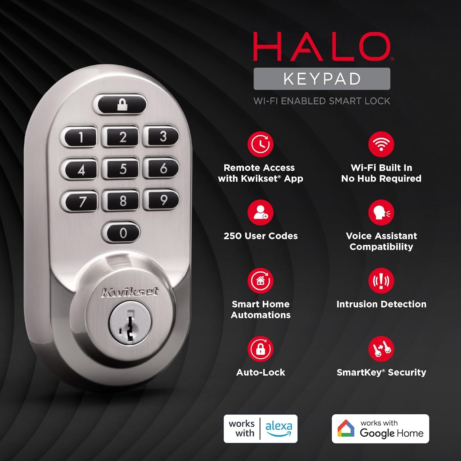 Unlock simplicity, connectivity and smart living with Halo Keypad. With the Kwikset app and Halo Keypad’s built-in Wi-Fi, you can lock or unlock your home from anywhere. Keyless entry means you can ditch your keys, for good — unlock your door with the Kwikset app or enter a code on the backlit keypad. Access codes simplify sharing access with family and trusted guests, and real-time notifications give you peace of mind they’ve locked up after leaving. Experience total control of your front door: Control your lock with your voice, check the event log any time and receive instant notifications for intrusion attempts. It’s easy to get started with Halo Keypad; the guided setup and installation only requires a screwdriver. When it comes to security and access control, you can trust Kwikset’s 75 years of experience to deliver effortless protection and peace of mind.