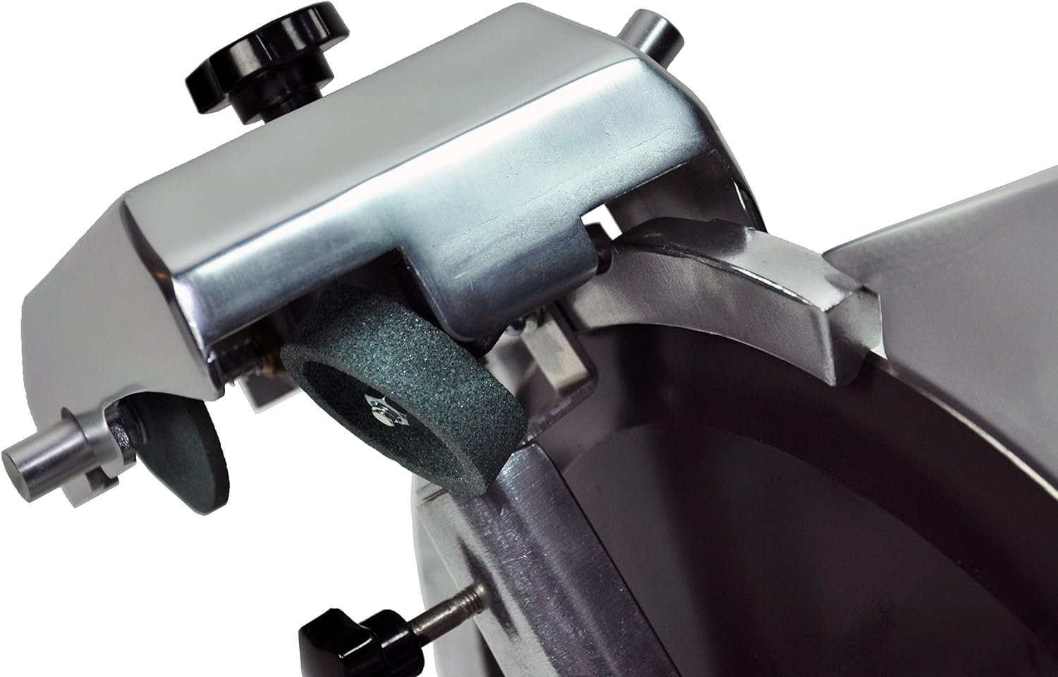 The second lock is designed on the sharpening attachment. Our KWS MS-12SL meat slicer will automatically stop running once the machine detects the sharpening attachment is taken away.