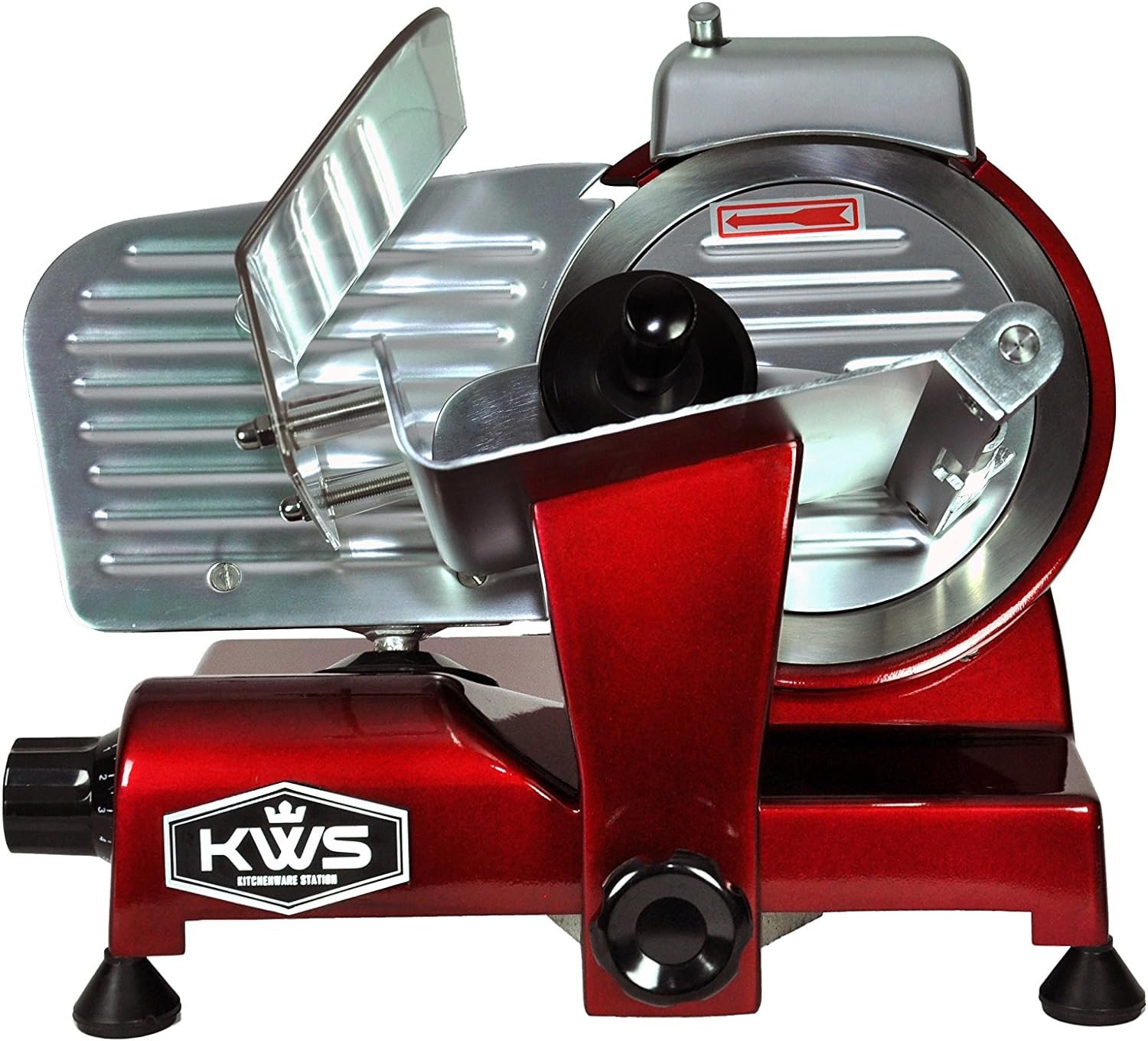 The KitchenWare Station MS-6 high-quality stainless-steel blade professional semi- automatic meat slicer is perfect for home use, caterers and chefs etc. MS-6 features a compact design, its overall dimensions is 15.2 (L) * 14.8 (W) *13 (H). This meat slicer features 200 watts of motor power, it is perfect for slicing meats(recommended), vegetables, cheeses and fruits smoothly, quickly and effortlessly up to .4” thick (0-10mm) with the numerical scale knob. MS-6 also has a built-in dual whetstones sharpener and ring guard assembly for the blade, which is more convenient to keep a razor sharp edge on the blade, and safer to use. The slicer’s blade of KitchenWare Station MS-6 is constructed of high quality stainless steel; and the body of MS-6 is made of aluminum alloy which are more durable and less likely to corrode.