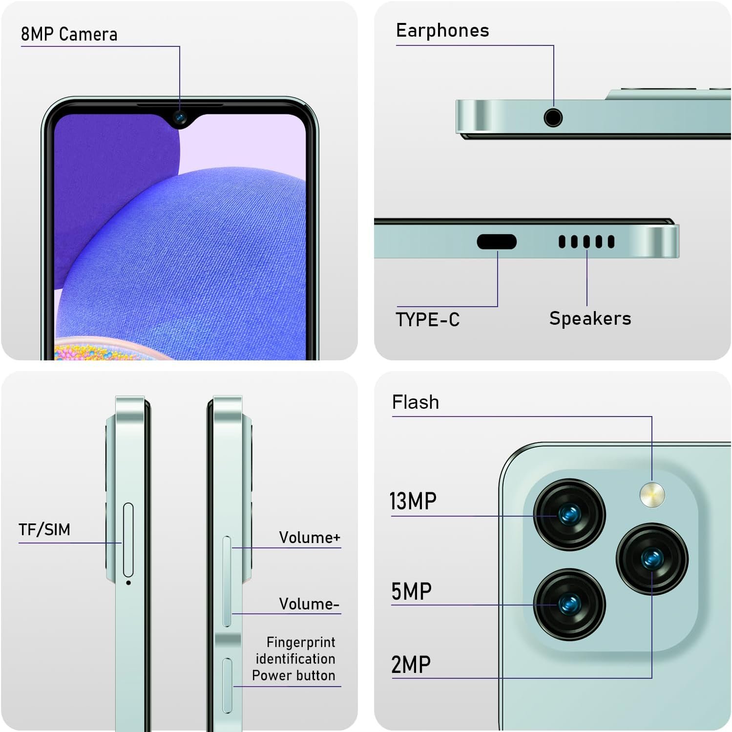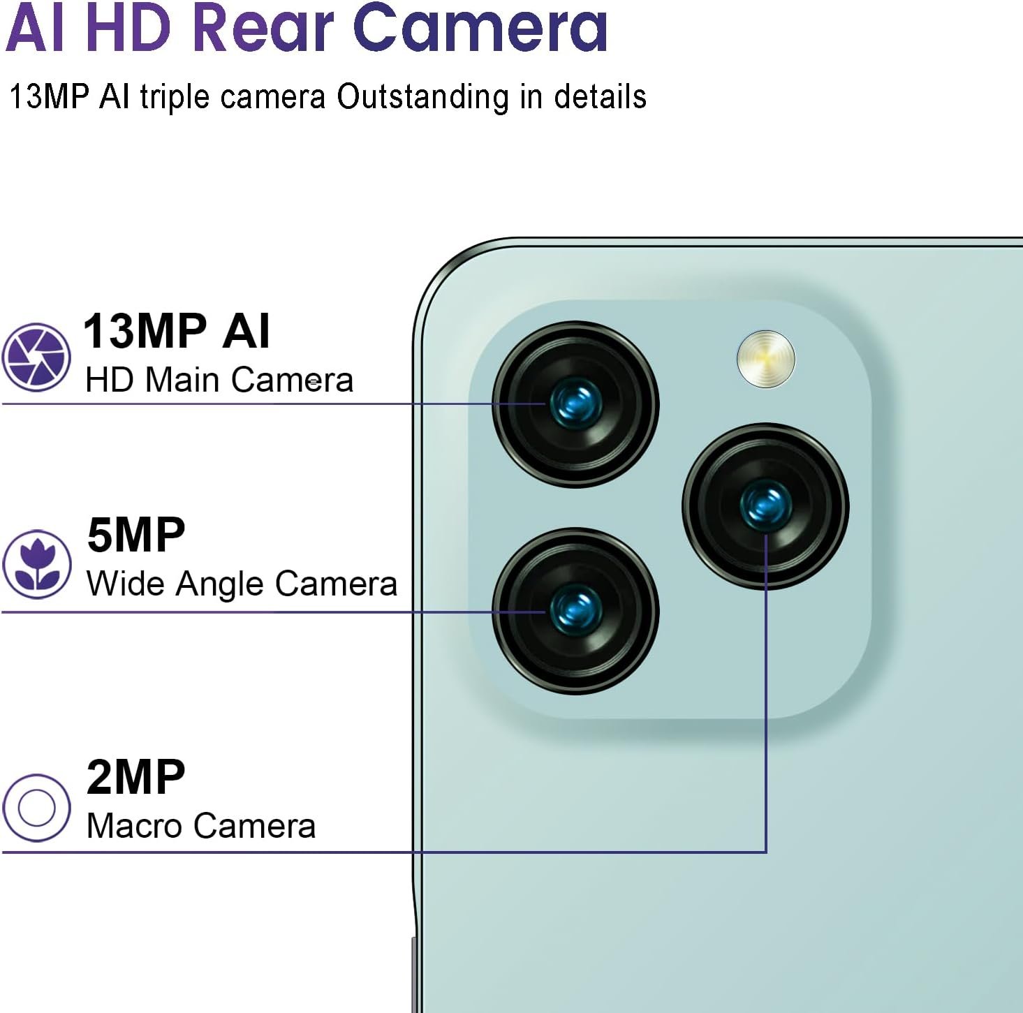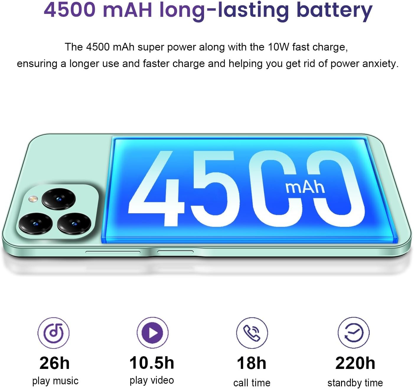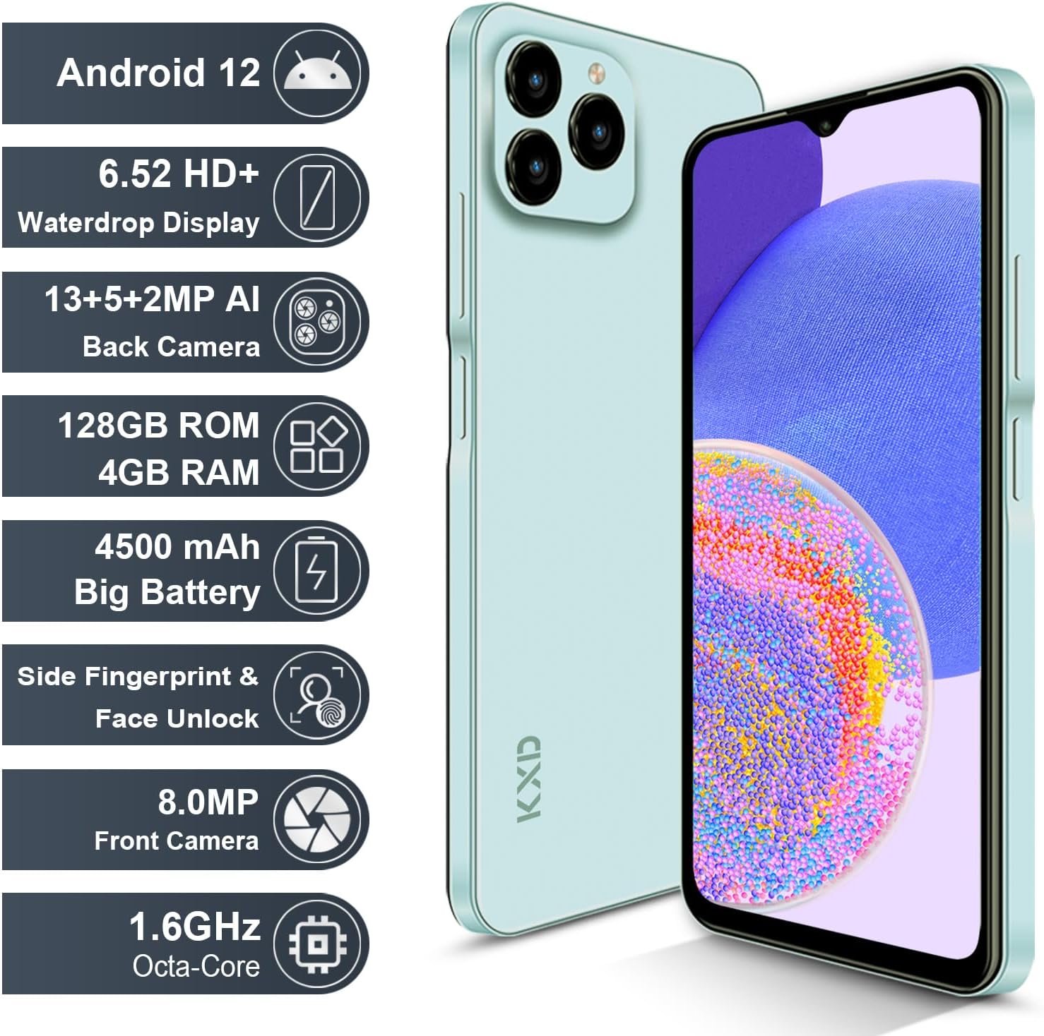 【13MP & 8MP Dual Camera + 4500 mAh battery】The KXD A07 smartphone comes with dual 13MP and 8MP cameras, with a front camera for even more beautiful selfies. The A07 Equipped with a 4500 mAh battery, it has a large battery capacity for longer standby time, read messages, watch videos, use GPS and play games.
