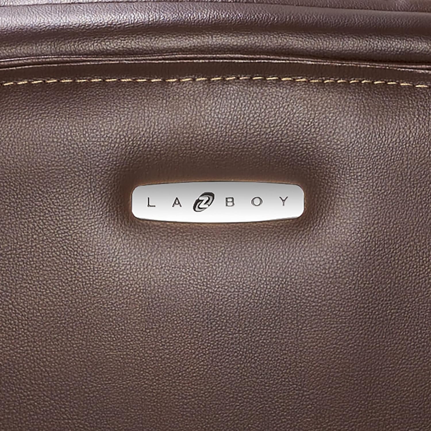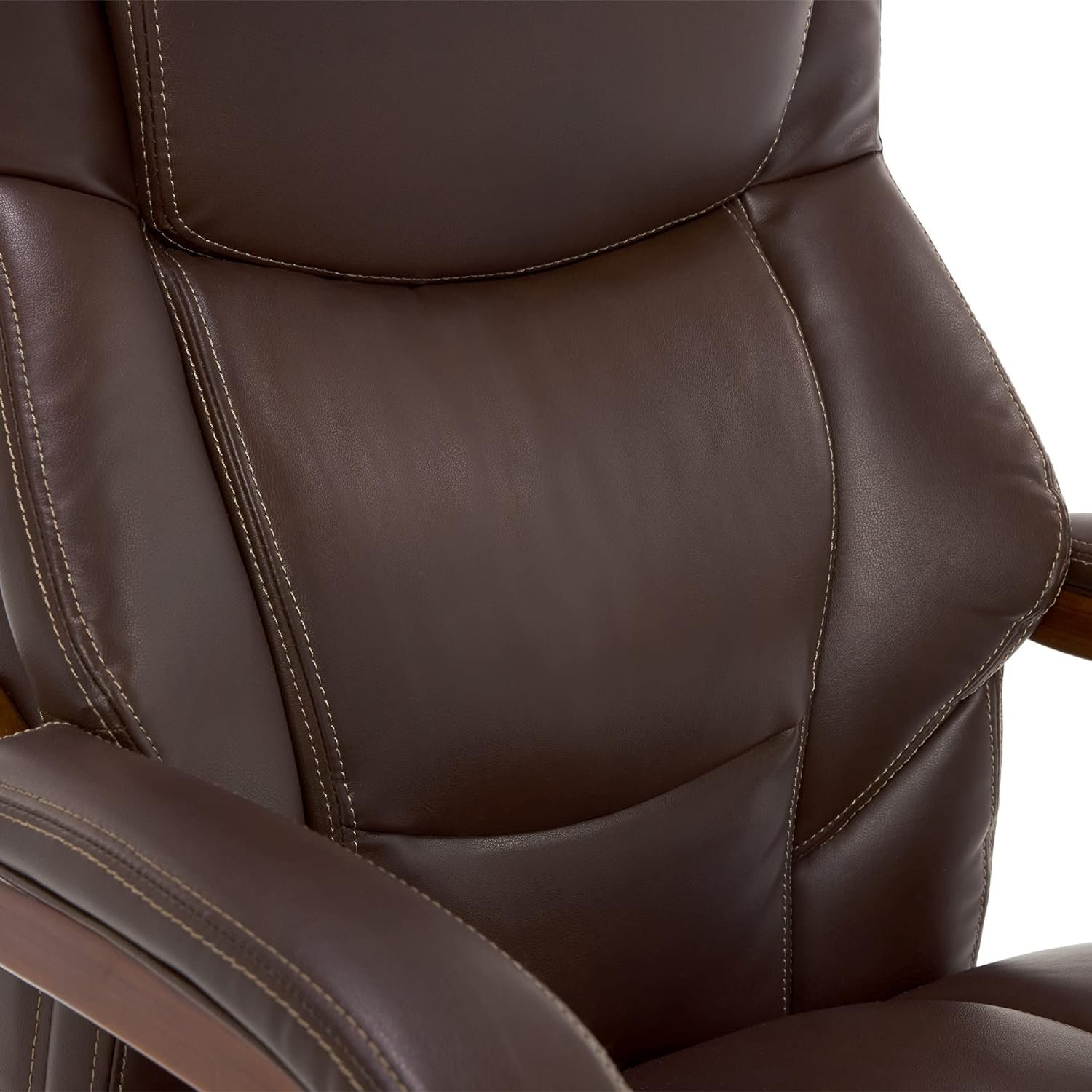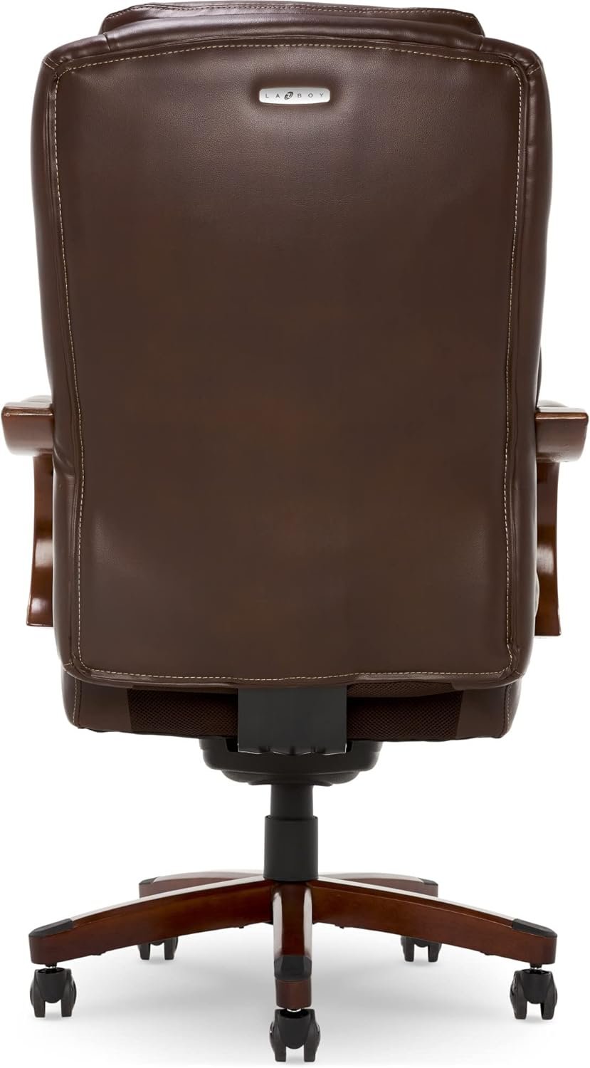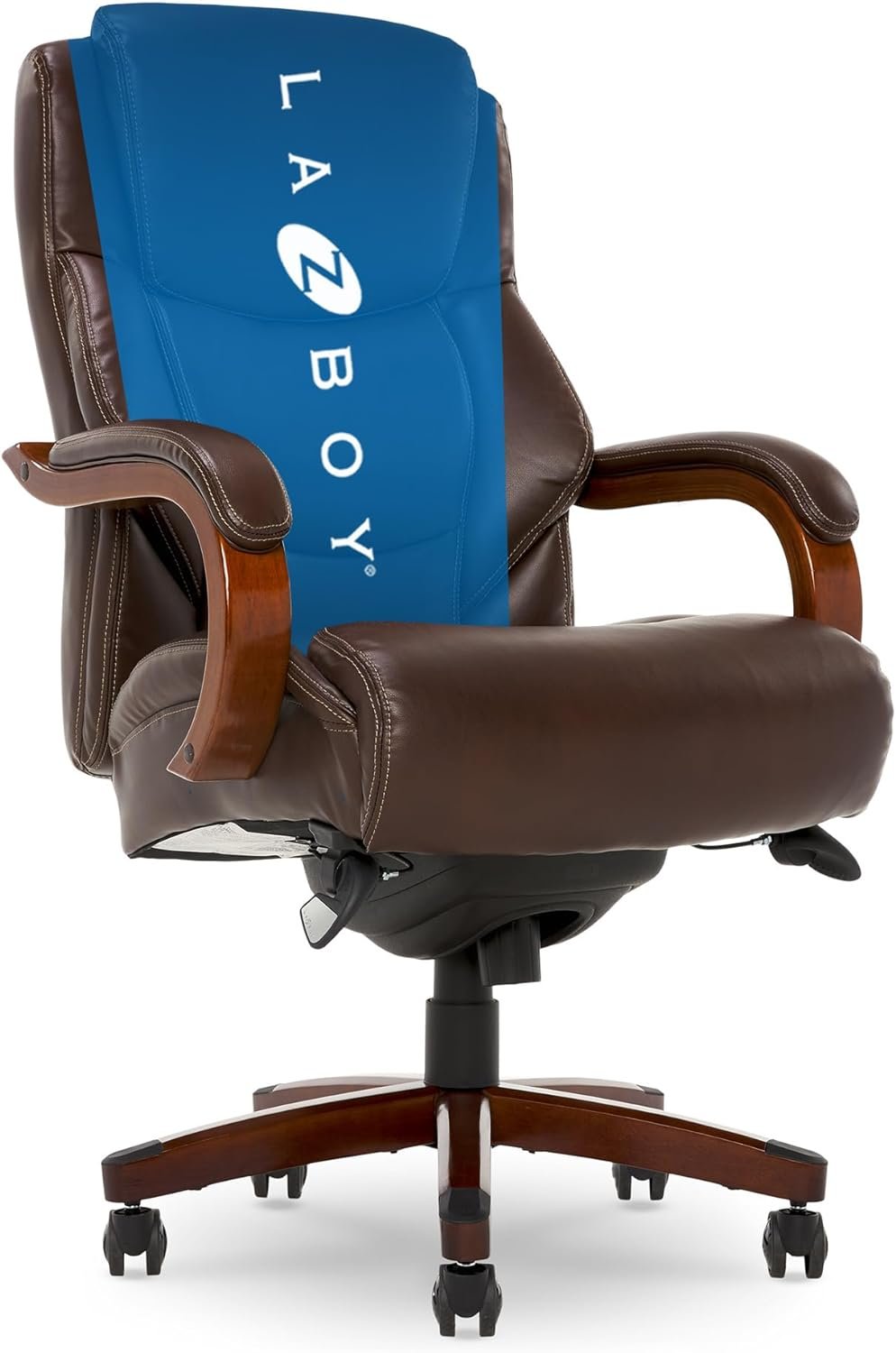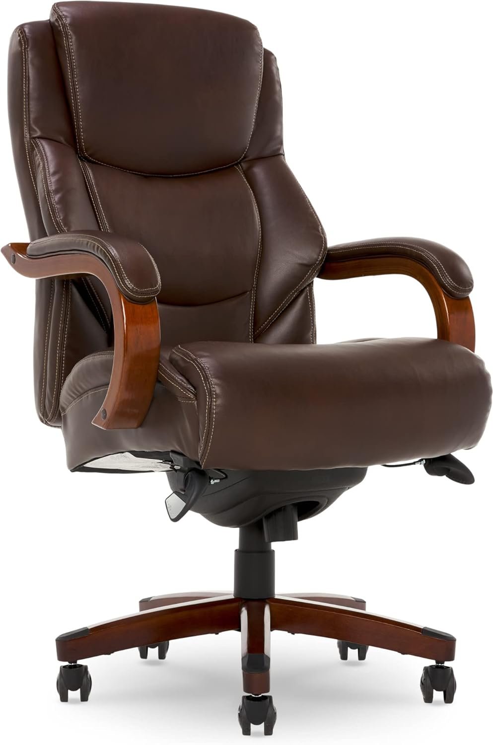 Bring premium comfort and support to your home or office with the La-Z-Boy Delano Big & Tall Executive Office Chair. Upholstered in soft bonded chestnut brown leather with hand-sculpted real wood arms and base, this swivel chair offers an elegant blend of traditional style and modern performance that enhance any office, home, or entertainment space. A big and tall design ensures you have ample room at your desk, while a contoured back lumbar panel and advanced memory foam cushion layering system deliver comfort and support in the areas you need it most. Ergonomic and adjustable, this high back office chair allows you to control the height, tilt, and lift to suit your sitting position, providing optimized body alignment to ensure you remain comfortable and properly supported while sitting for long periods.