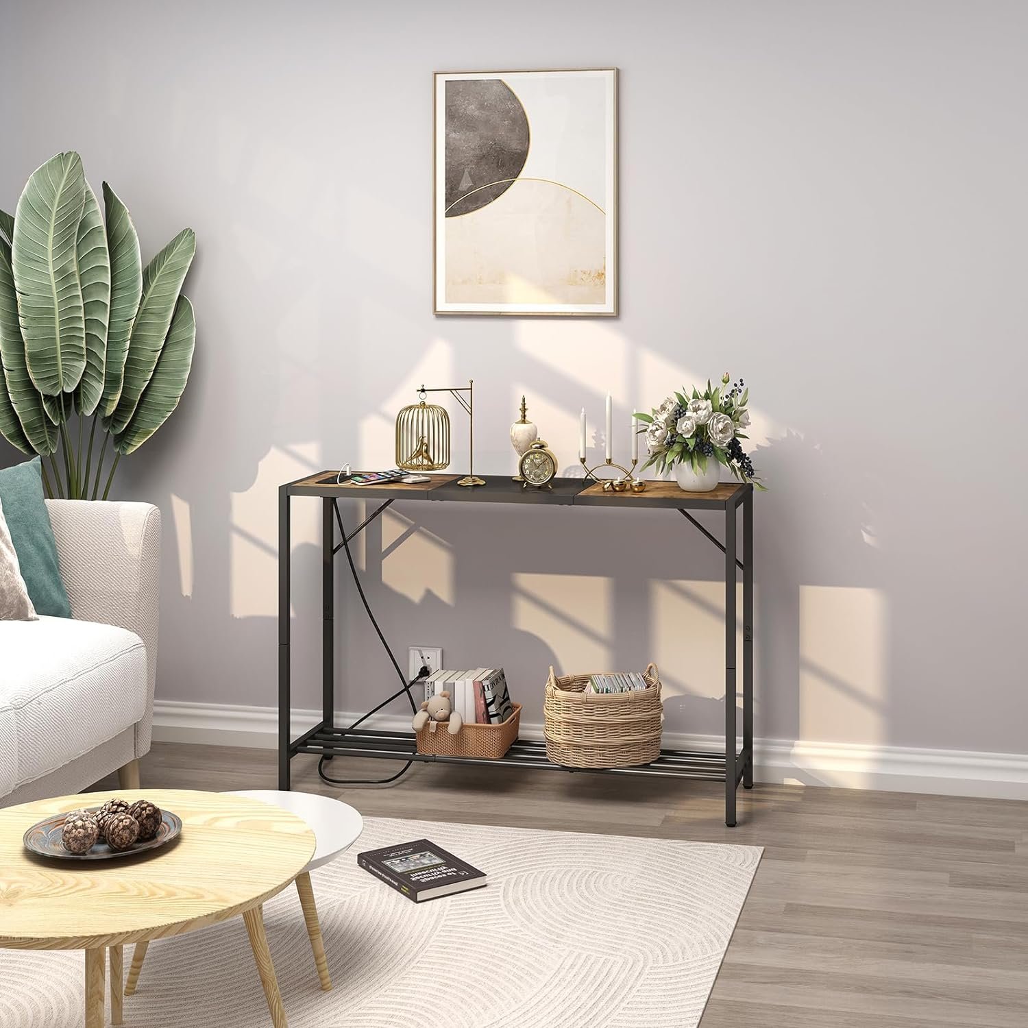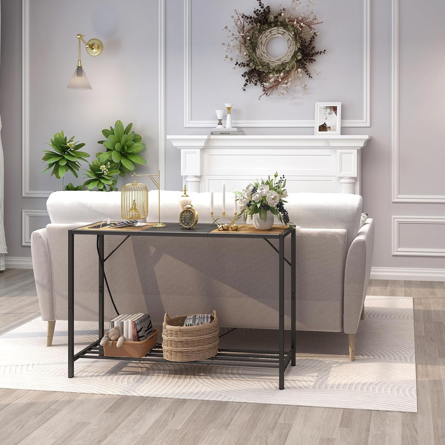 Console Table with Charging Station: This console table features 3 power outlets and 2 USB ports on the table top , meet your daily charging needs for lamp, mobile phone ,ipad, laptop or other
