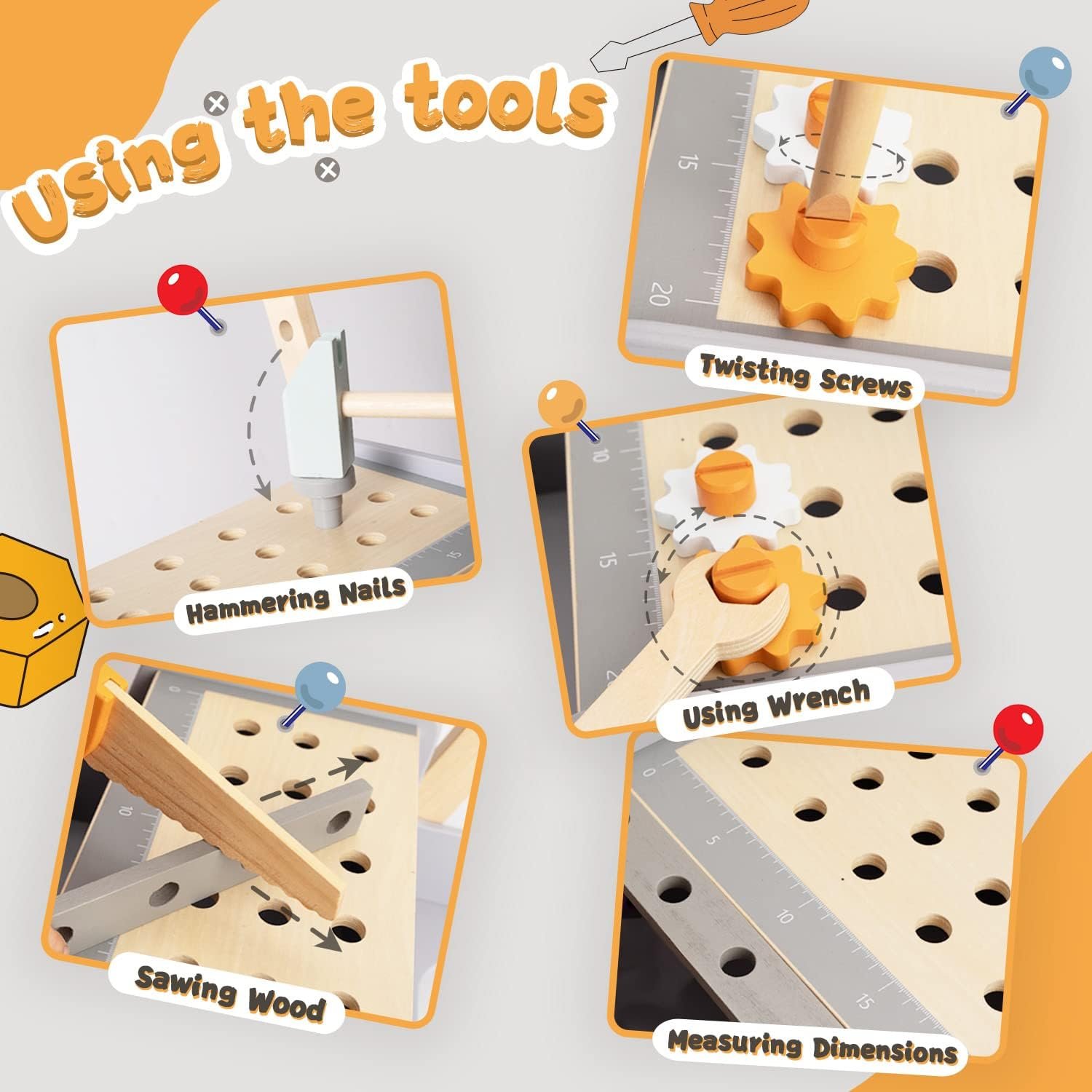 🛠Toddler tool table: This trolley comes with an abundance of tools and accessories, hammers, spanners, saws, screwdrivers, nuts, bolts and more, so children can use all the pieces to build a variety of models such as scales, windmills, helicopters, planes, racing cars and many more creative shapes. This encourages the imagination of the young builders and improves their manual dexterity and problem solving skills.
