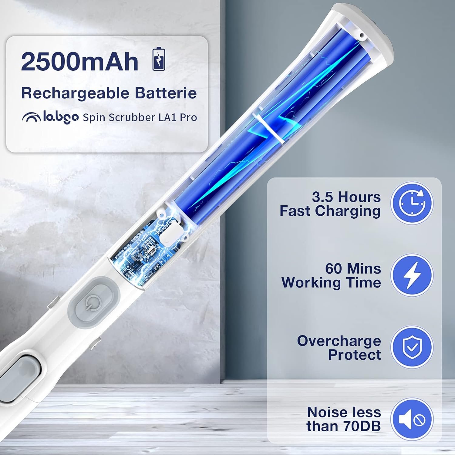 Rechargeable, Portable, Low Noise: The LABIGO Shower Cleaning Brush only requires a quick charge of 3.5 hours to work continuously for about 90 minutes. This electric bathroom brush eliminates the hassle of long cords, allowing you to conveniently clean every corner of the room. Additionally, the noise level is below 70db.