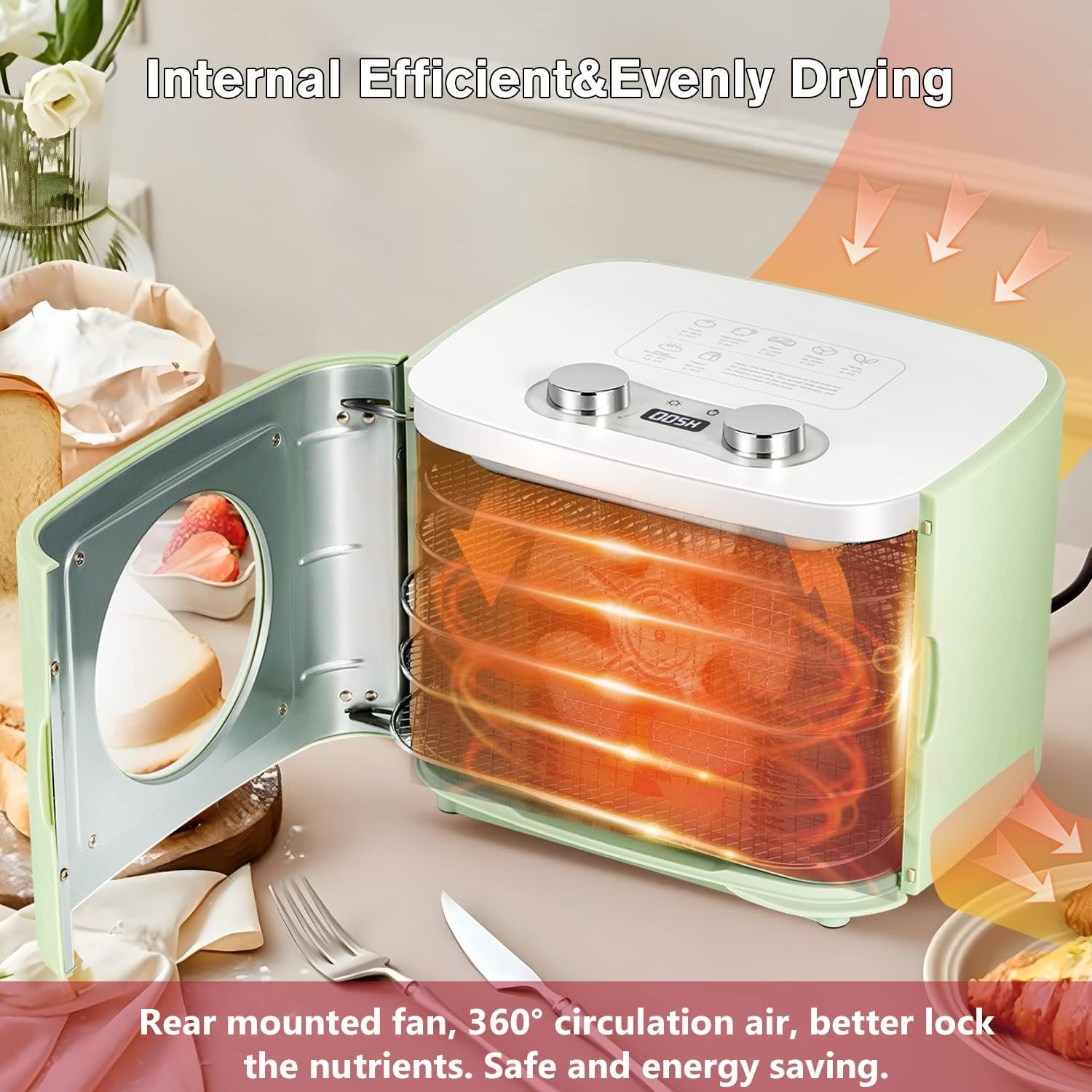 Efficient&Uniform Heating – 360°air circulation improves drying speed and locks food nutrients. Monitor dryness through the visual window. The rear fan will stop automatically when heat dissipates.