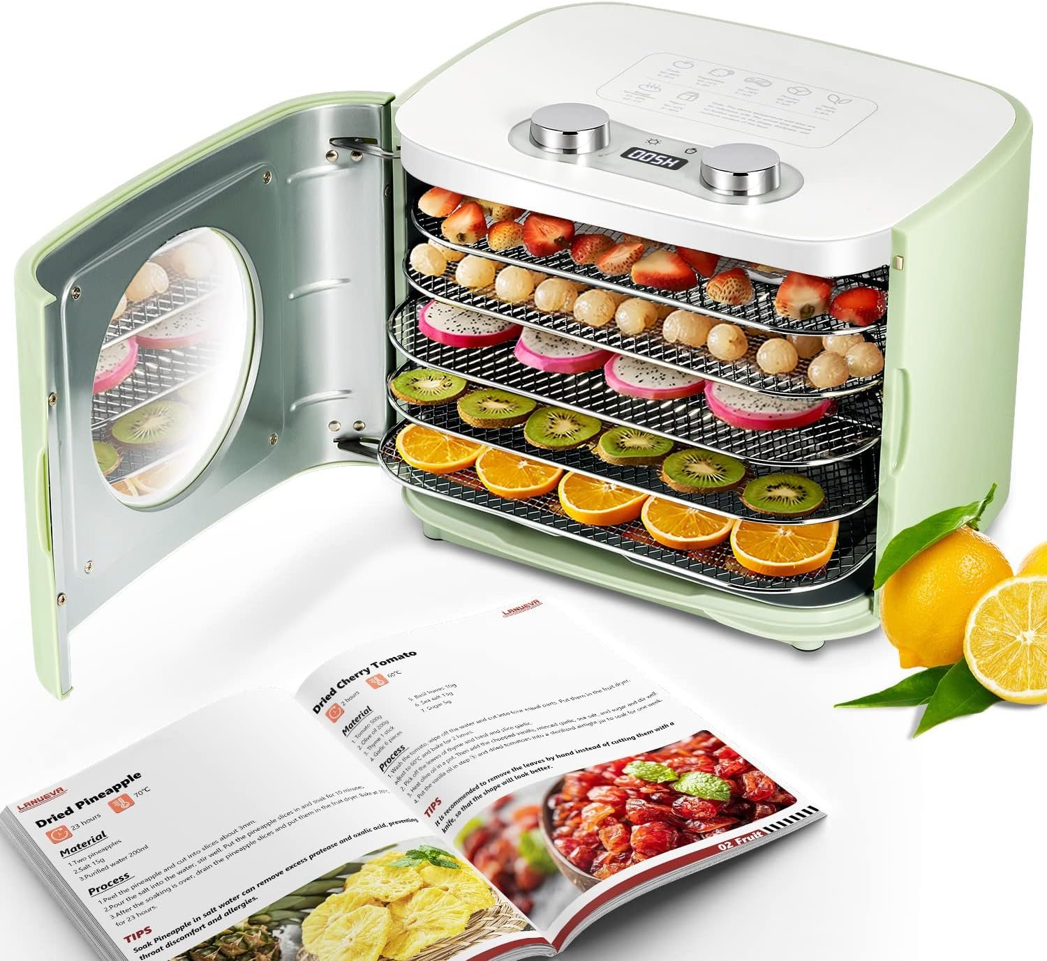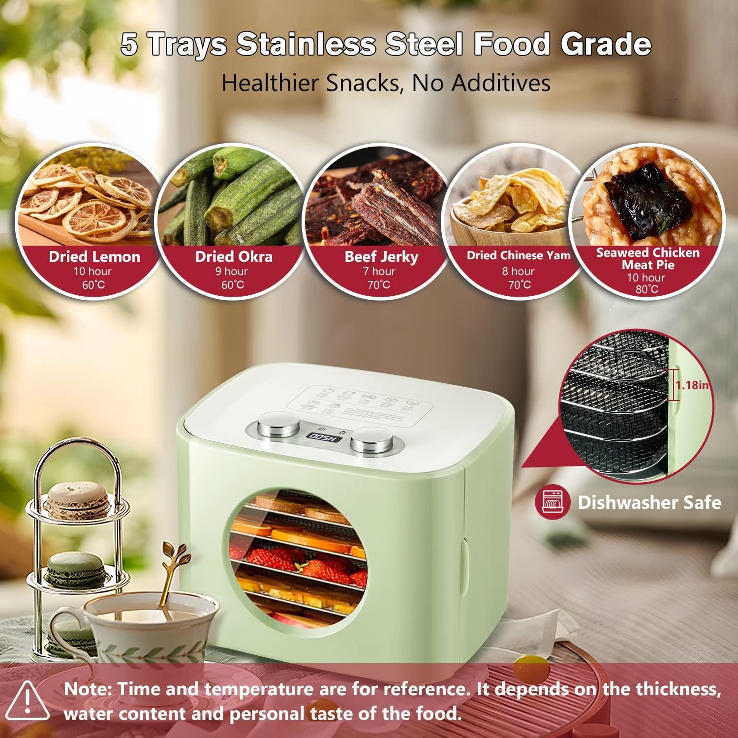 Cleaning&Storage – 5 stainless steel trays and the drip tray of the dehydrator are removable, dishwasher-safe. Wipe the inner wall with a damp rag or non-abrasive sponge, store in the ventilated place after drying.