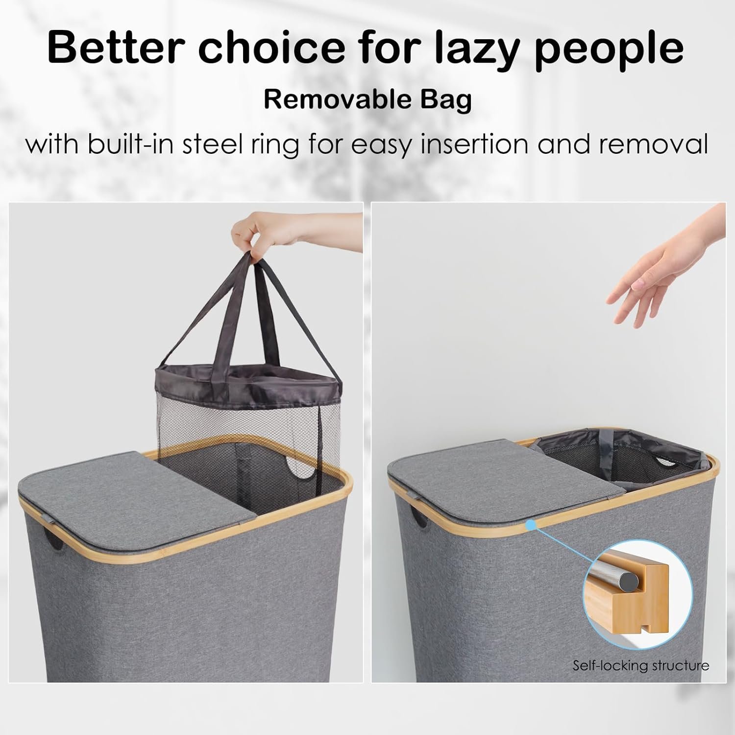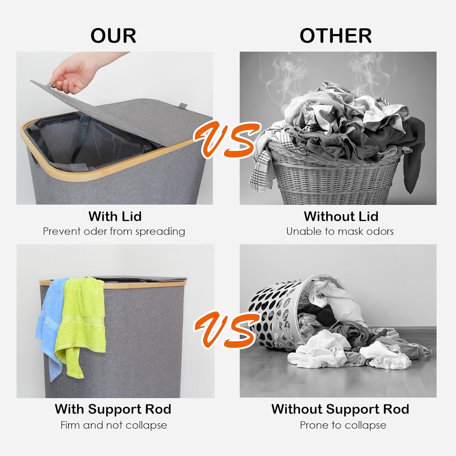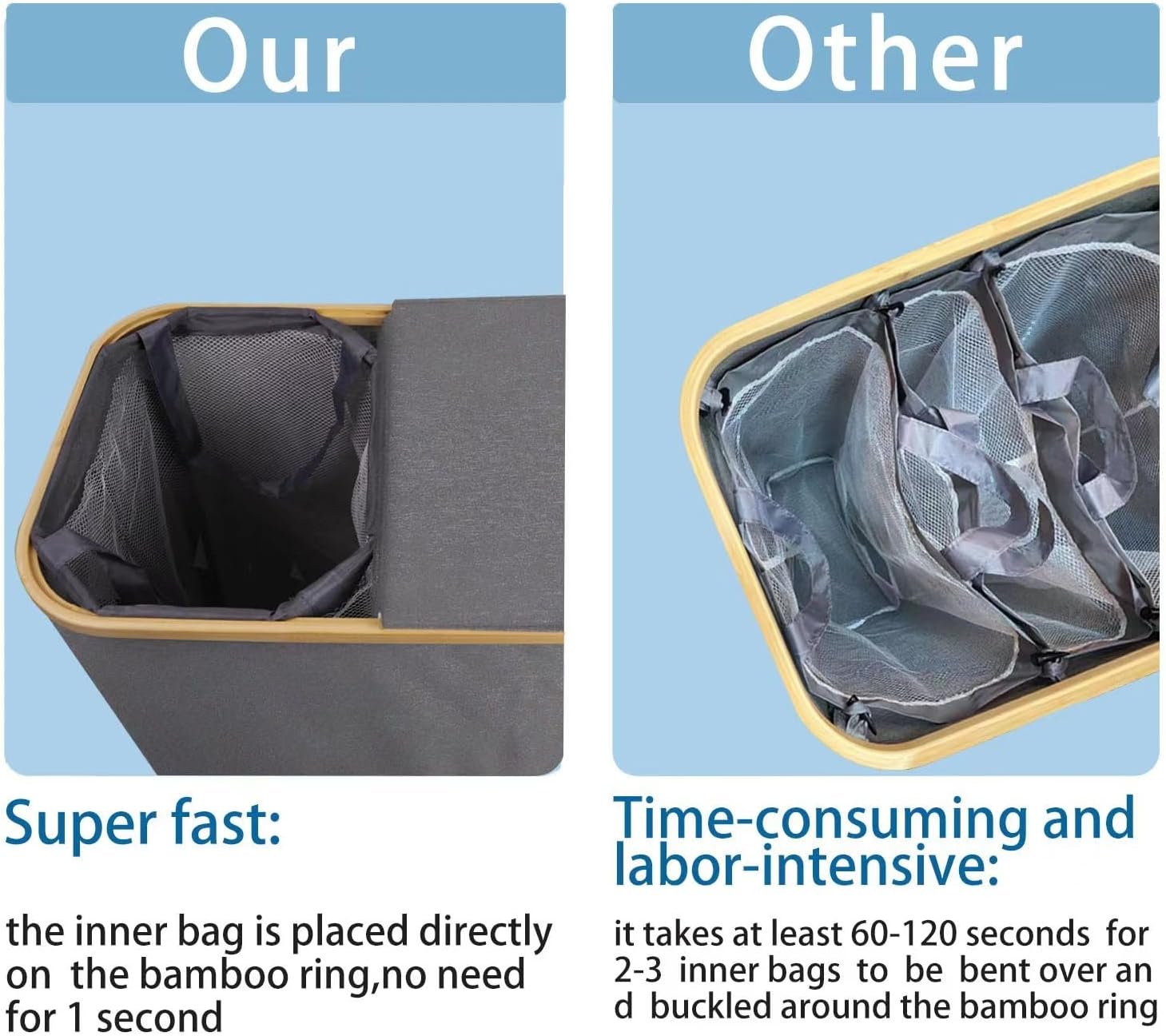 【Innovative Removable Inner Bag 】: 160L large laundry basket with 2 inner bags, which are equipped with steel rings. The 2 inner pockets can be picked up and put into the laundry hamper directly without additional buttons or Velcro. Even with just one hand, it can be firmly fixed on the bamboo handles without falling off.