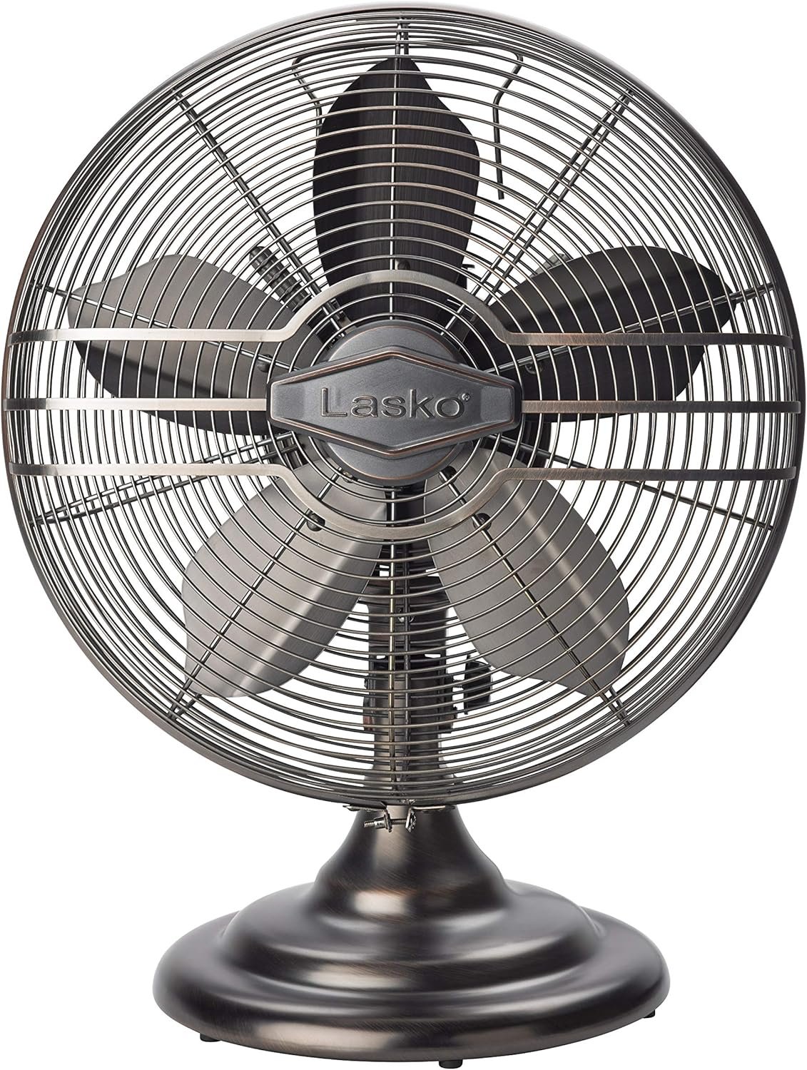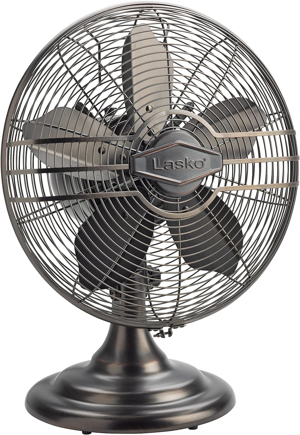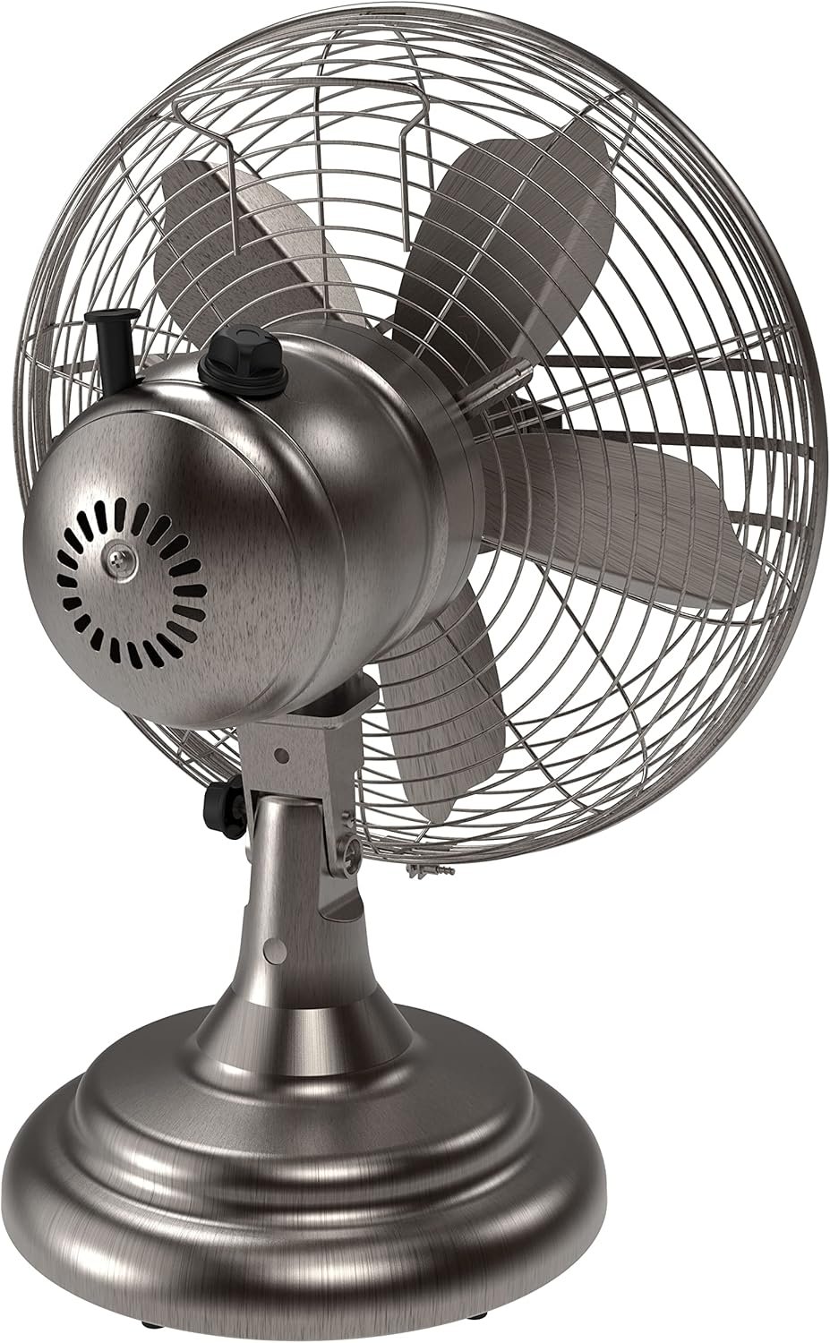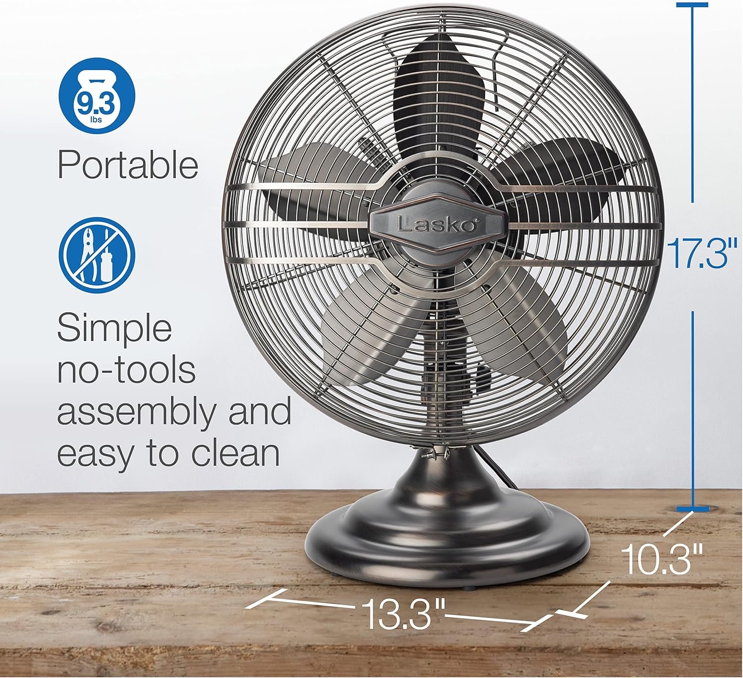 All-metal, vintage design – A beautiful, retro-style table fan (at 17.25 x 13.25 x 10.25 inches) that fits perfectly on your desk at work, a bedside table, or on a countertop; Weighs 9.32 pounds, so it feels sturdy and durable High quality construction –Outer body is made of all metal with a gorgeous oil-rubbed bronze finish; Includes a built-in carry handle