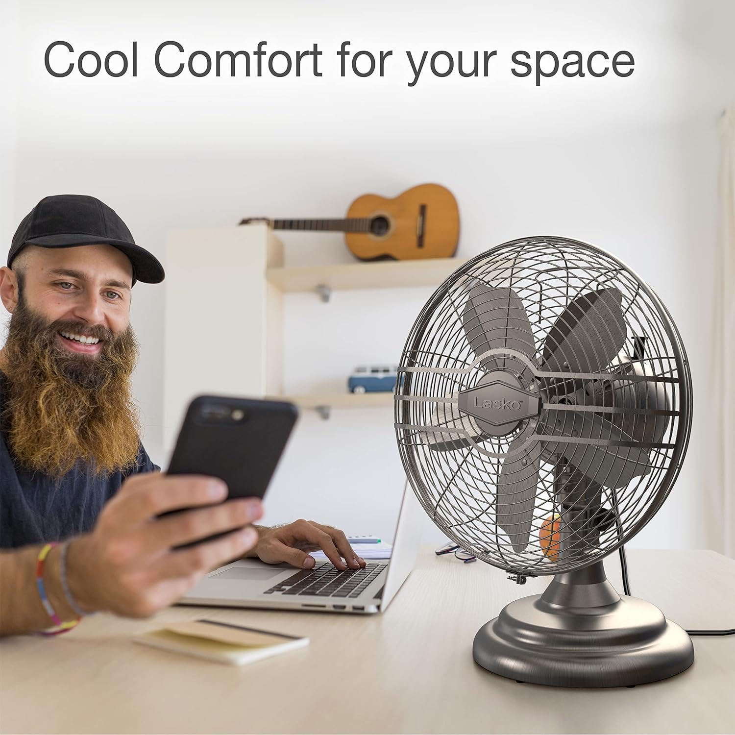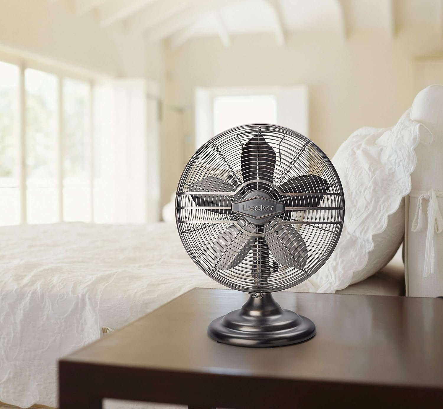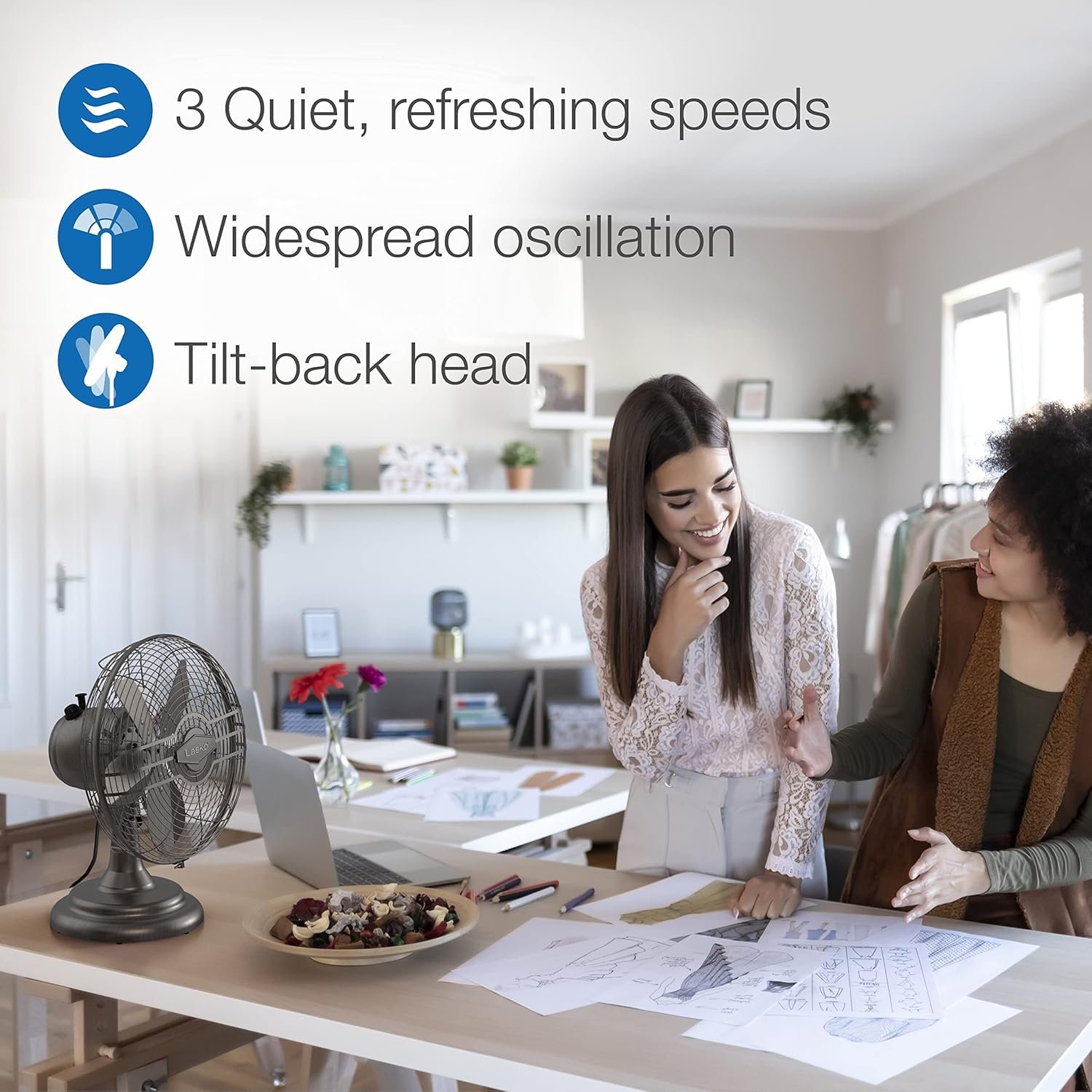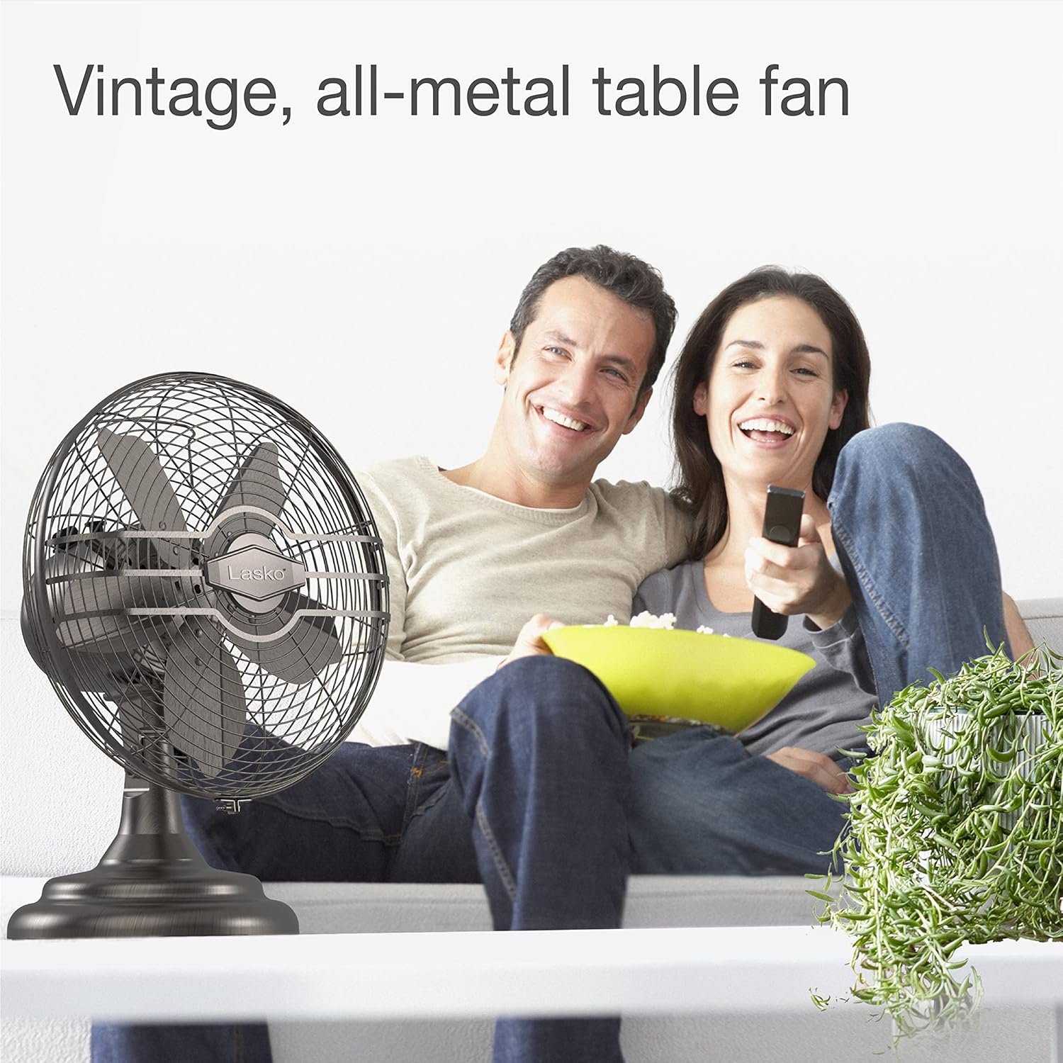 All-metal, vintage design – A beautiful, retro-style table fan (at 17.25 x 13.25 x 10.25 inches) that fits perfectly on your desk at work, a bedside table, or on a countertop; Weighs 9.32 pounds, so it feels sturdy and durable High quality construction –Outer body is made of all metal with a gorgeous oil-rubbed bronze finish; Includes a built-in carry handle