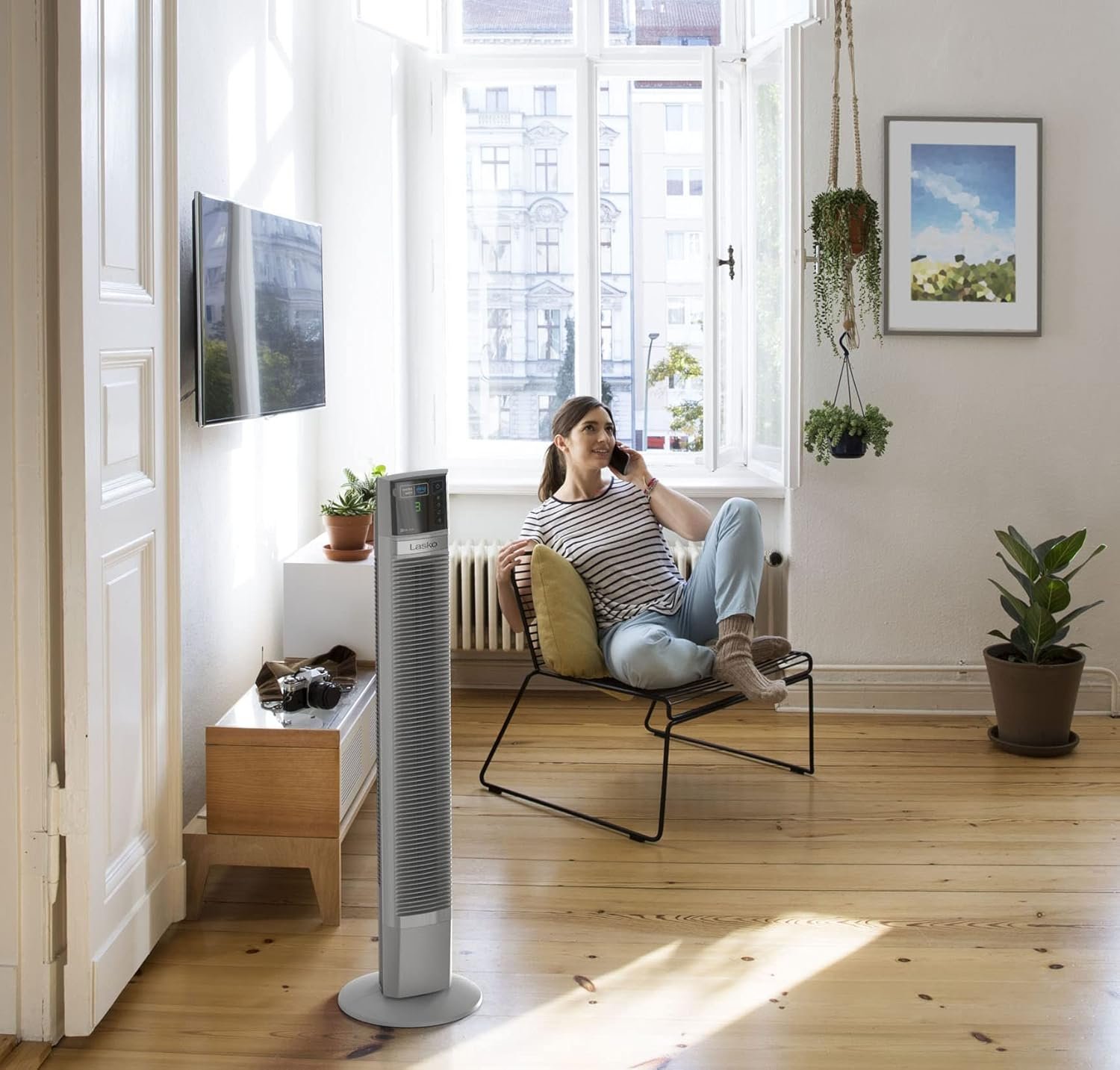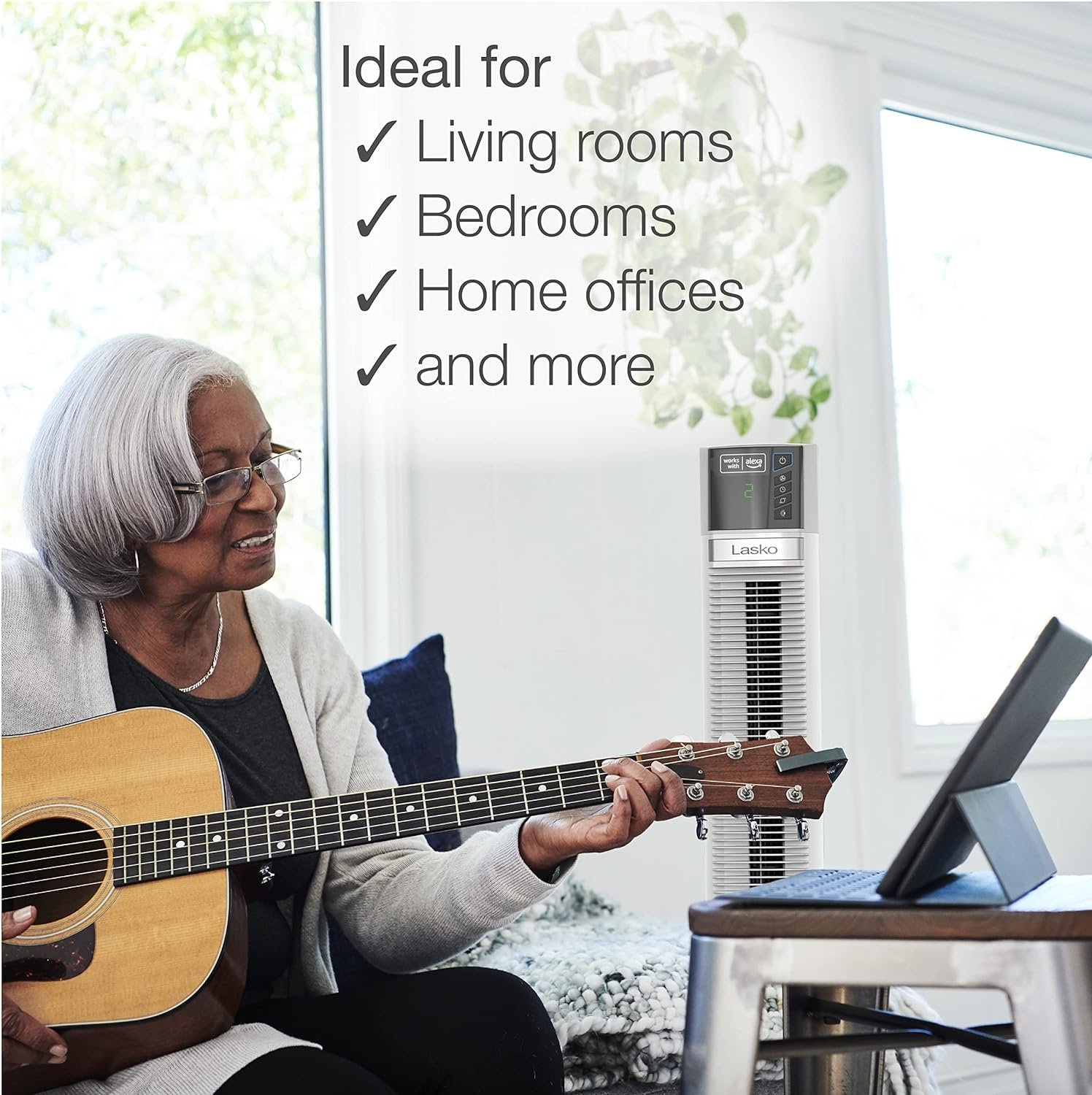 “Hey Alexa, turn on my Lasko Voice Connect fan”. Remote controls are a thing of the past with the new Lasko 48” Tower Fan. Now you can control your fan with your Alexa device or use the Alexa app on your smart phone or tablet. Frustration Free Set up certification means connecting to your Alexa is a breeze! The slim, space-saving design of this tower fan makes it perfect for living areas, bedrooms, home offices, and more. The tall profile sends breezes above furniture for total room comfort. Features include simple front-facing electronic controls, 4 quiet fan speeds, an 8-hour auto-off timer and optional widespread oscillation for full-room coverage. The Nighttime setting automatically decreases fan speed and dims control lights for overnight use. Features the Lasko Blue Plug, trusted safety fuse technology. Simple, no-tools assembly is required.