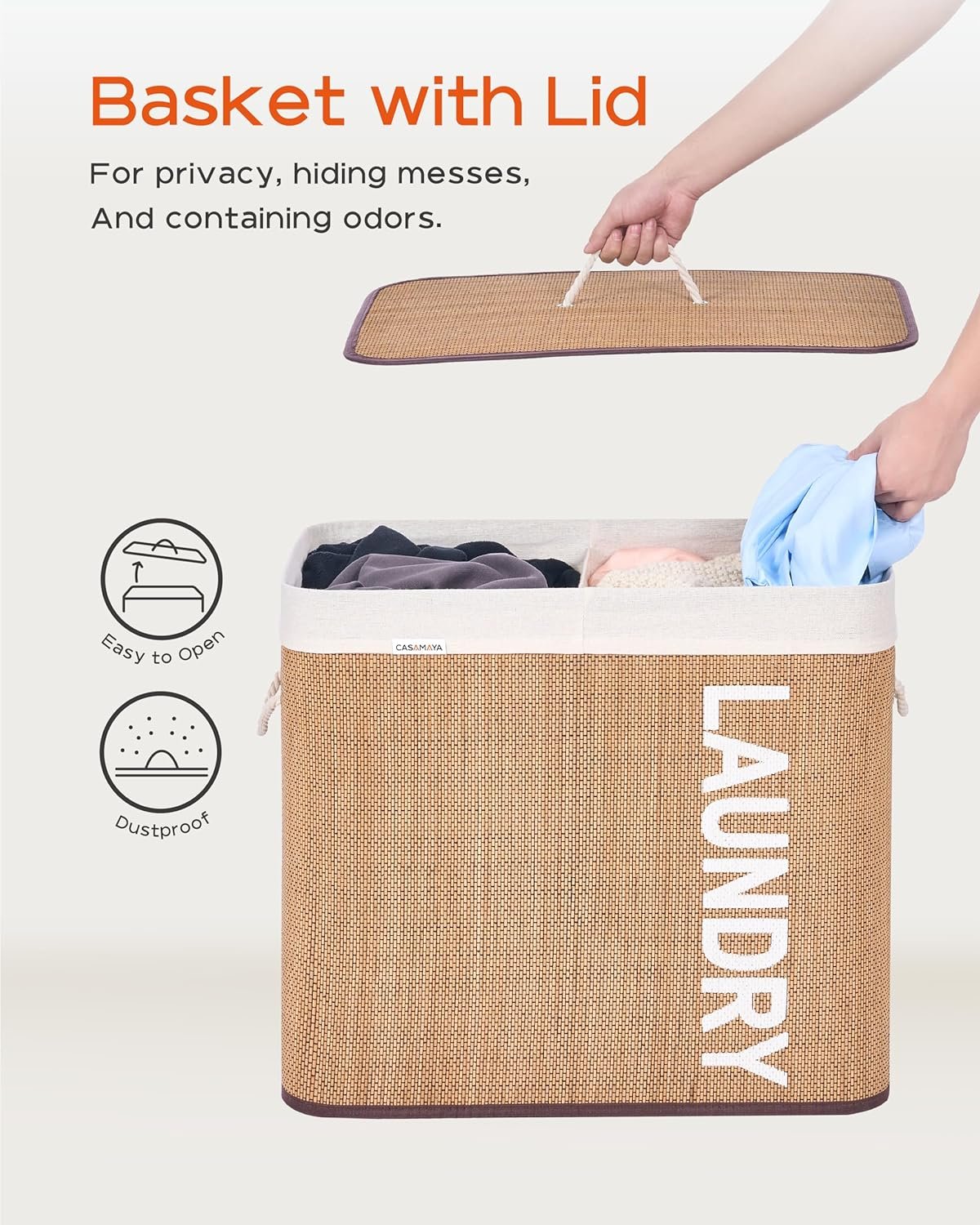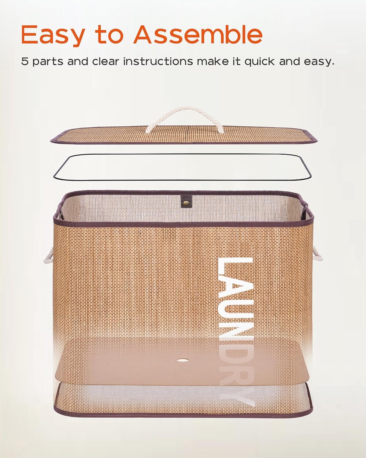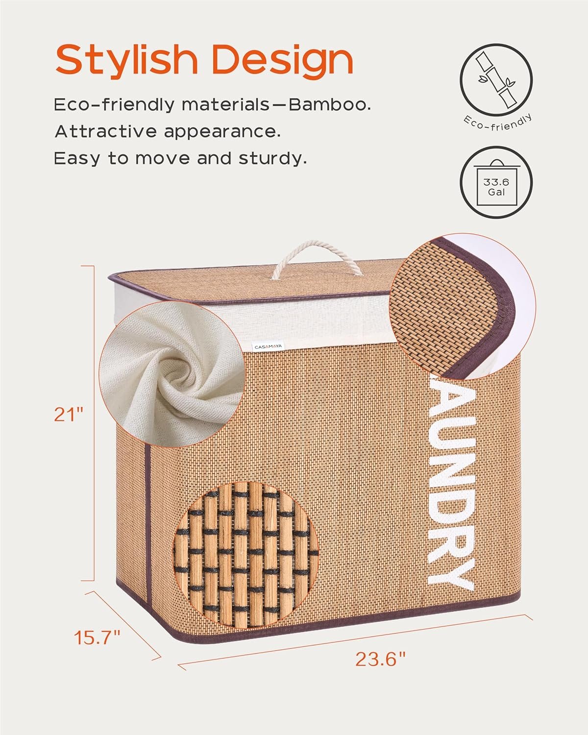 Elegant appearance: The unique weaving process looks elegant and striking.Natural bamboo: Breathable and easy to clean.Laundry hamper with lid: It can hide your clothes and prevent the odor from wafting out.Clothes hamper with handles: Easily move the laundry hamper with the cotton handles.Removable and washable liner: You can easily remove the liner and wash it in the washer.Easy to install: Only three steps to install the hamper, and five minutes to get it done.Foldable: Fold up the laundry hamper for convenient storage when you don’t use it.Ideal Size: It fits perfectly in small spaces and is roomy for your laundry.Versatile: Use it in the laundry room, bedroom, or dressing room.