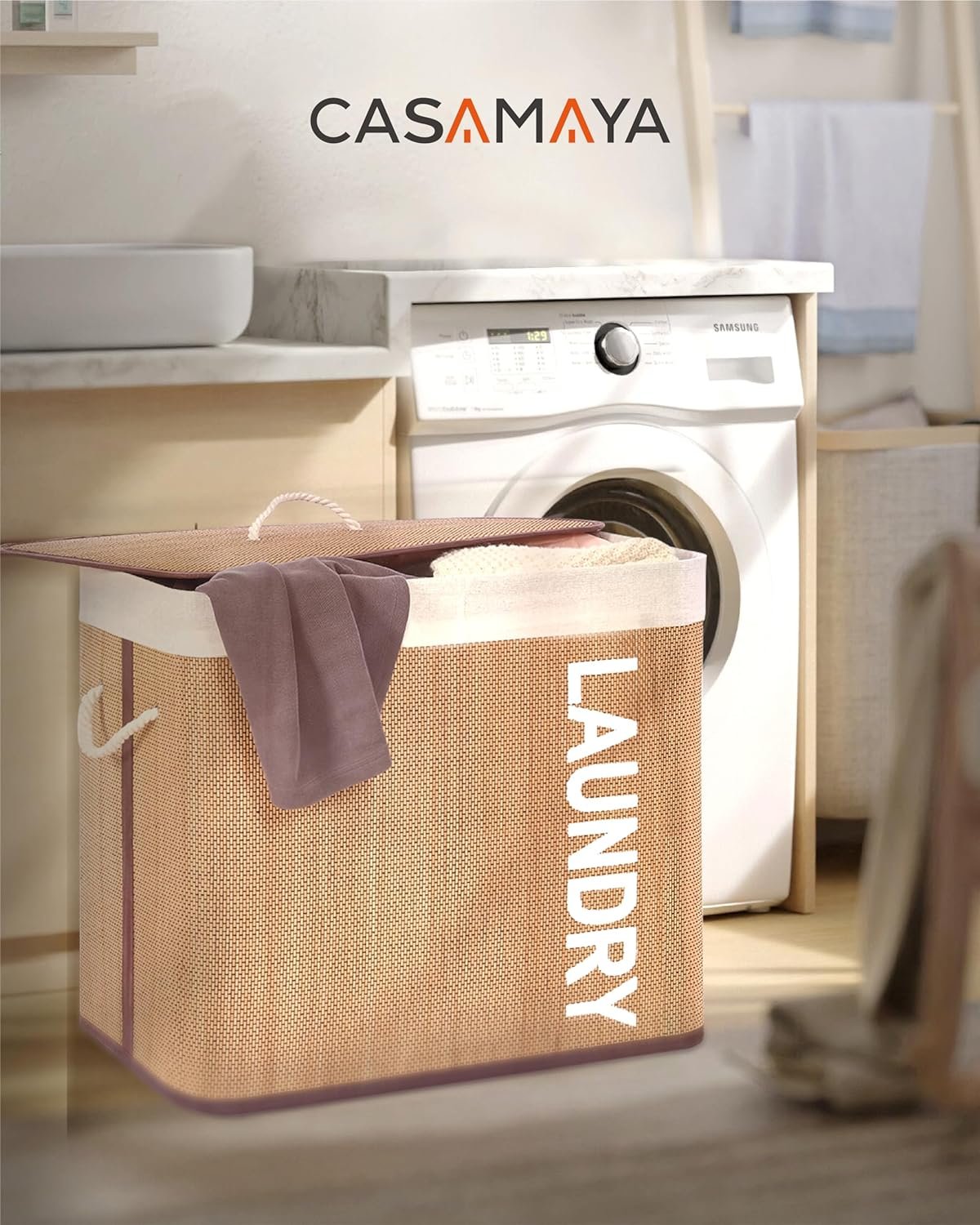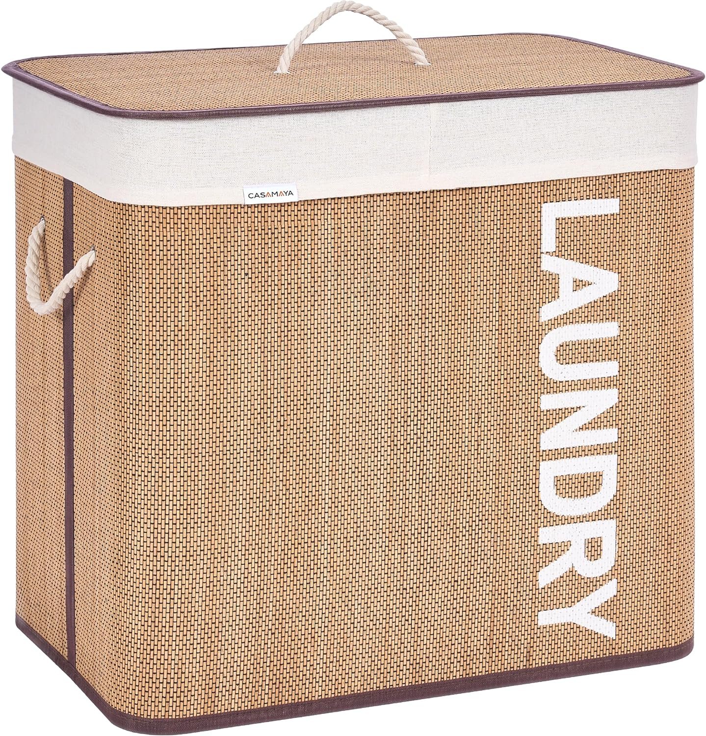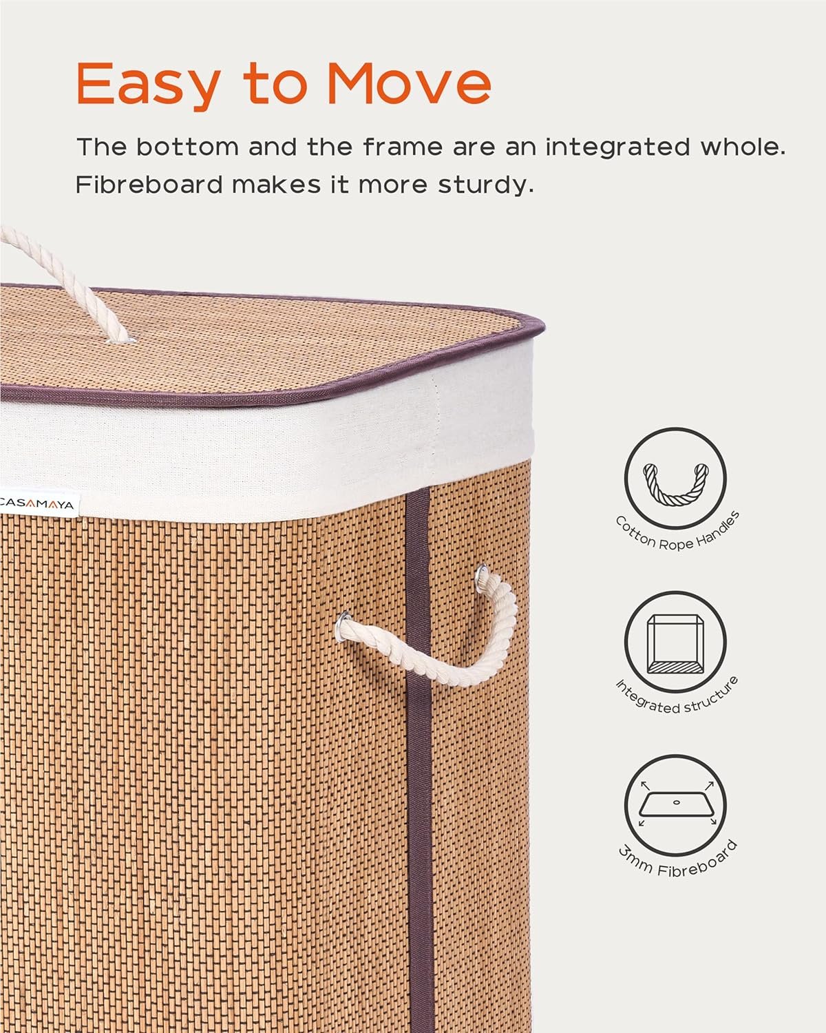 Elegant appearance: The unique weaving process looks elegant and striking.Natural bamboo: Breathable and easy to clean.Laundry hamper with lid: It can hide your clothes and prevent the odor from wafting out.Clothes hamper with handles: Easily move the laundry hamper with the cotton handles.Removable and washable liner: You can easily remove the liner and wash it in the washer.Easy to install: Only three steps to install the hamper, and five minutes to get it done.Foldable: Fold up the laundry hamper for convenient storage when you don’t use it.Ideal Size: It fits perfectly in small spaces and is roomy for your laundry.Versatile: Use it in the laundry room, bedroom, or dressing room.