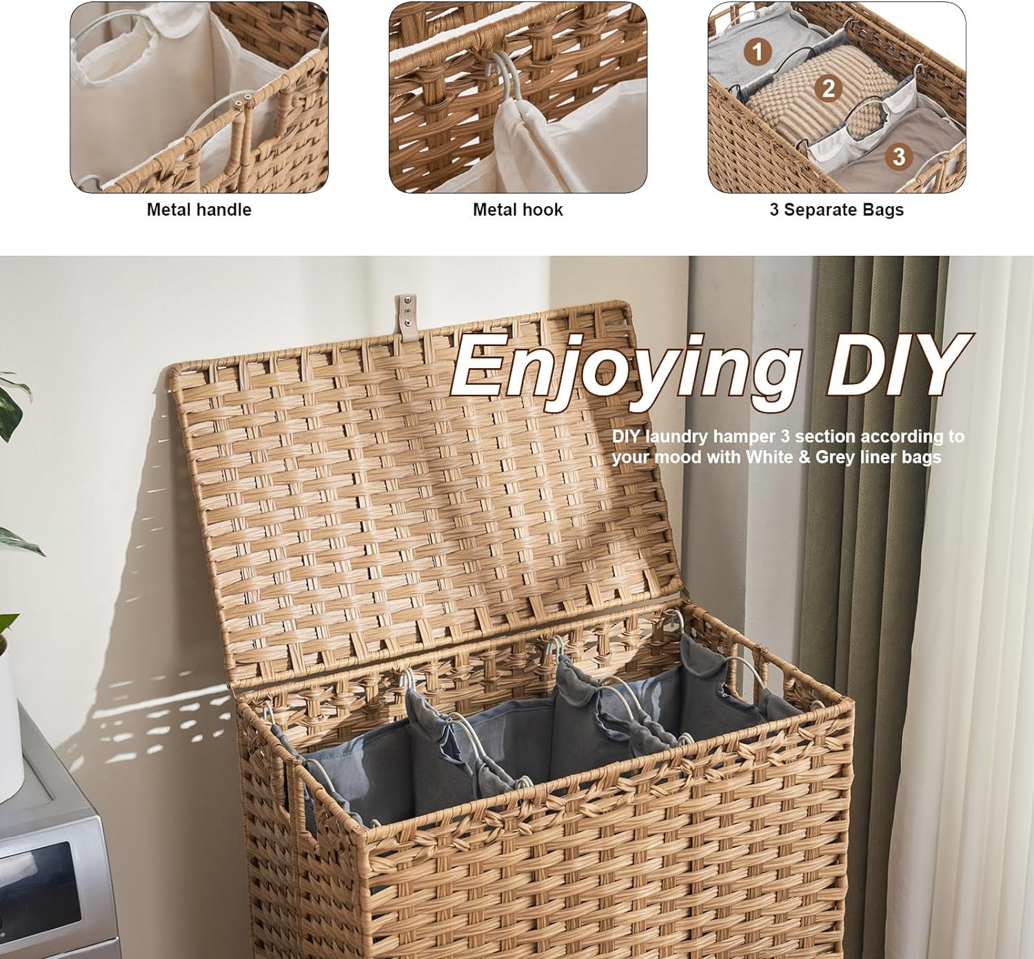 Enjoying DIY: We offerd White & Grey liner bags, you can DIY laundry hamper 3 section according to your mood, this helping clothes into light, dark and colored. Also you can choose which bag to wash first, instead of taking 3 heavy bags all at once