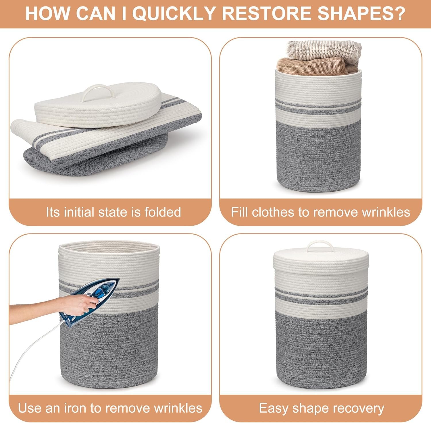 Note: The laundry basket is foldable for transportation. Filling it with clothes will help it regain its shape quickly. Iron is a great idea to remove the creases.